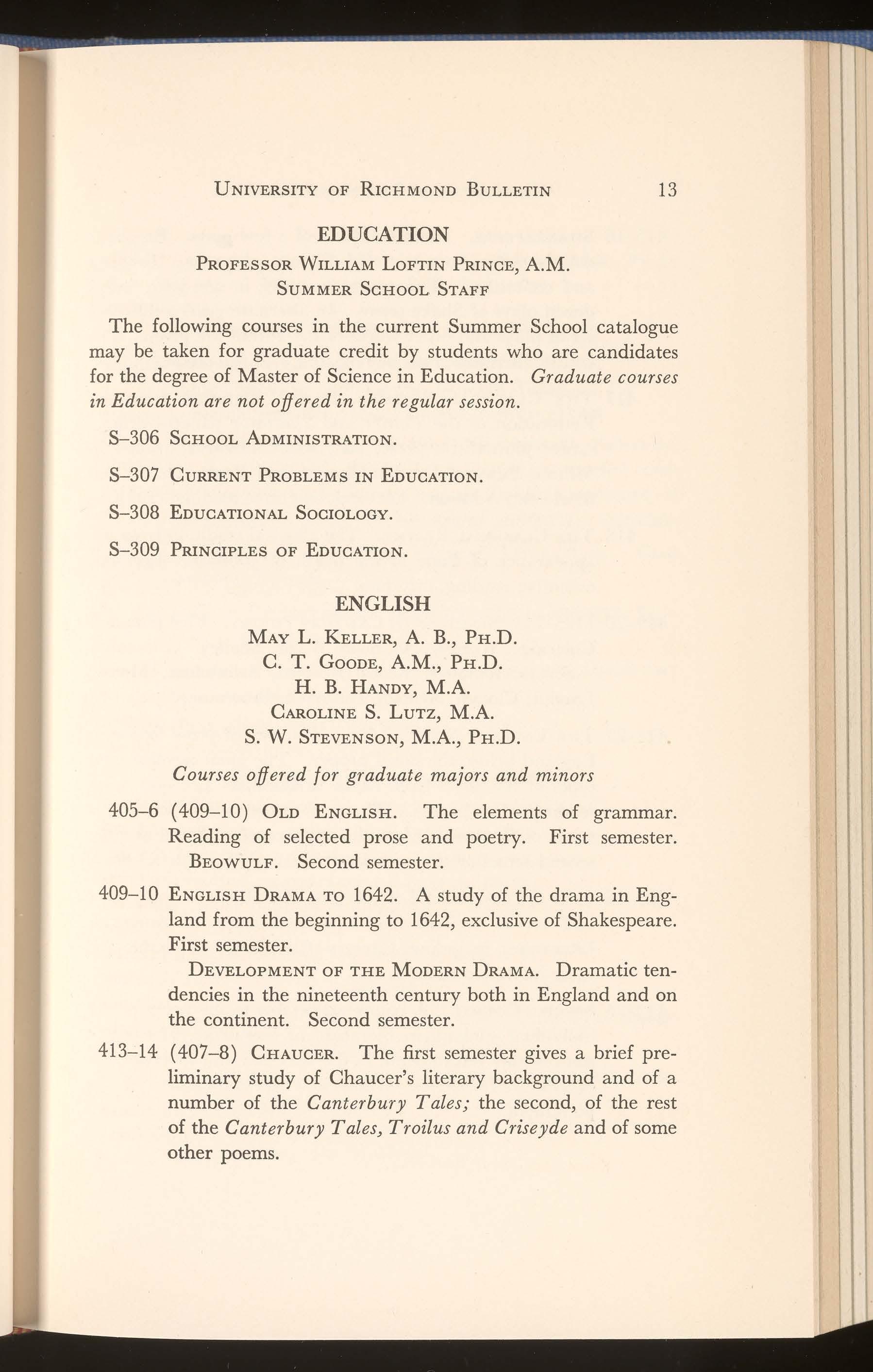 The following courses in the current Summer School catalogue may be taken for graduate credit by students who are candidates for the degree of Master of Science in Education. Graduate courses in Education are not offered in the regular session.
