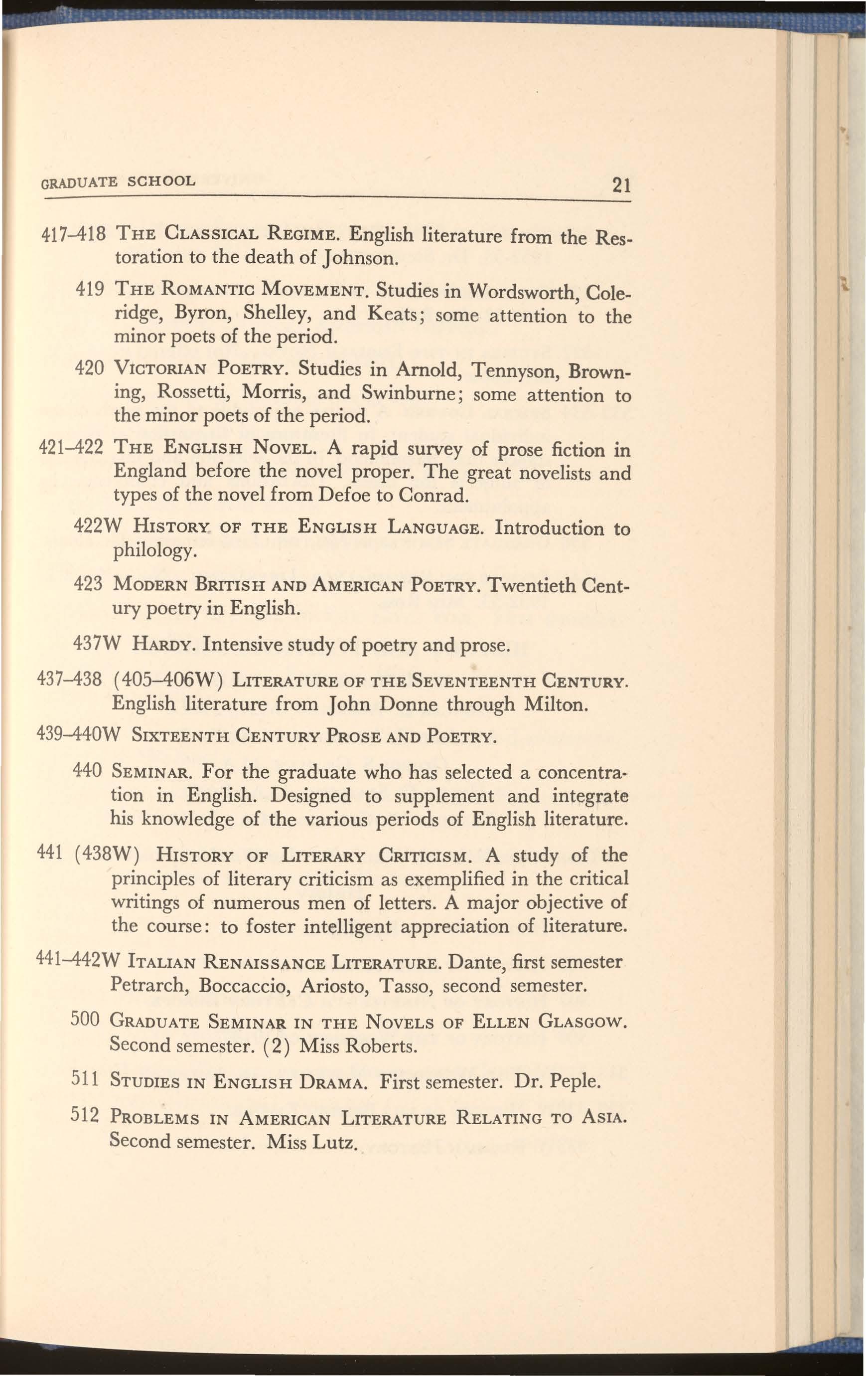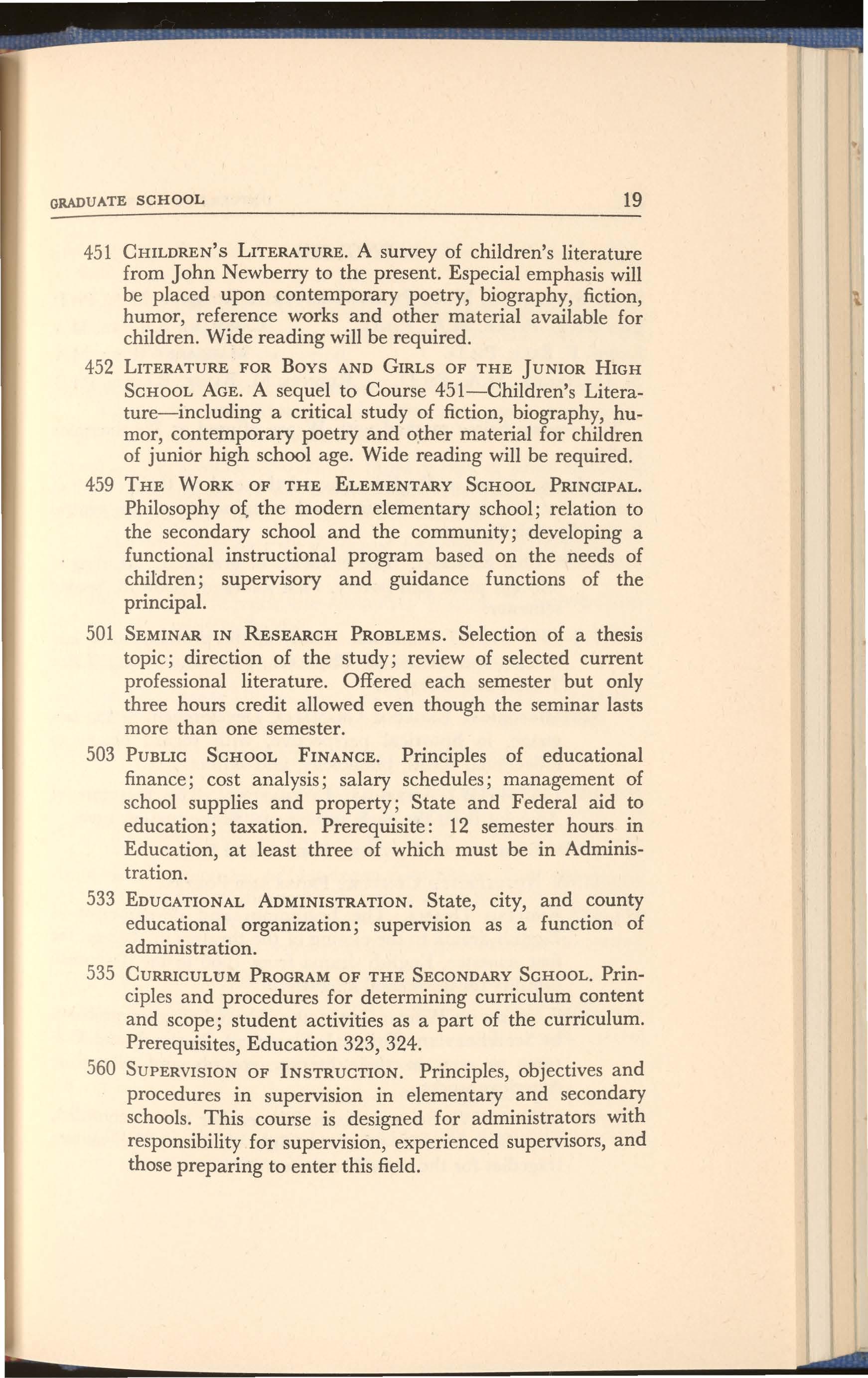 Courses numbered 300-399 are advanced courses open to both undergraduate and graduate students. Courses numbered 400-499 are also open to both undergraduates and graduates, but require additional work of a research nature for graduate students. Courses numbered 500 and above are for graduate students only. Candidates for the advanced degree must present at least 9 semester hours in courses numbered 500 and above, and 6 additional hours in courses numbered 400 and above. Unless the number of hours credit is listed in parentheses after the title of the course, the following courses carry 3 semester hours credit.