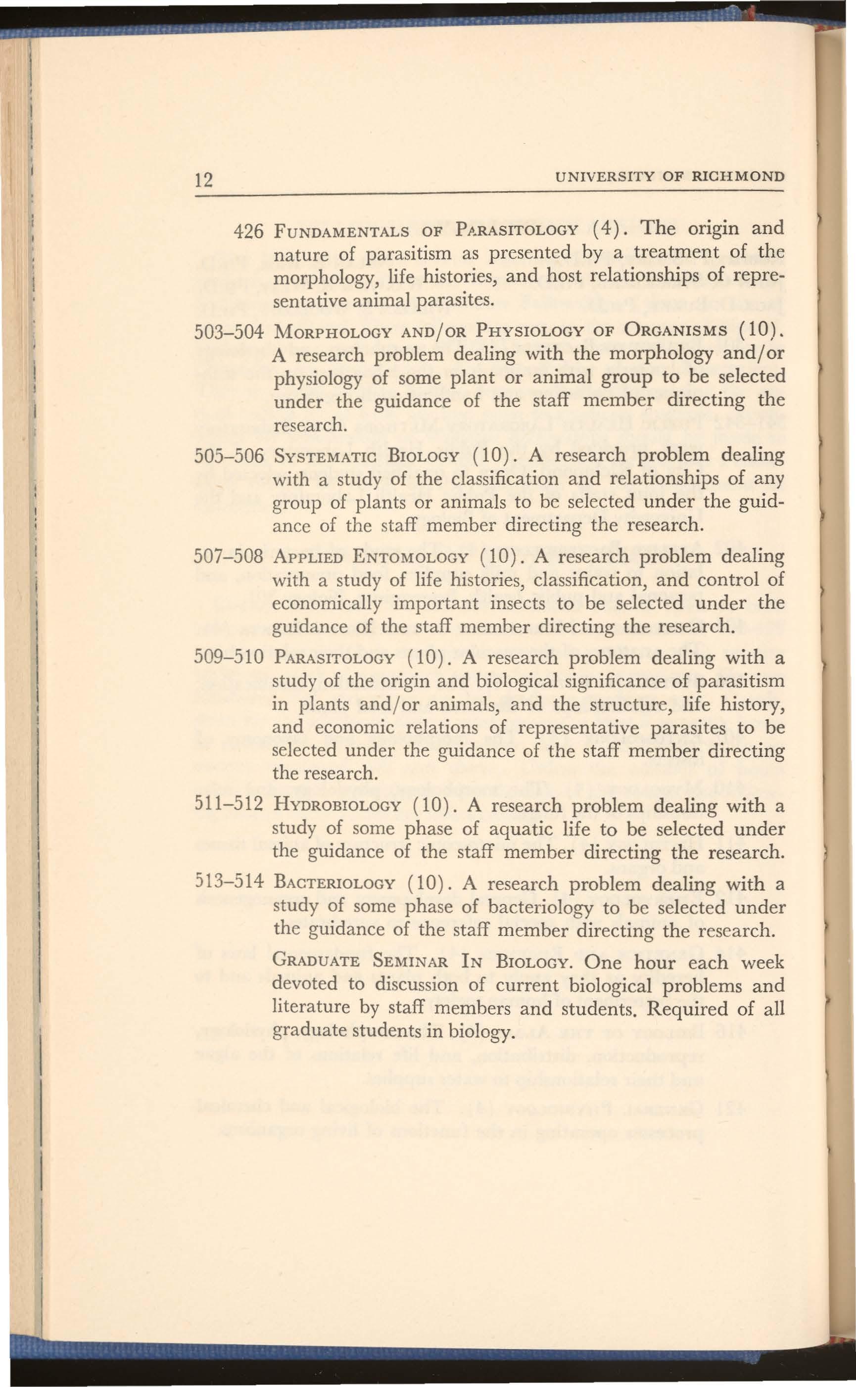 509-510 PARASITOLOGY ( 10). A research problem dealing with a study of the origin and biological significance of parasitism in plants and / or animals, and the structure, life history, and economic relations of representative parasites to be selected under the guidance of the staff member directing the research.