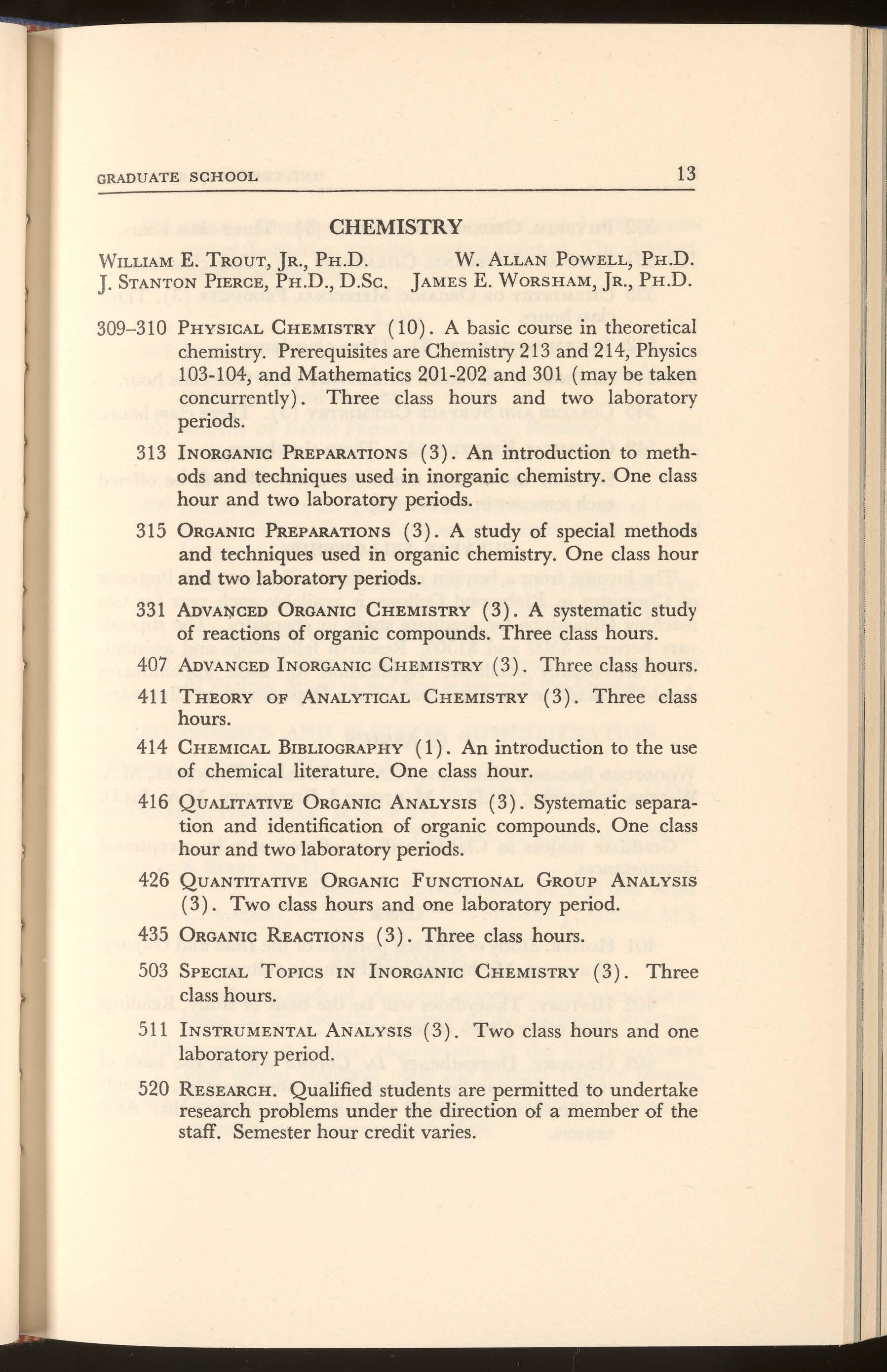 313 INORGANICPREPARATIONS(3). An introduction to methods and techniques used in inorganic chemistry. One class hour and two laboratory periods.