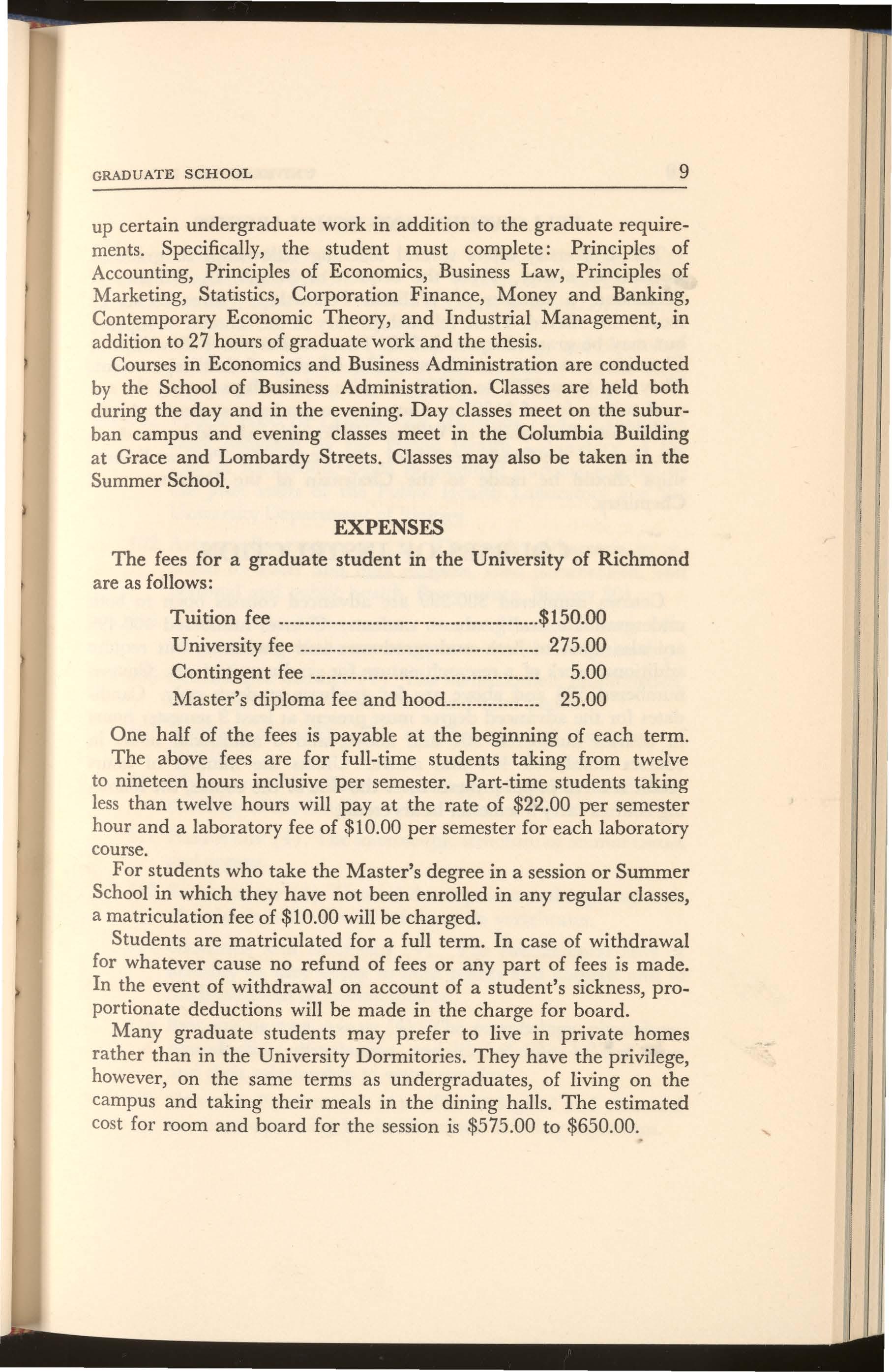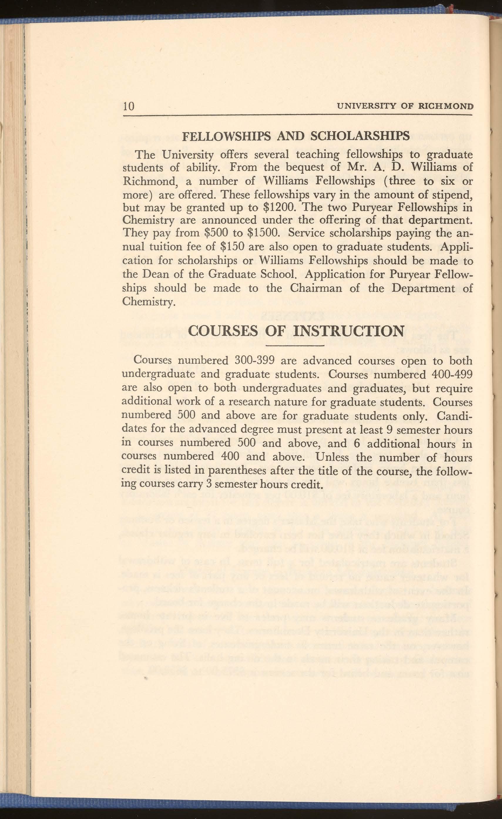 The income from a bequest of Dr. Bennet Puryear, first Professor of Chemistry in Richmond College, is available each year for two t e aching fellowships for graduate study in chemistry. The stipends vary between $500 and $1500 . Research fellowships and assistantships are usually available. Application for these appointments should be made to the Chairman of the Department of Chemistry.