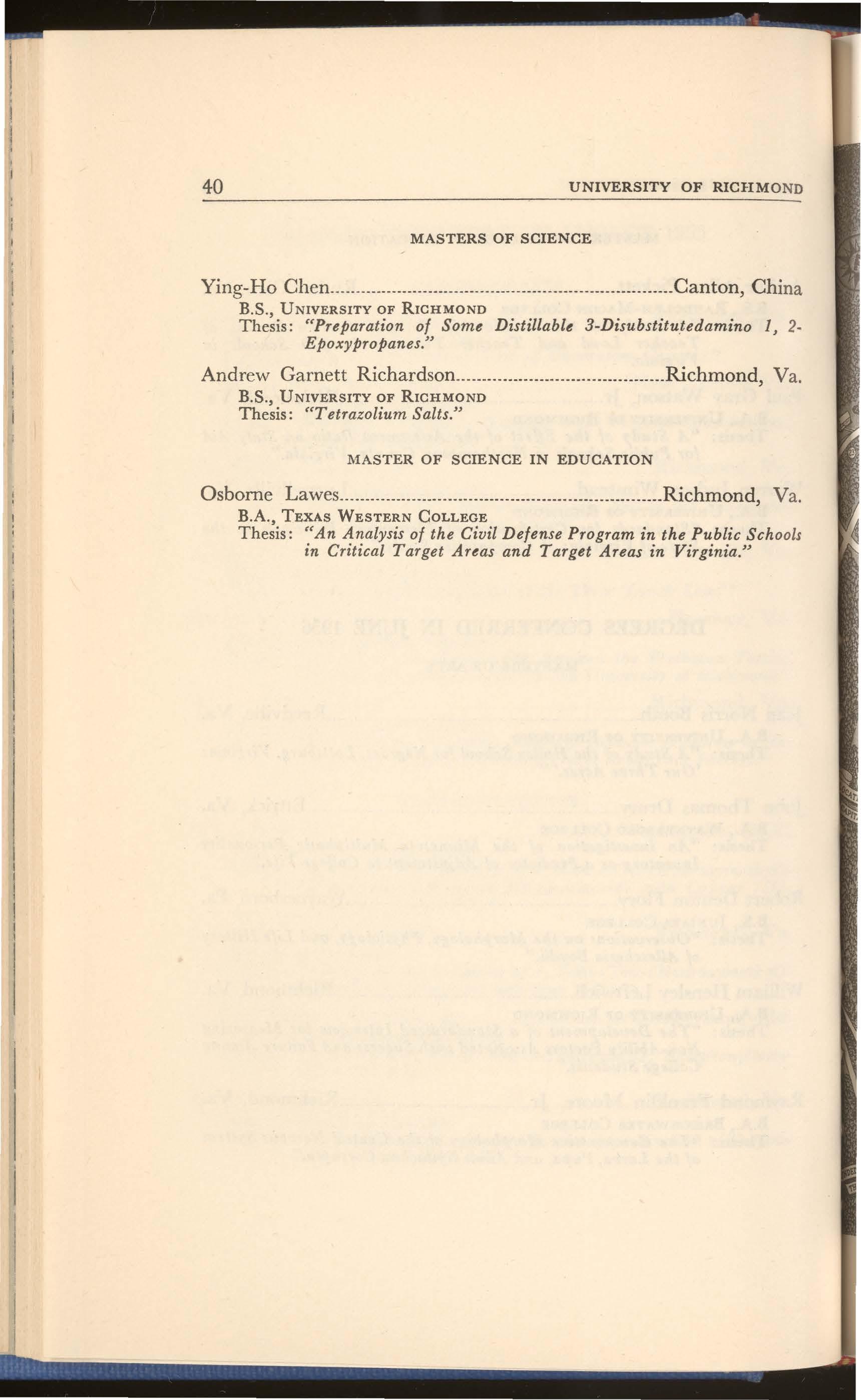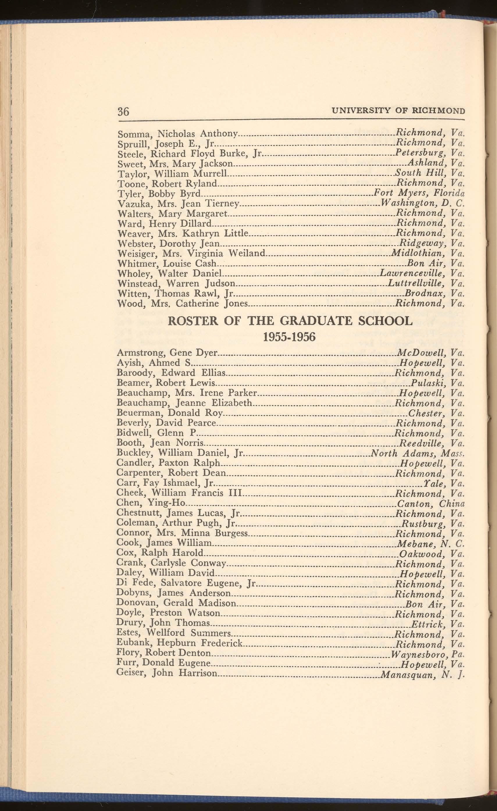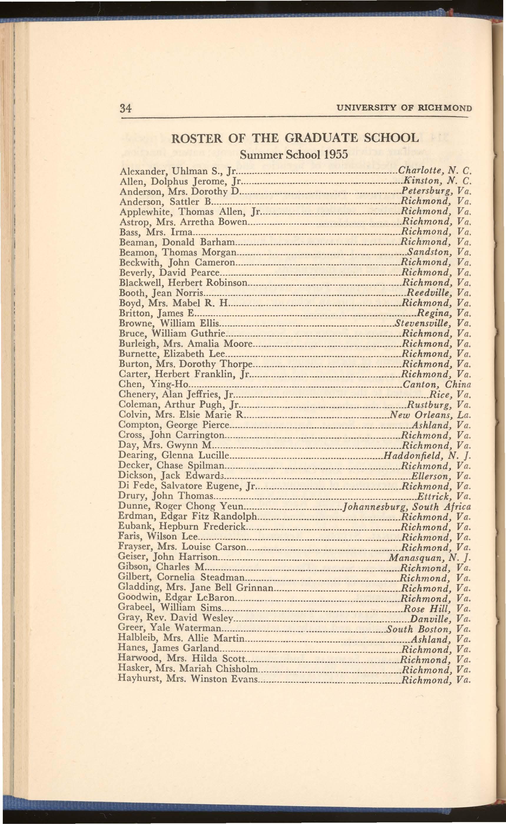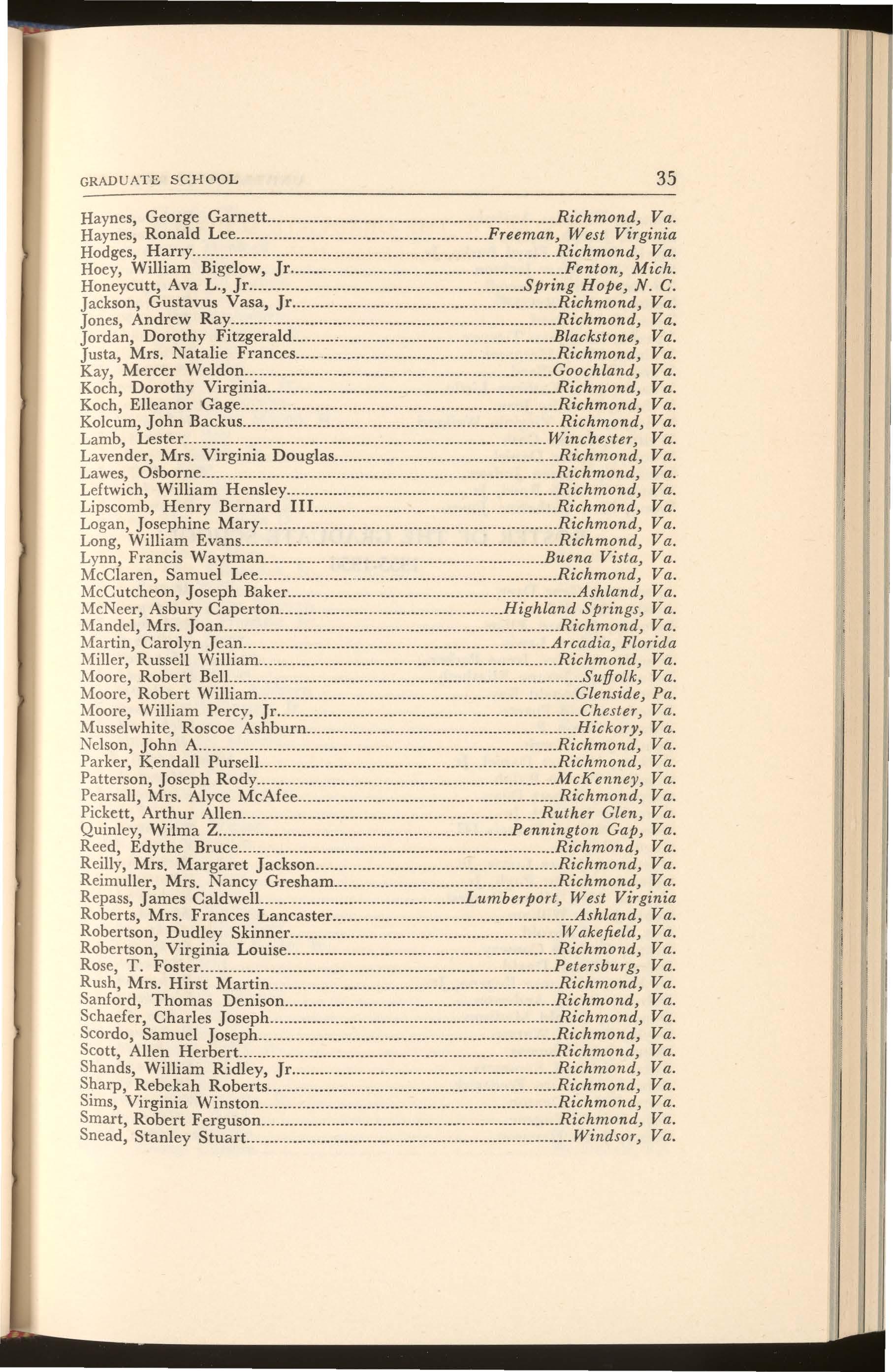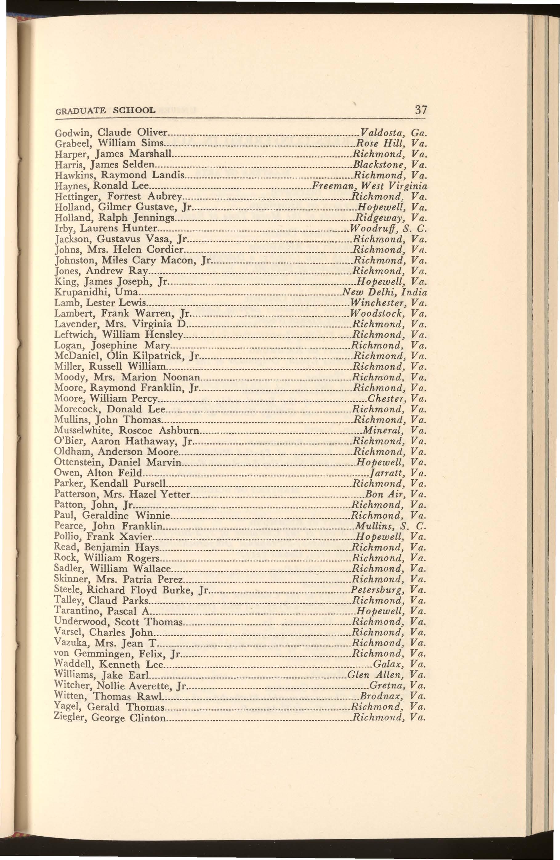 Armstrong, Gene Dyer lvlcDowell, Va Ayish, Ahmed S Hopewell, Va. Baroody, Edward Ellias ........ . ..................................................... Richmond, Va. Beamer, Robert Lewis Pulaski, Va. Beauchamp, Mrs. Irene Parker Hopewell, Va. Beauchamp, Jeanne Elizabeth .................................................... Richmond, Va. Beuerman, Donald Roy Chester, Va Beverly, David Pearce Richmond, Va. Bidwell, Glenn P Richmond, Va Booth, Jean Norris Reedville, Va. Buckley, William Daniel, Jr ............................................... North Adams, Mas s. Candler, Paxton Ralph Hopewell, Va Carpenter, Robert Dean Richmond, Va Carr, Fay Ishmael, Jr ............................................................................. Tale, Va. Cheek, William Francis III.. Richmond, Va. Chen, Ying-Ho Canton, China Chestnutt, James Lucas, Jr Richmond, Va. Coleman, Arthur Pugh, Jr Rustburg, Va Connor, Mrs. Minna Burgess ...................................................... Richmond, Va. g~~~•J:i:~sH~;~f~~::::::::::::::::::::::::::::::::::::::::::::::::::::::::::::::::::::~:t:;:;~J:·v~: