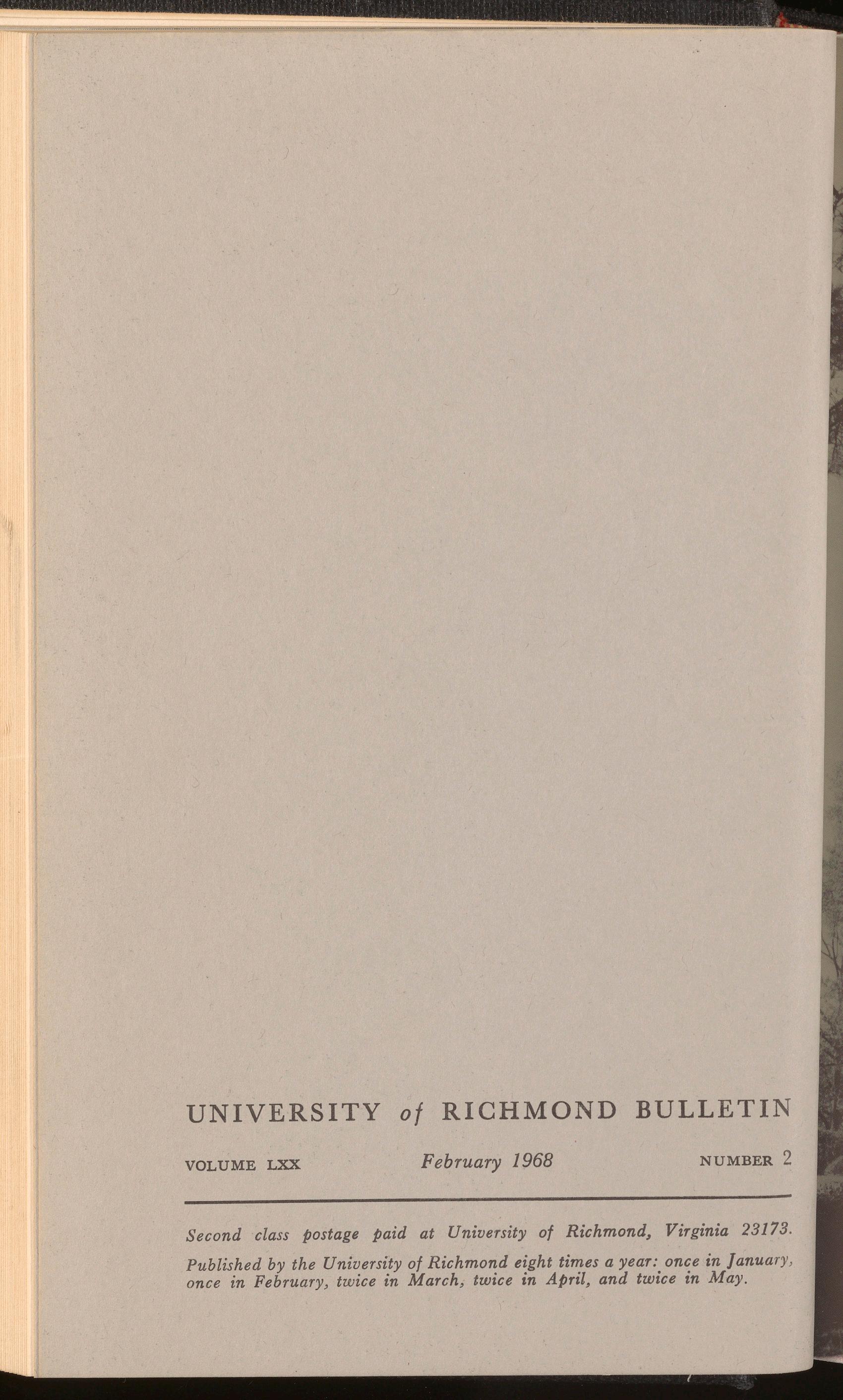 The following is a statement of the ownership, management, and circulation of the University of Richmond Bulletin as required by act of Congress of October, 1962: Section 4369, Title 39 U.S. Code. The Bulletin is published 8 times per calendar year and is owned and published by the University of Richmond located in Richmond, Virginia. The editor is Robert F. Smart, Provost of the Univer sity of Richmond, whose address is University of Richmond, Virginia 23173. The general business offices of the publisher are located at the University of Richmond, Virginia 23173. There are no bondholders, mortgage, or other security holders. The average number of copies of each issue during the preceding 12 months was 3632.