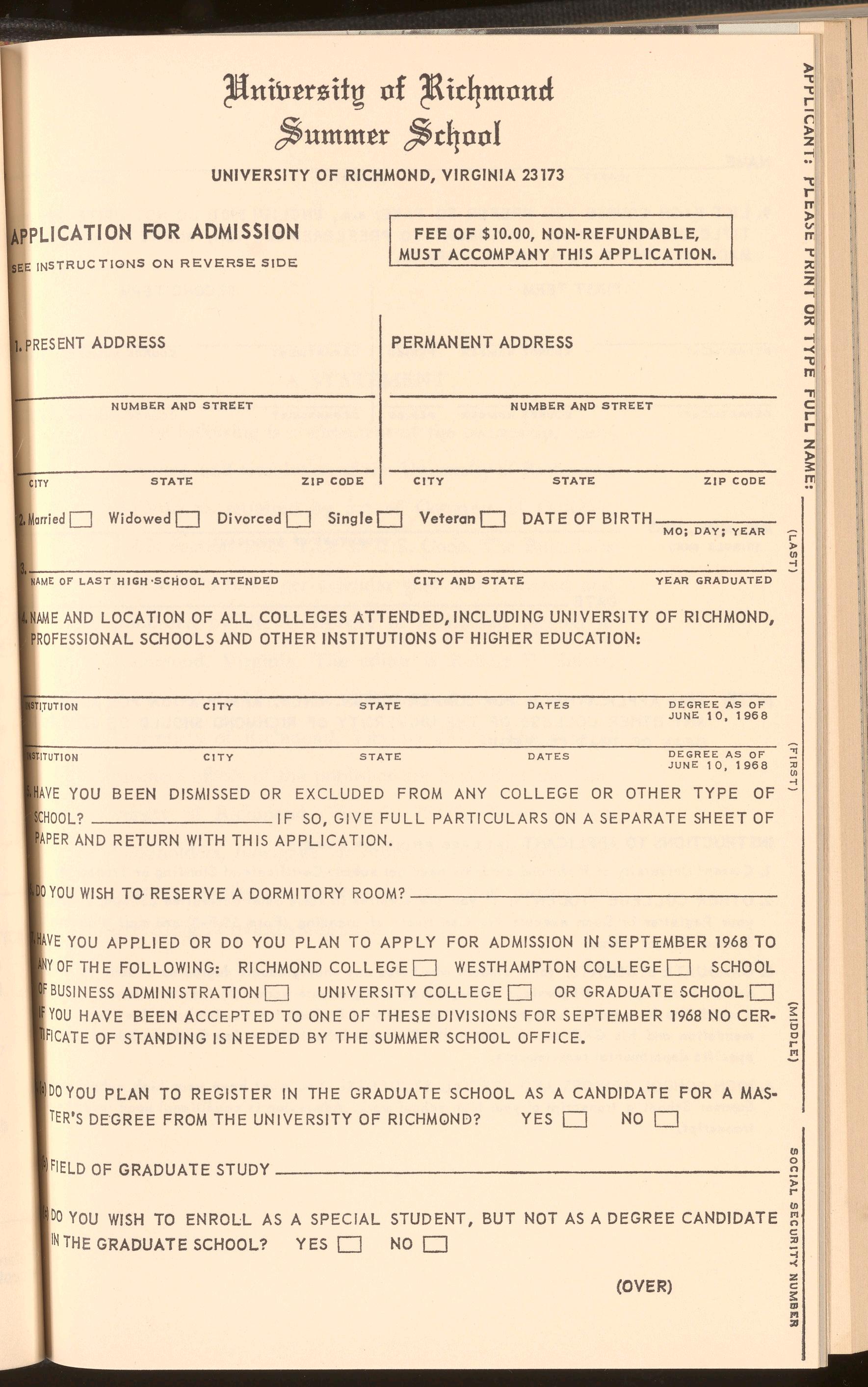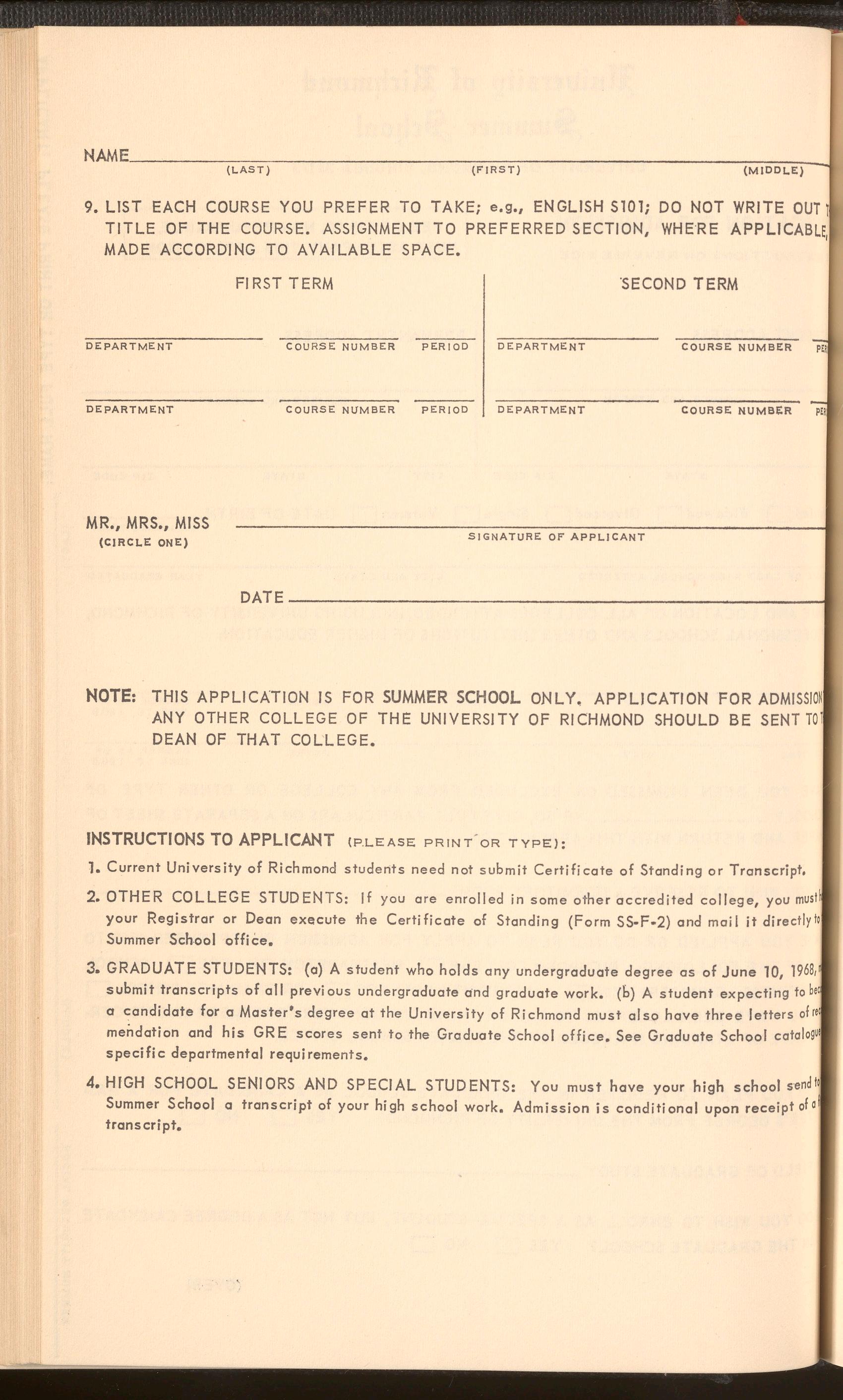 NOTE: THIS APPLICATION IS FOR SUMMER SCHOOL ONLY, APPLICATION FOR ADMISSIOI ANY OTHER COLLEGE OF THE UNIVERSITY OF RICHMOND SHOULD BE SENT TO I DEAN OF THAT COLLEGE.