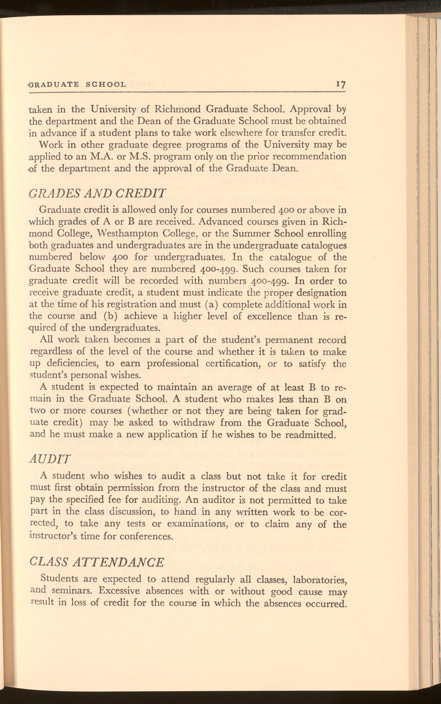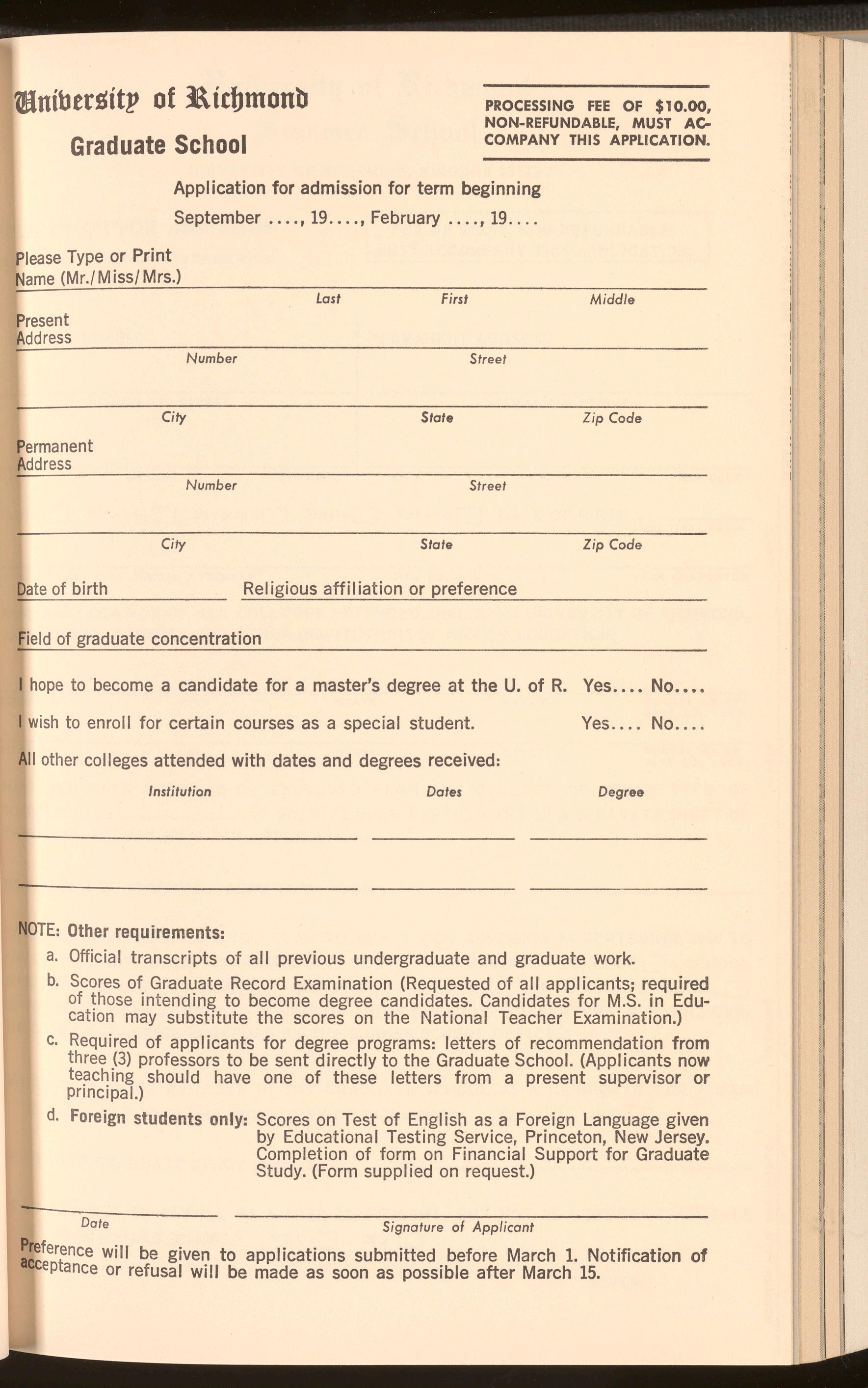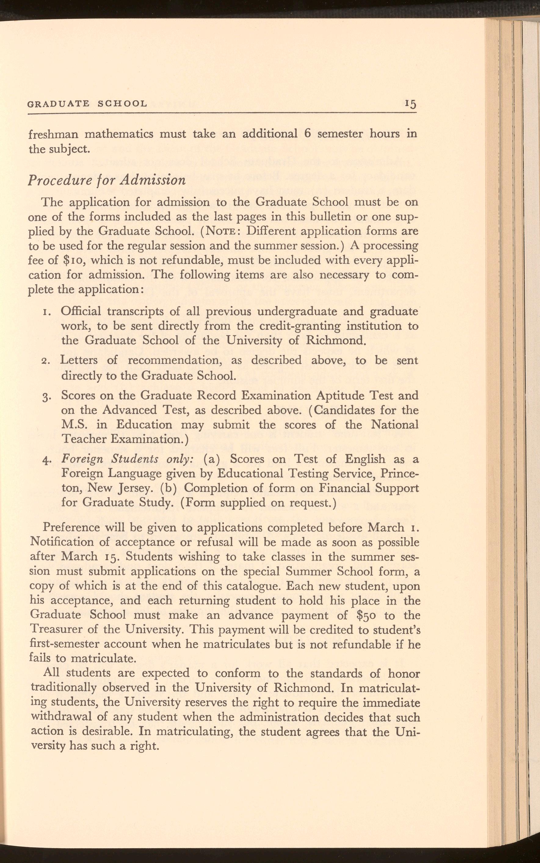 3. GRADUATE STUDENTS: (a) A student who holds any undergraduate degree as of June 10, 1968, submit transcripts of all previous undergraduate and graduate work. (b) A student expecting to b,, a candidate for a Master's degree at the University of Richmond must also have three letters ofre' mendation and his GRE scores sent to the Graduate School office. See Graduate School catalogu specific departmental requirements.