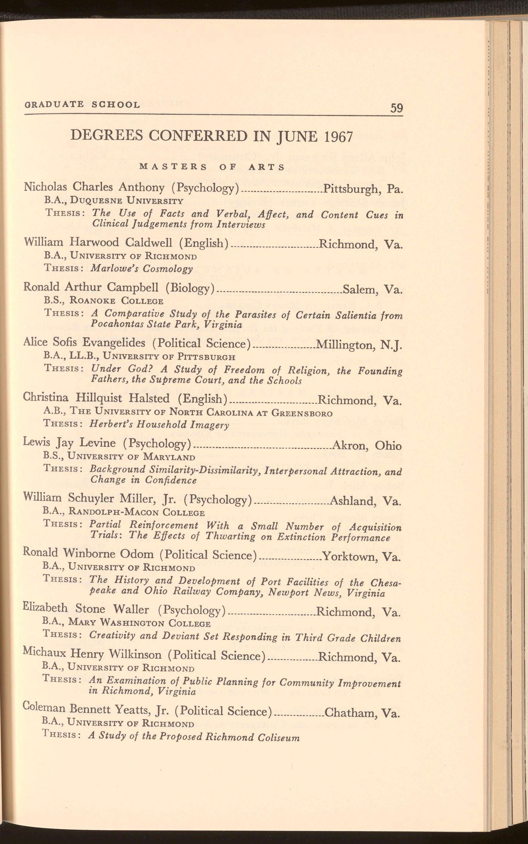 Louis Thomas Pastore (Biology) .................................... Richmond, Va.