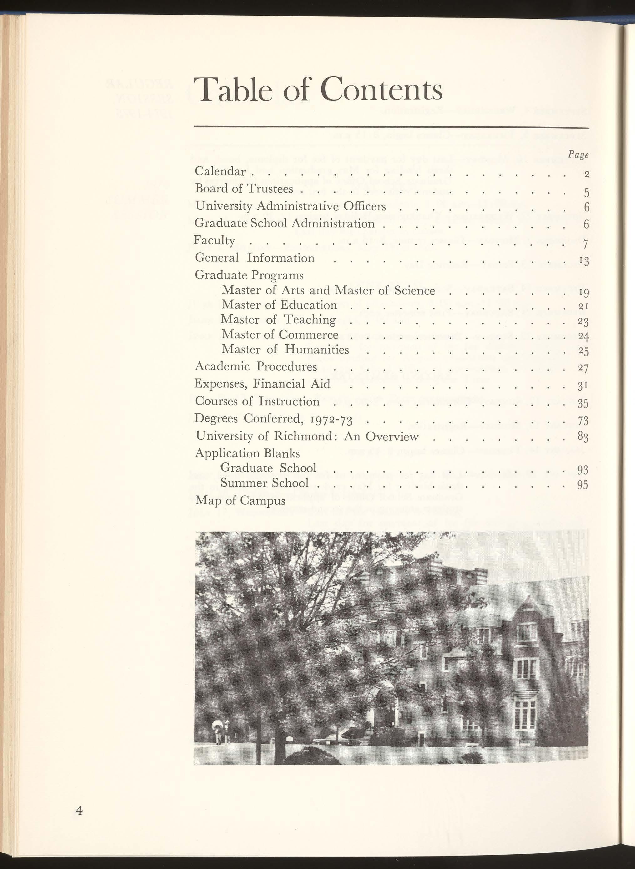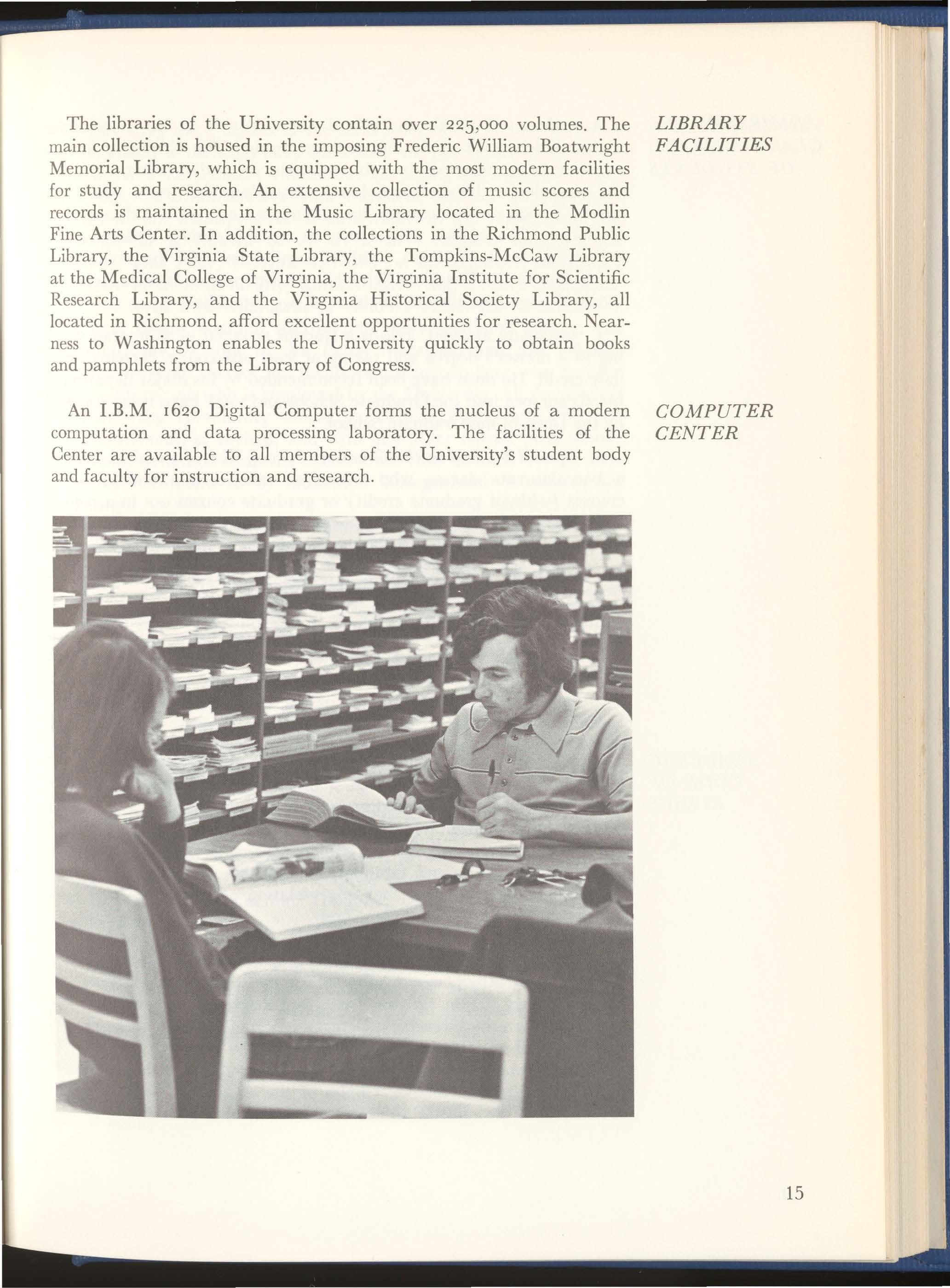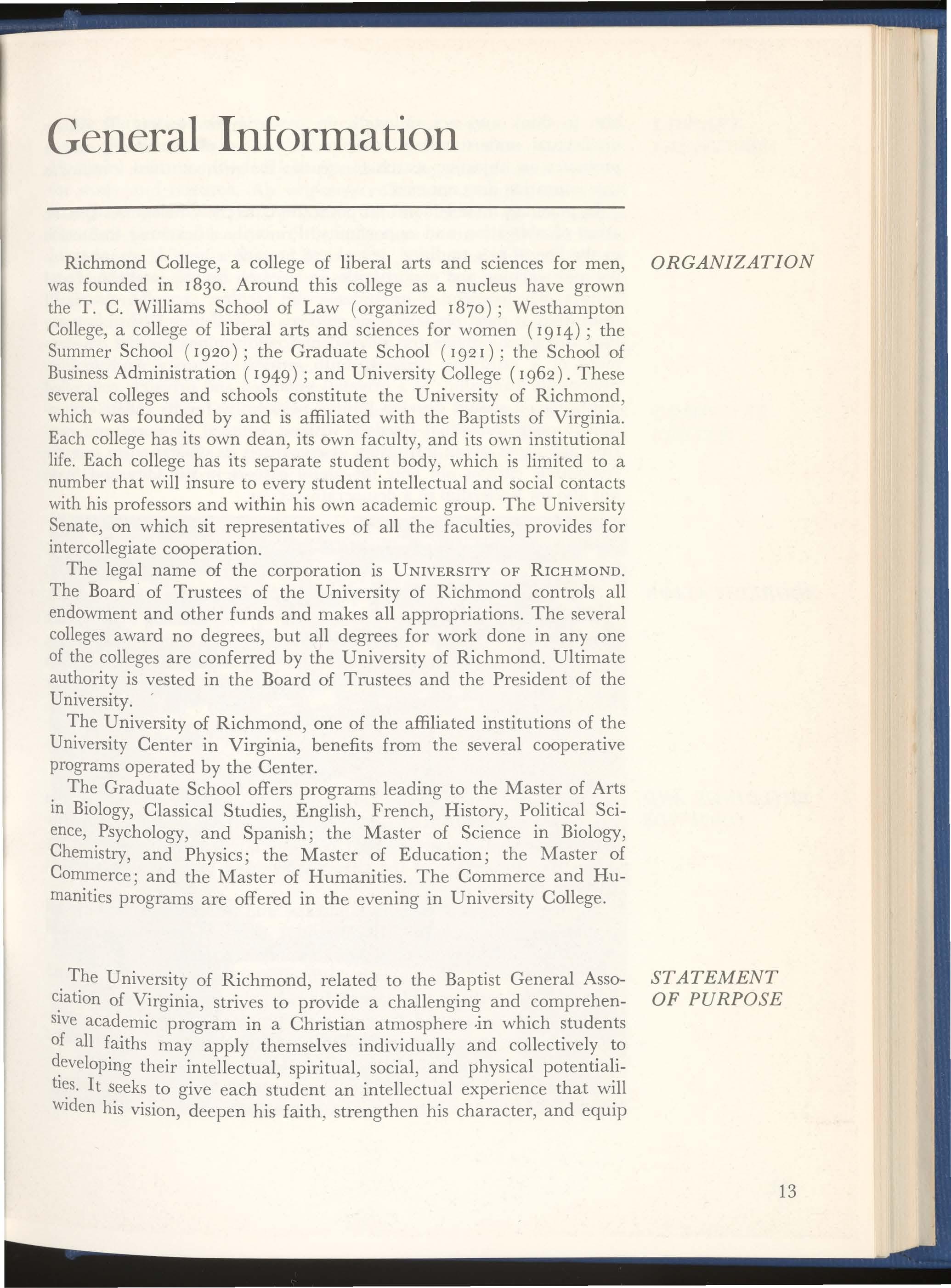 University College was created in 1962 to offer to the City of Richmond continuing education programs reflecting the strengths of the University of Richmond and directed toward the needs of the community. Students may enroll full time or part time to take courses in the evening, with or without credit. University College offers the degrees of Bachelor of Arts , Bachelor of Commerce, Master of Commerce, Master of Humanities , the Associate in Arts aw ard , the Associate in Commerce award, and various certificates. Among the major divisions of University College are the Ev ening Divi sion, the Institute for Business and Community Development , and Horizons in Learning. Each offers to a particular segment of the community many opportunities for continuing education. Located in the heart of Richmond , Uni v ersit y Col l ege is convenient to the constituencies it serves.