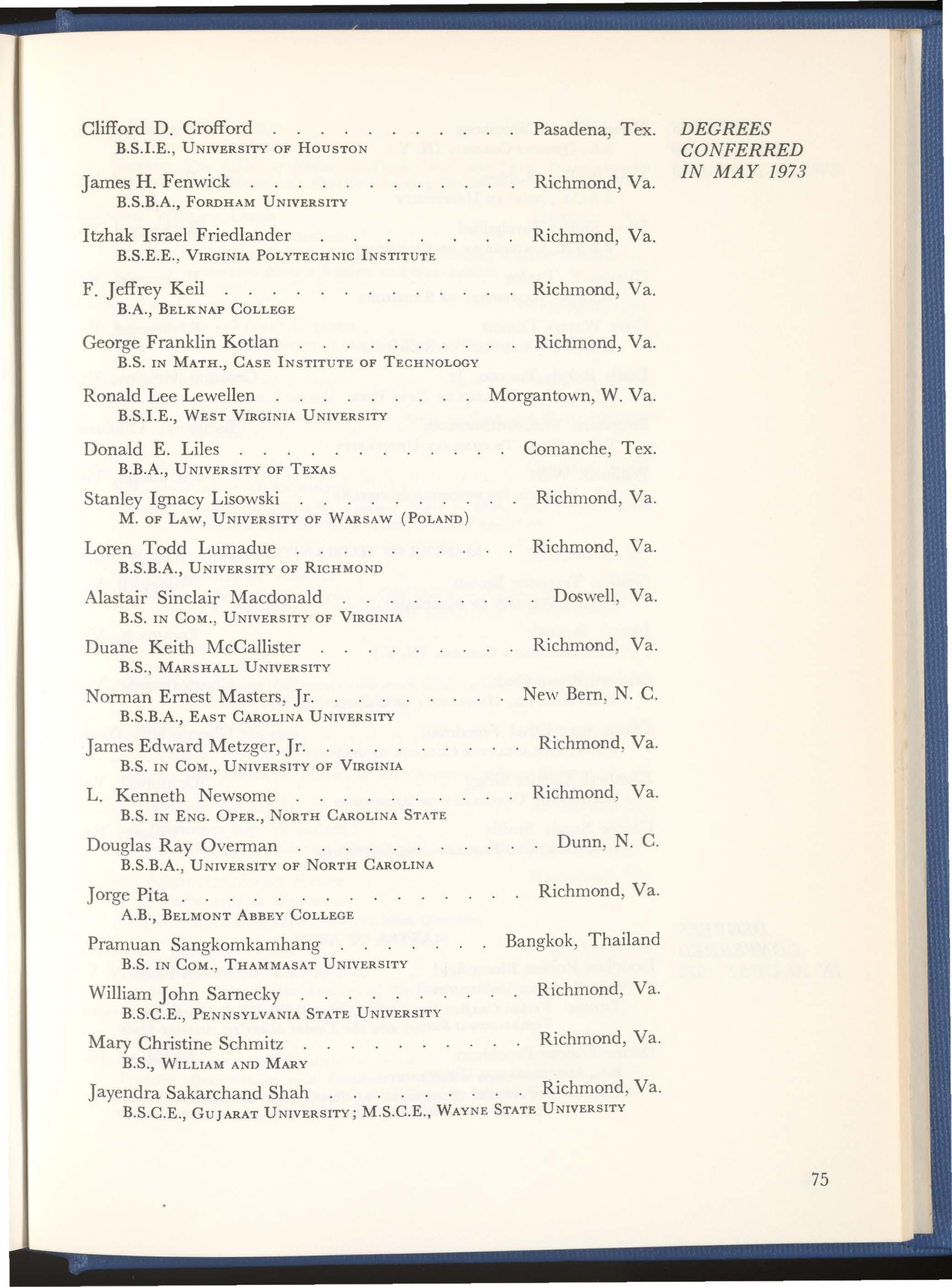 A particularly rich educational experience is shared by the students at the T. C. Williams School of Law . With a small , highly se lected enrollment, the student is assured of individual attention. Located within the City of Richmond, the seat of Virginia ' s government , the Law School offers its students unusual opportunities to examine firsthand the various county, city, and state courts , including the Supreme Court of Virginia . In addition to highly competent full-time professors, leading members of the Richmond and Virginia bars teach many of the elective courses. There are modern classrooms , seminar rooms , me eting rooms for student organizations, and a handsome courtroom. A new wing has been completed to expand the Law School building, making available more space for classrooms , library holdings , and offices. The Law School , offering courses leading to the Juris Doctor degree , has recently entered upon its second century of service to the Commonwealth and to the Nation. For more information, address