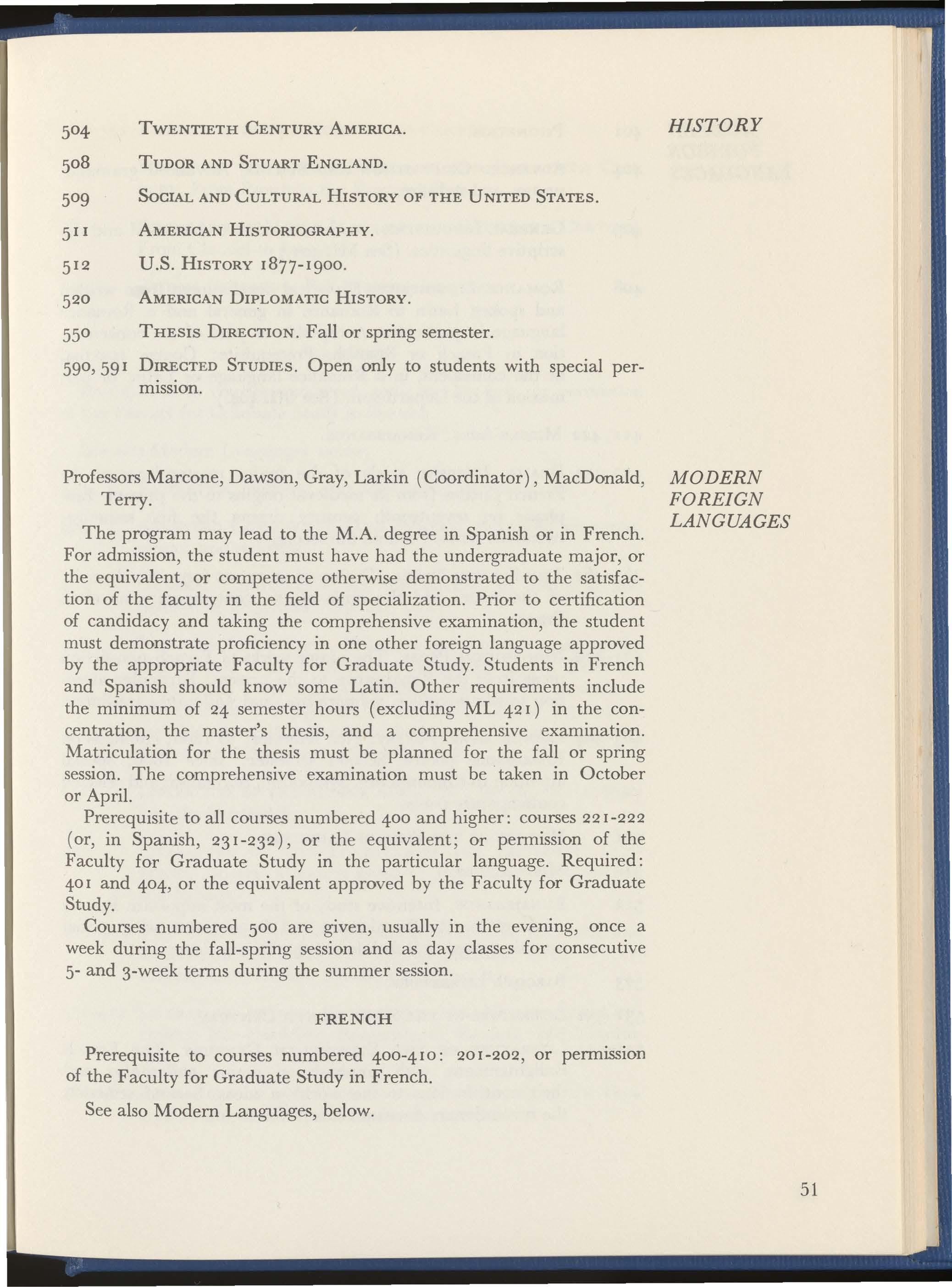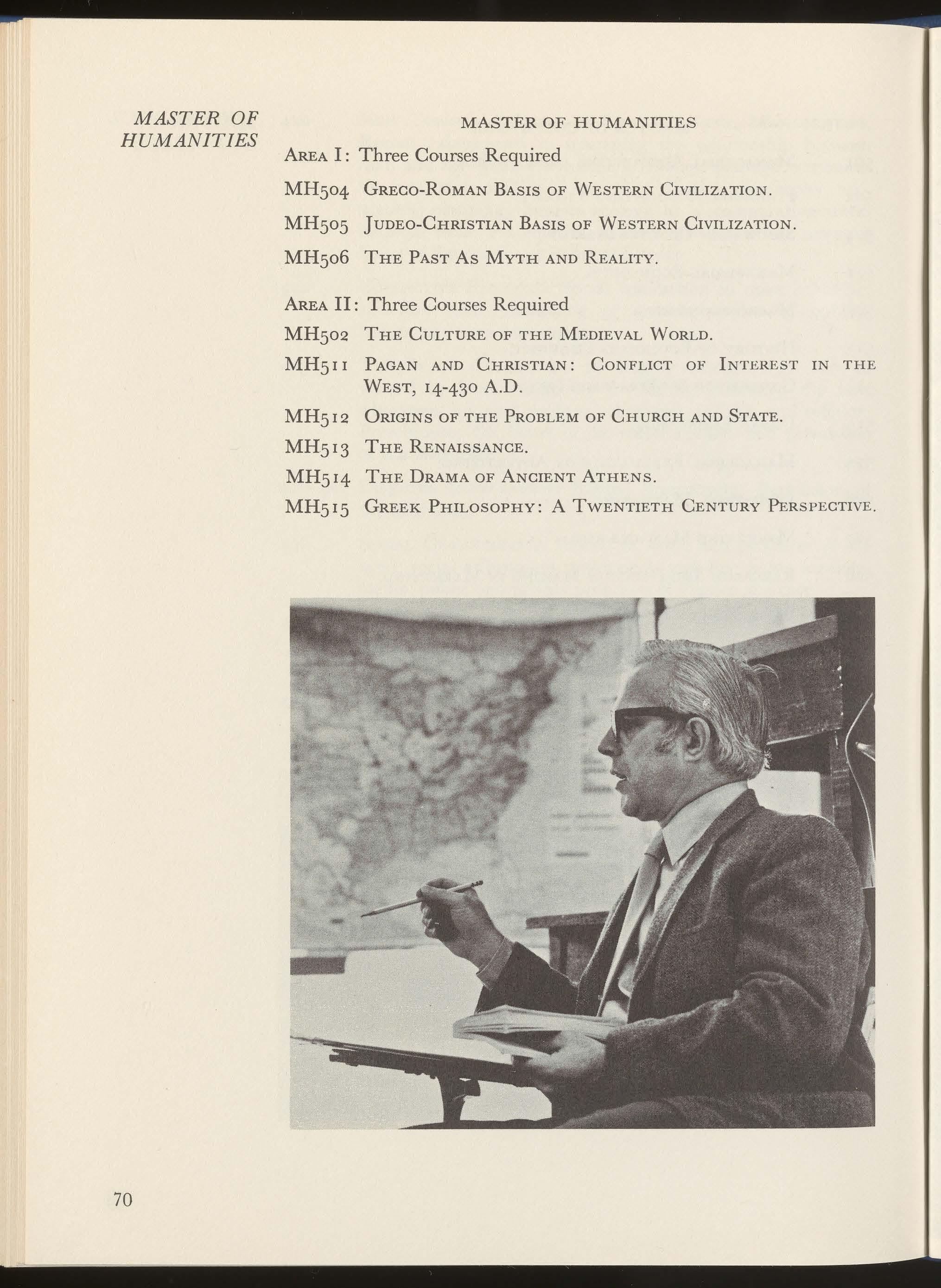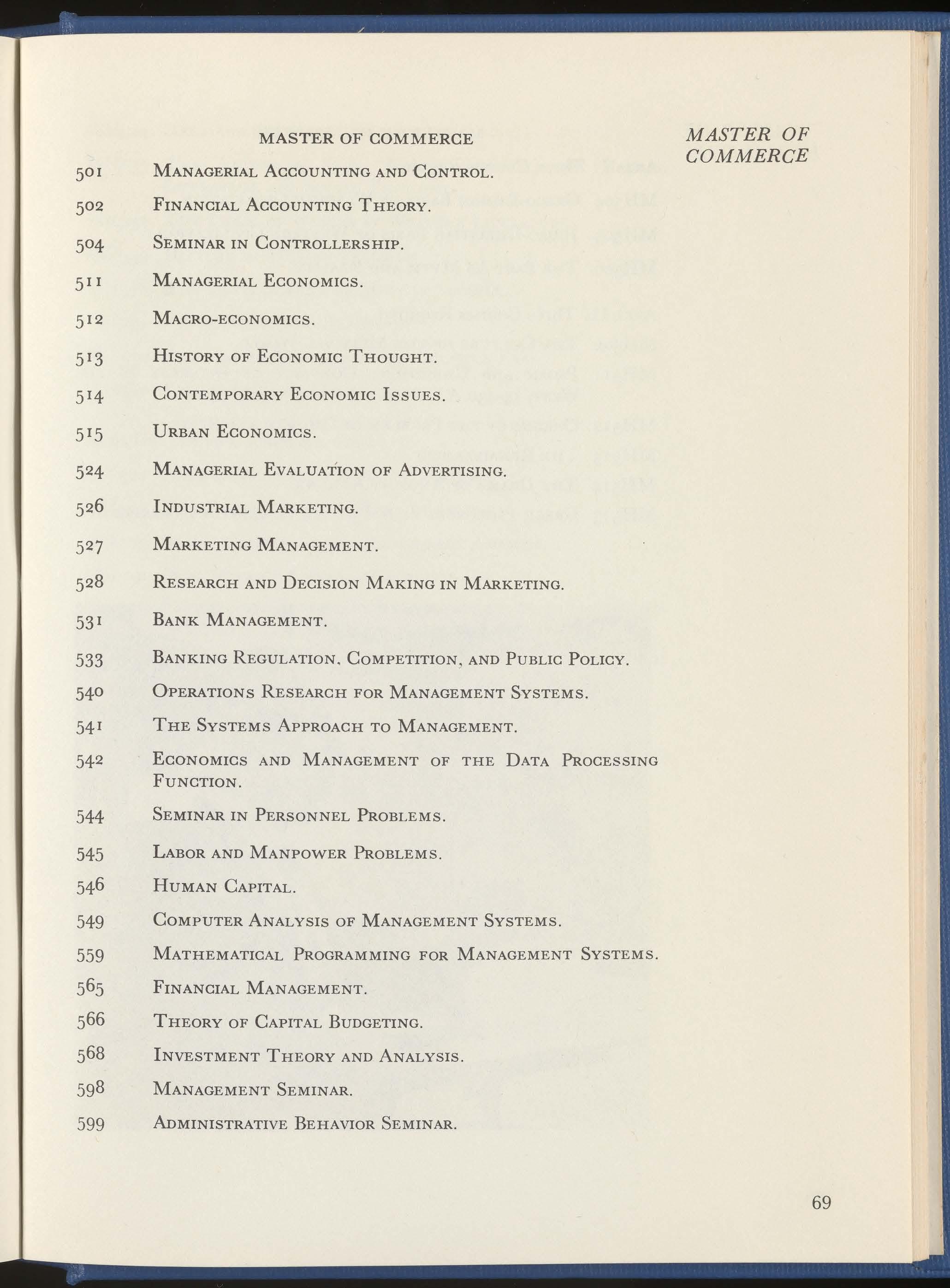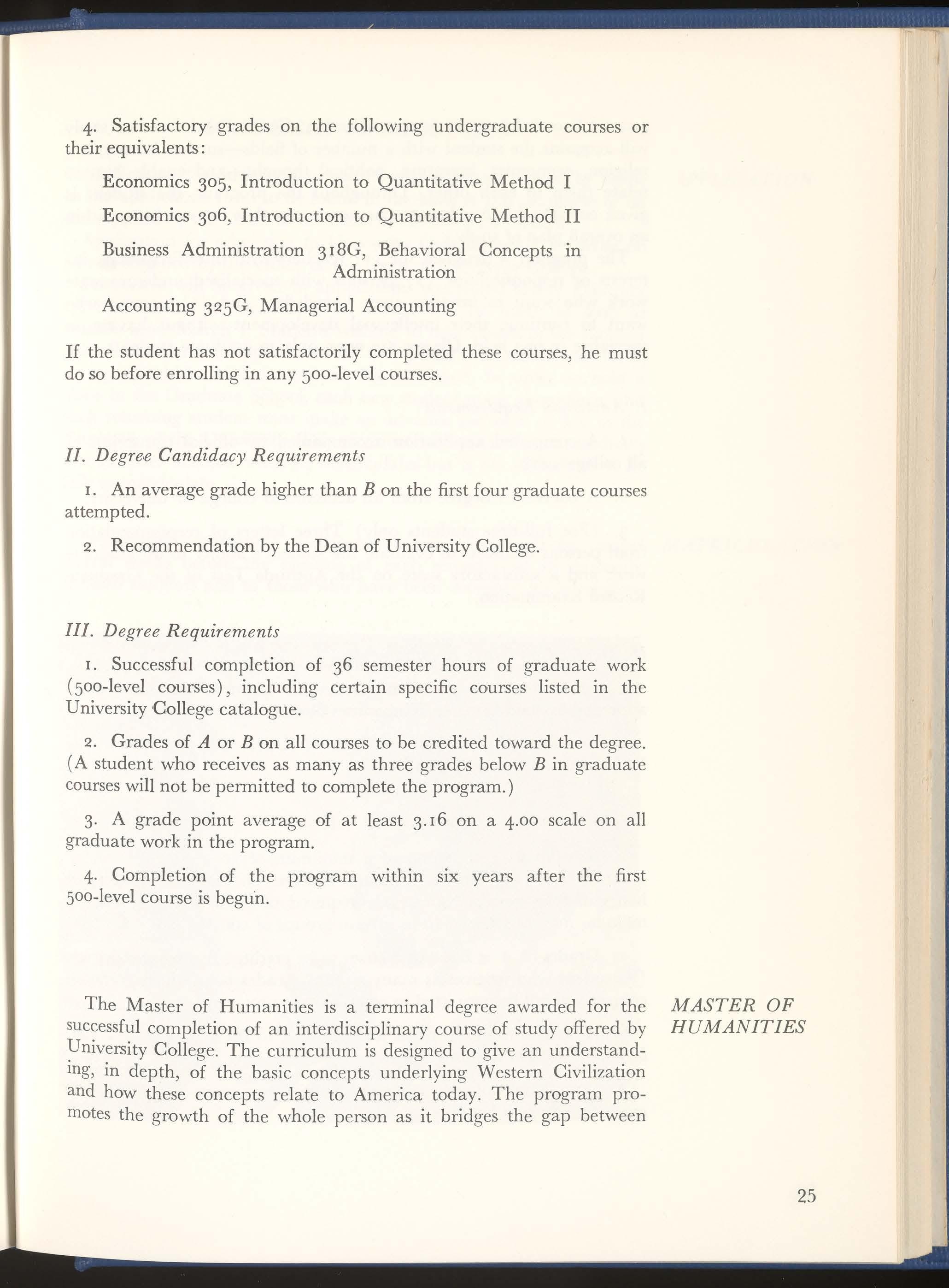 The Graduate School offers programs leading to the Master of Arts degree in Biology, Classical Studies , English , French, History, Political Science, Psychology, and Spanish ; the Master of Science degree in Biology, Chemistry, and Physics; the Master of Education (primarily in the summer session); the Master of Commerce; and the Master of Humanities. The Commerce and Humanities programs, both of which are terminal, are offered in the evening in University College .