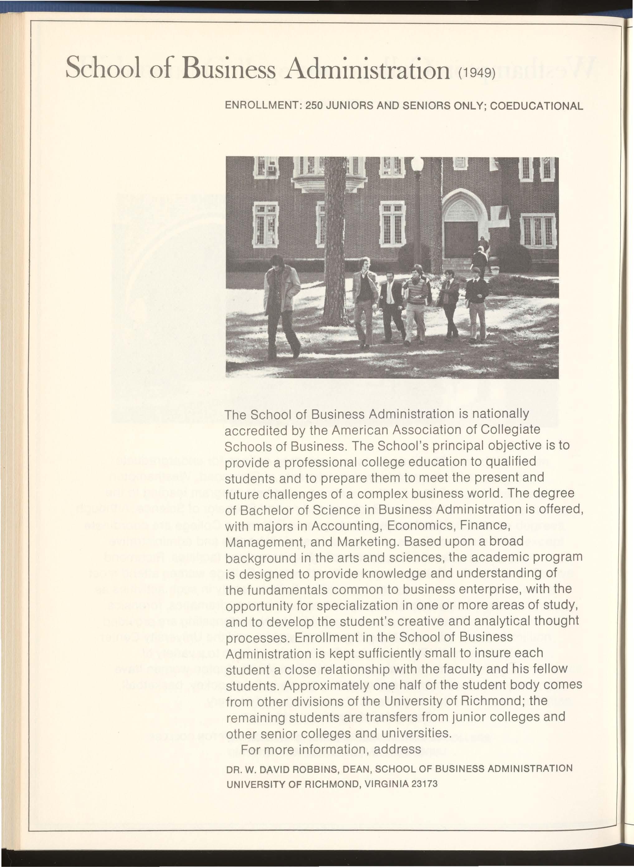 The School of Business Administration is nationally acc redited by the American Association of Collegiate Schools of Business . The School ' s principal objective is to provide a professional college education to qualified students and to prepare them to meet the present and future challenges of a complex business world. The degree of Bachelor of Science in Business Administration is offered, with majors in Accounting , Economics, Finance , Management , and Marketing Based upon a broad background in the arts and sc iences, the academic program is designed to provide knowledge and understanding of the fundamentals common to business enterprise, with the opportunity for specialization in one or more areas of study, and to develop the student ' s creative and analytical thought processes. Enrollment in the School of Business Administration is kept sufficiently small to insure each student a close relationship with the faculty and his fellow students. Appro x imately one half of the student body comes from other divisions of the University of Richmond ; the rema i ning students are transfers from junior colleges and other senior colleges and universities .