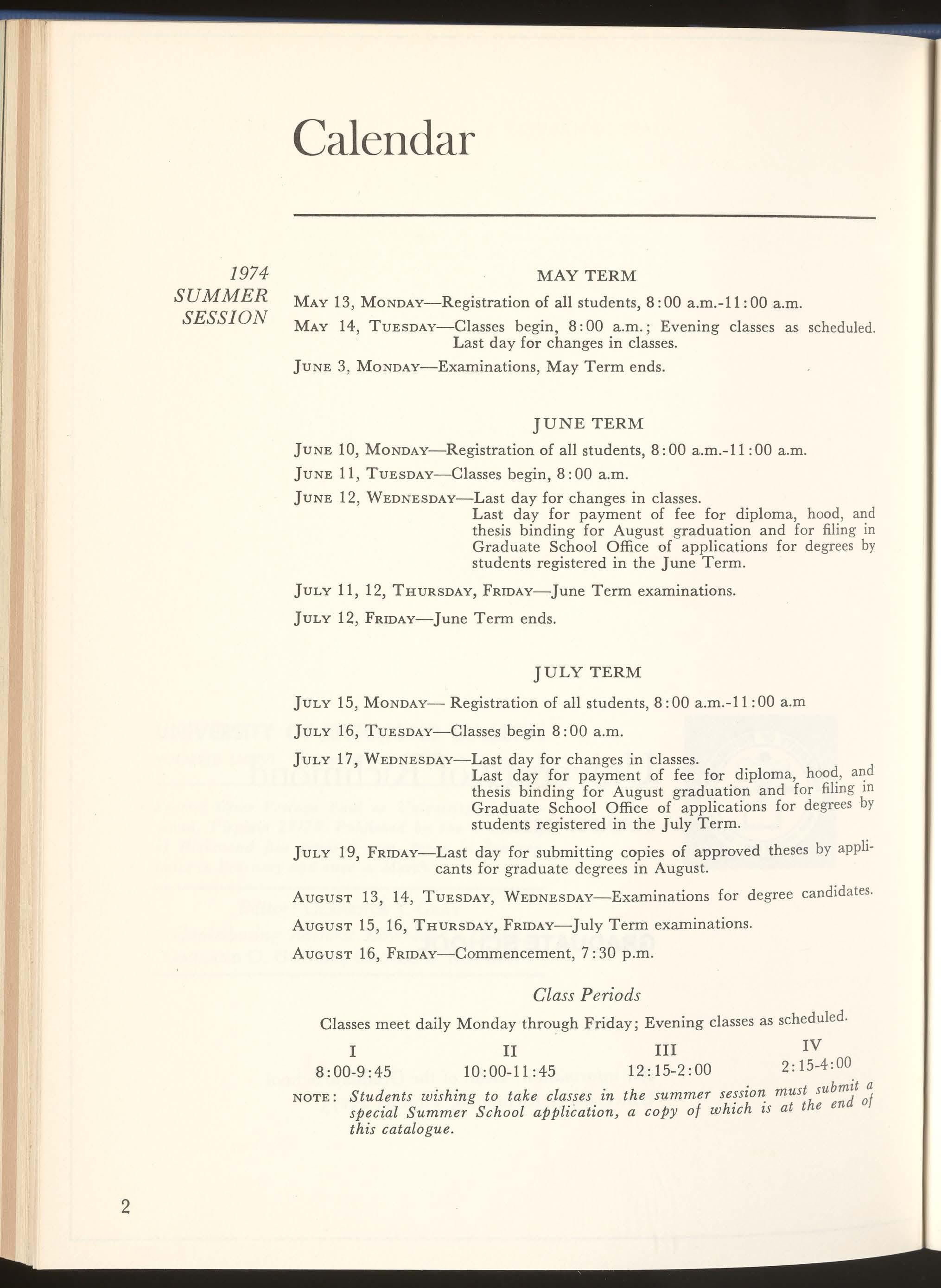 MAY 14, TUESDAY-Classes begin, 8: 00 a.m.; Evening classes as scheduled. Last day for changes in classes.