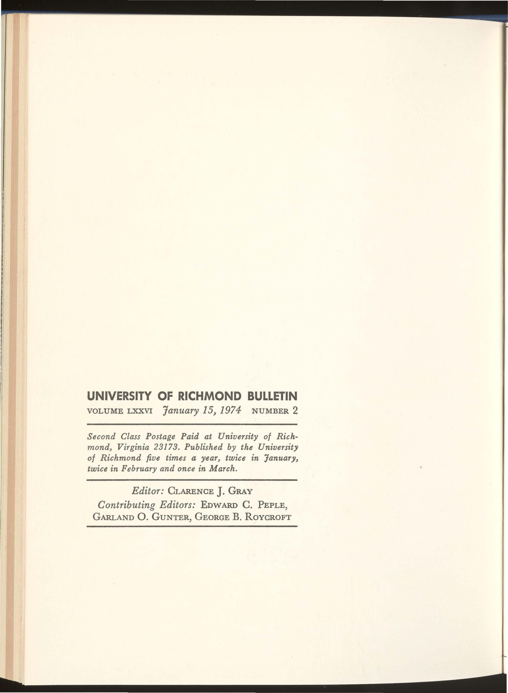 Second Class Postage Paid at University of Richmond, Virginia 23173. Published by the University of Richmond five times a year, twice in January, twice in February and once in March.