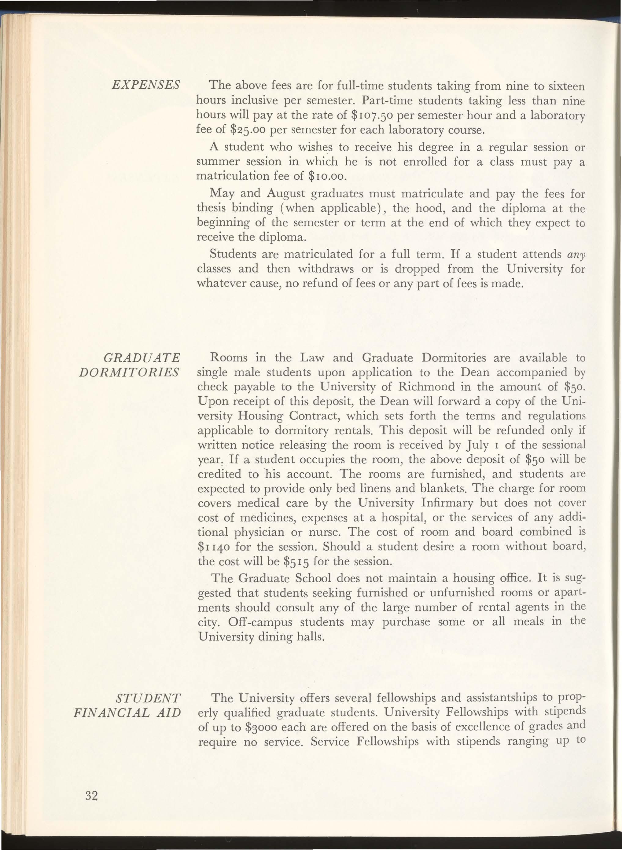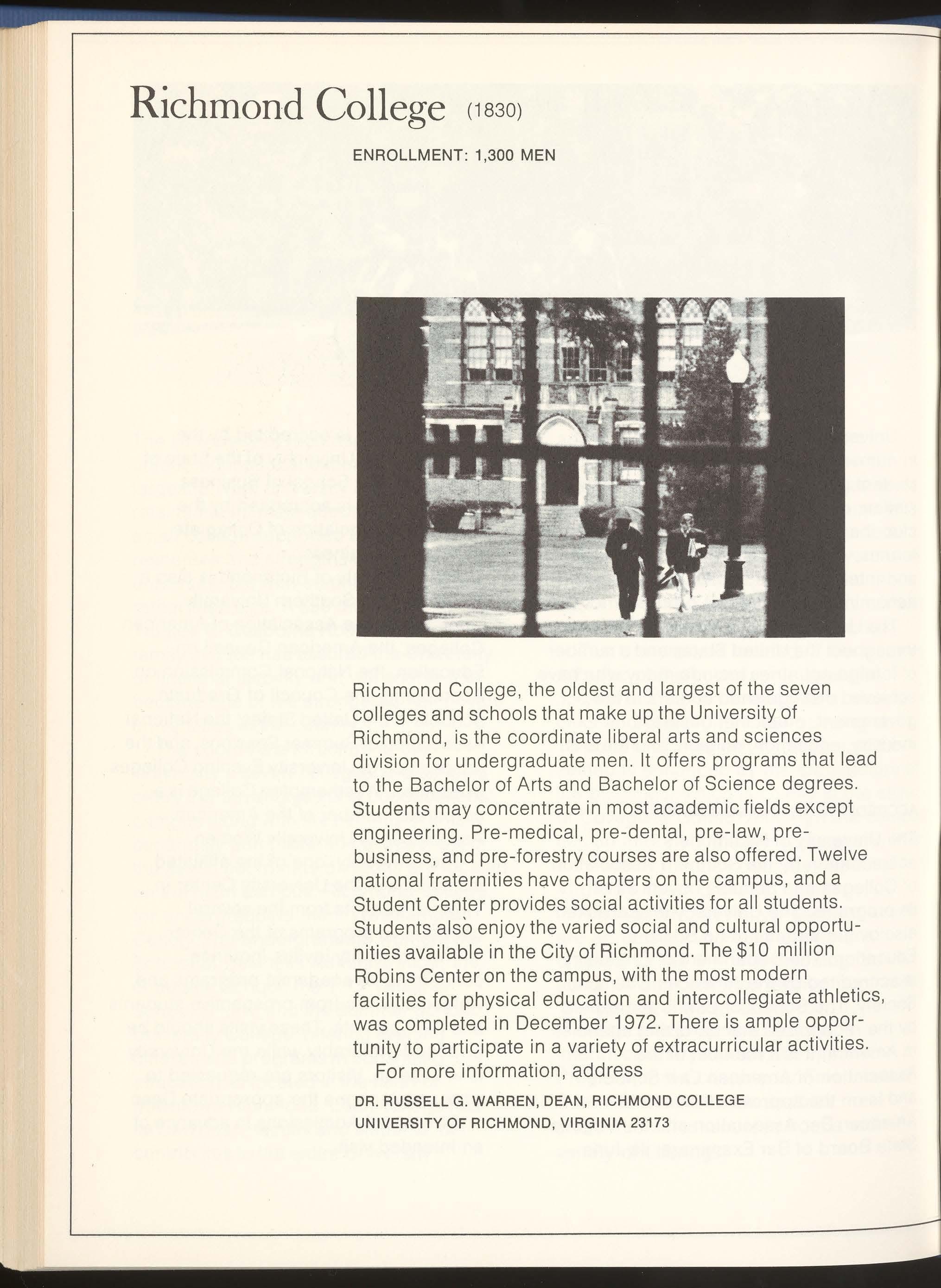 Richmond College, the oldest and largest of the seven colleges and schools that make up the University of Richmond, is the coordinate liberal arts and sciences division for undergraduate men. It offers programs that lead to the Bachelor of Arts and Bachelor of Science degrees. Students may concentrate in most academic fields except engineering. Pre-medical, pre-dental, pre-law, prebusiness, and pre-forestry courses are also offered. Twelve national fraternities have chapters on the campus, and a Student Center provides social activities for all students. Students also enjoy the varied social and cultural opportunities available in the City of Richmond. The $1 O million Robins Center on the campus , with the most modern facilities for physical education and intercollegiate athletics , was completed in December 1972. There is ample opportunity to participate in a variety of extracurricular activities
