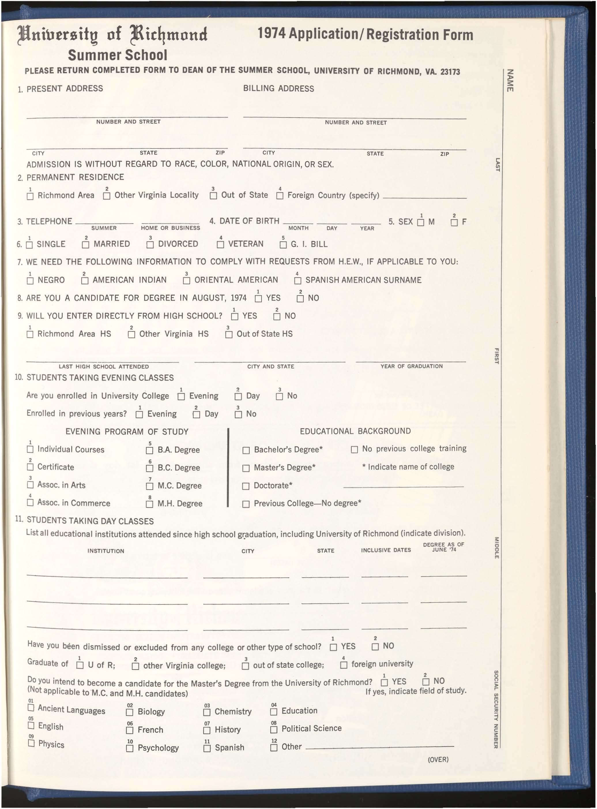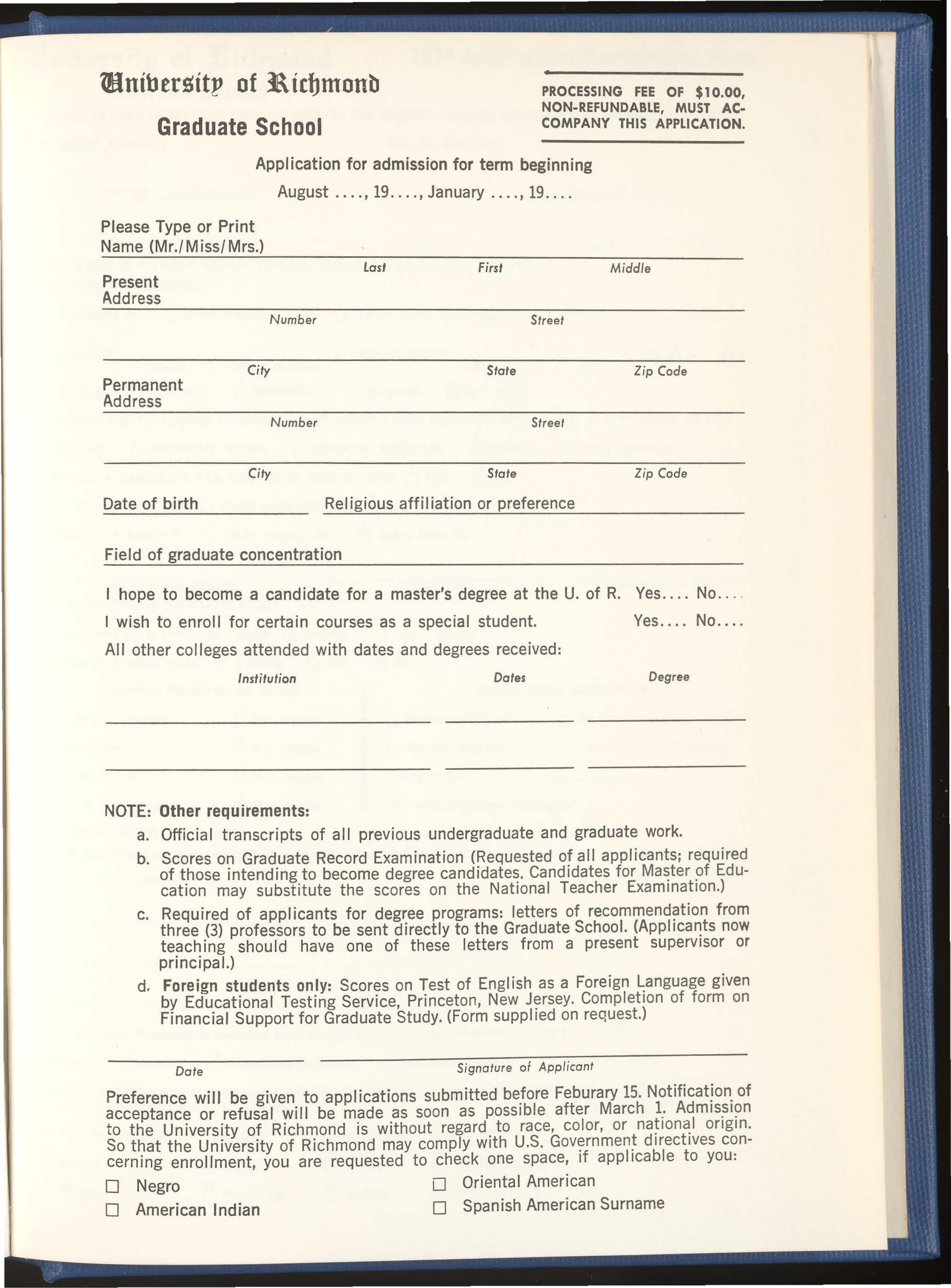 Preference will be given to applications submitted before Feburary 15. Notificat!on_of acceptance or refusal will be made as soon as possible after March 1. Adm1ss1on to the University of Richmond is without regard to race, color, or na~ionB;Iorigin. So that the University of Richmond may comply with U.S. Government d1rect1vesconcerning enrollment, you are requested to check one space, if applicable to you: