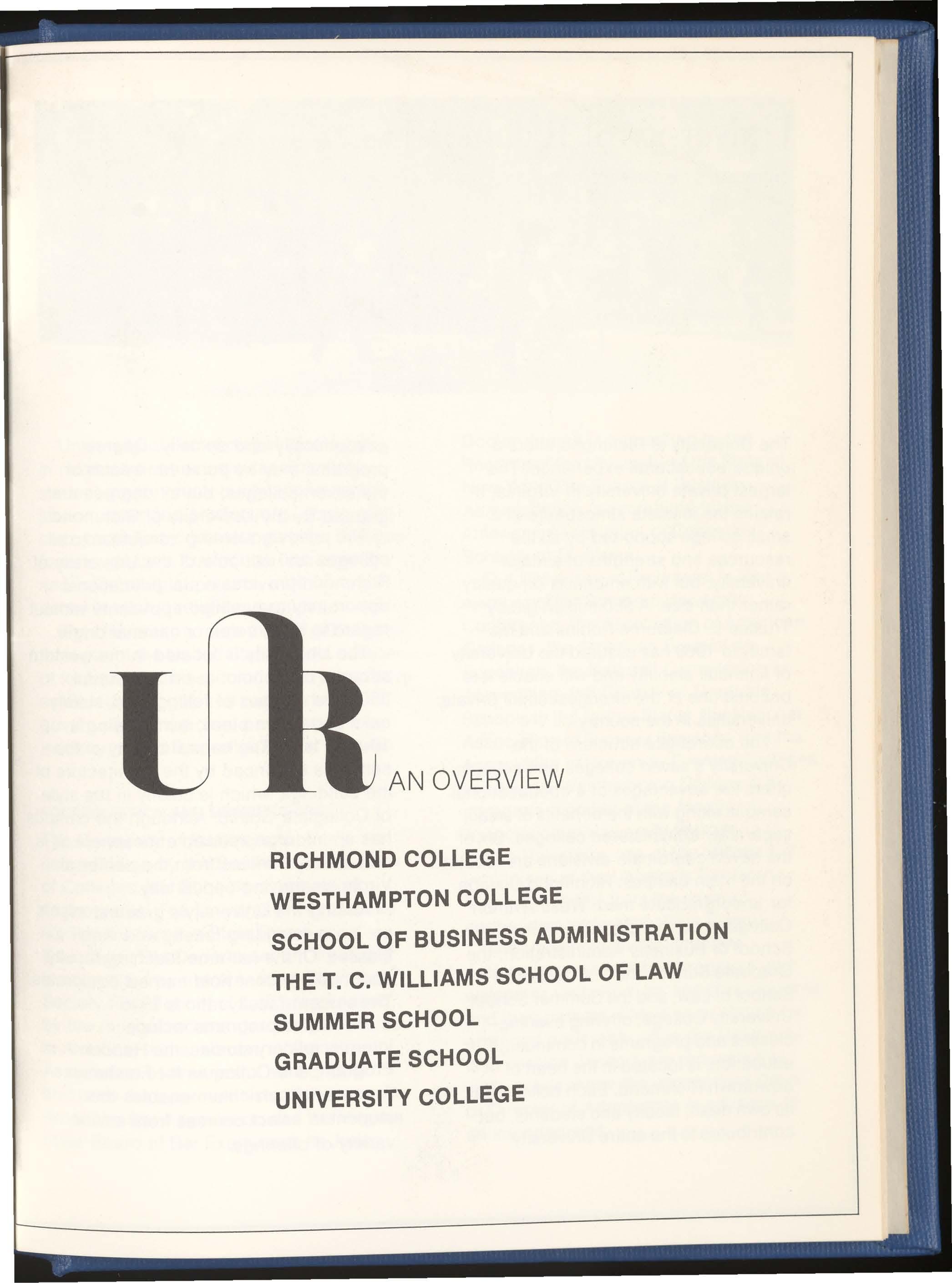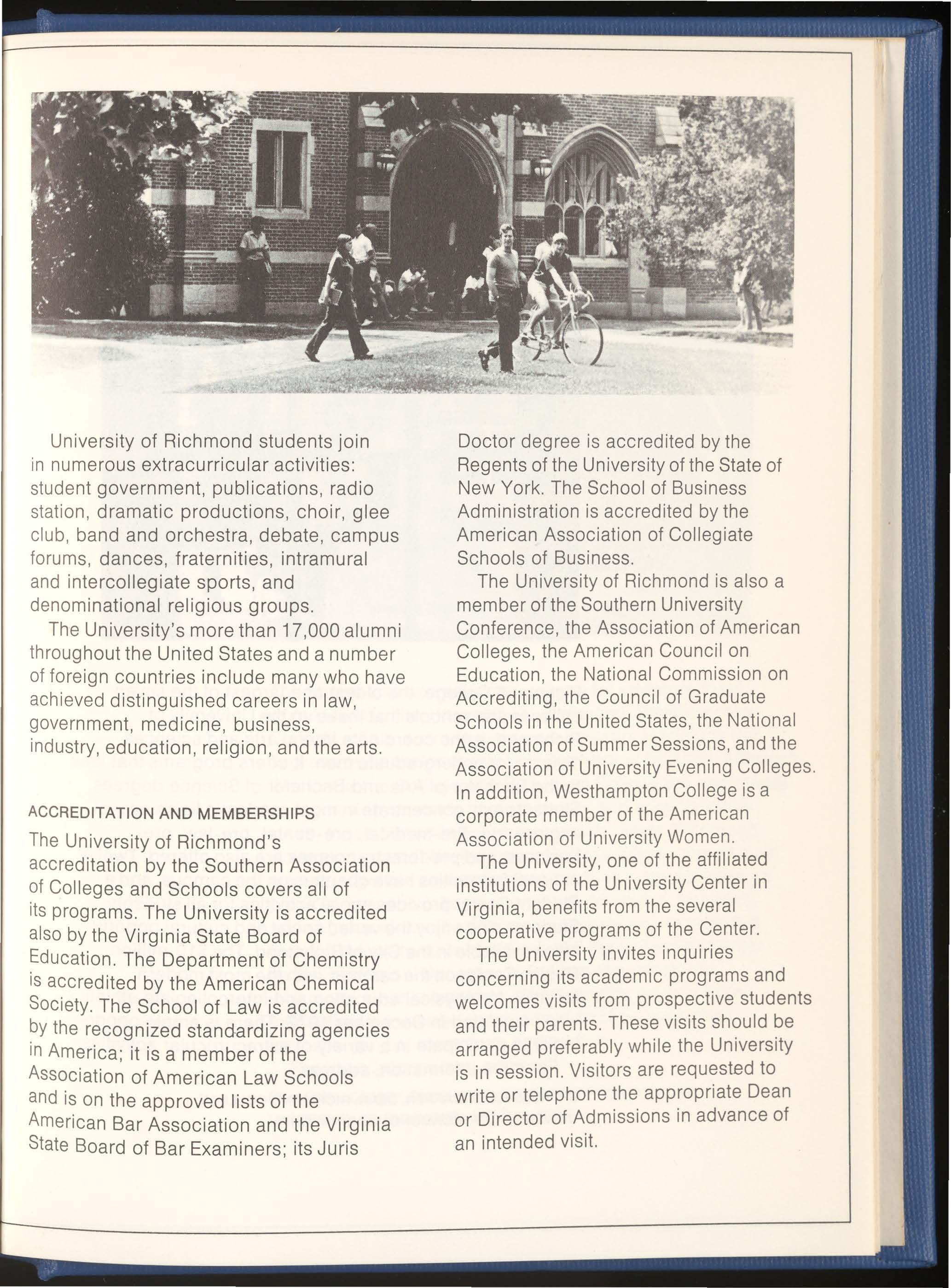 The University of Richmond offers a unique educational experience. The largest private university in Virginia, it retains the intimate atmosphere of a small college supported by all the resources and strengths of a major university, but with emphasis on quality rather than size. A $50 million gift by Trustee E. Claiborne Robins and his family in 1969 has assured the University of financial stability and will enable it to become one of the strongest small private universities in the country.