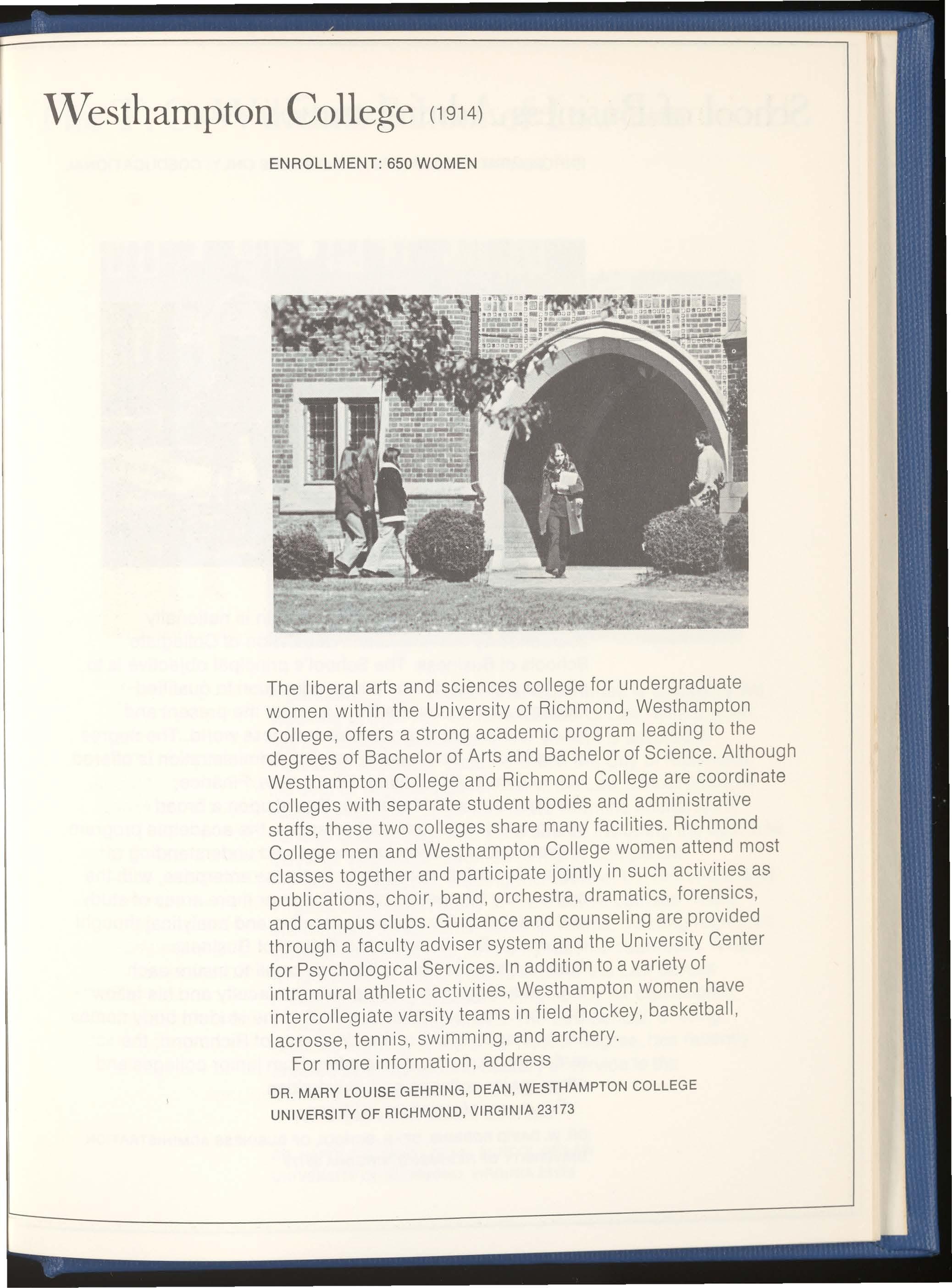 The liberal arts and sciences college for undergraduate women within the University of Richmond, Westhampton College , offers a strong academic program leading to the degrees of Bachelor of Arts and Bachelor of Scienc_e.Although Westhampton College and Richmond College are coordinate colleges with separate student bodies and administrative staffs , these two colleges share many facilities. Richmond College men and Westhampton College women attend most classes together and participate jointly in such activities as publications , choir , band , orchestra, dramatics , forensics , and campus clubs . Guidance and counseling are provided through a faculty adviser system and the University Center for Psychological Services. In addition to a variety of intramural athletic activities , Westhampton women have intercollegiate varsity teams in field hockey, basketball, lacrosse , tennis , swimming , and archery.