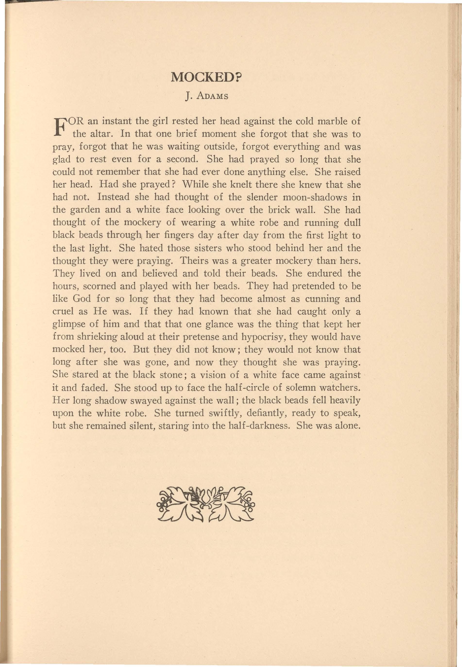 FORan instant the girl rested her head against the cold marble of the altar. In that one brief moment she forgot that she was to pray, forgot that he was waiting outside, forgot everything and was g-lad to rest even for a second. She had prayed so long that she could not remember that she had ever done anything else. She raised her head. Had she prayed? While she knelt there she knew that she had not. Instead she had thought of the slender moon-shadows in the garden and a white face looking over the brick wall. She had thought of the mockery of wearing a white robe and running dull black beads throughi her fingers day after day from the first light to the last light. She hated those sisters who stood behind her and the thought they were praying. Theirs was a greater mockery than hers. They lived on and believed and told their beads. She endured the hours, scorned and played with her beads. They had pretended to be like God for so long that they had become almost as cunning and cruel as He was. If they had known that she had caught only a glimpse of him and that that one glance was the thing that kept her from shrieking aloud at their pretense and hypocrisy, they would have mocked her, too. But they did not know; they would not know that long after she was gone, and now they thought she was praying. She stared at the black stone; a vision of a white face came against it and faded. She stood up to face the half-circle of solemn watchers. Her long shadow swayed against the wall; the black beads fell heavily upon the white robe. She turned swiftly, defiantly, ready to speak, but she remained silent, staring into the half-darkness. She was alone.