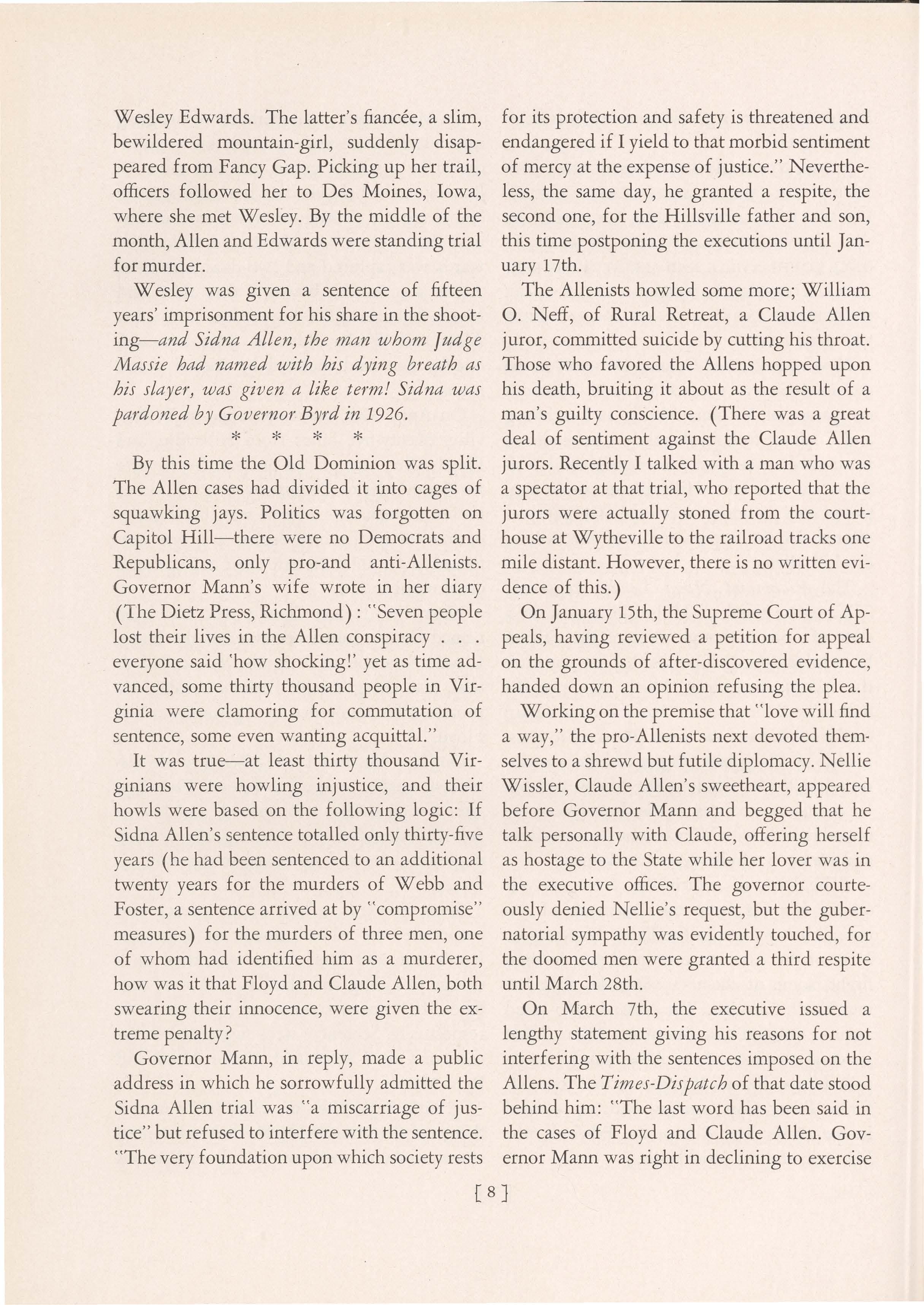 On March 7th, the executive issued a lengthy statement giving his reasons for not interfering with the sentences imposed on the Allens. The Times-Dis patch of that date stood behind him: "The last word has been said in the cases of Floyd and Claude Allen. Governor Mann was right in declining to exercise [ 8}