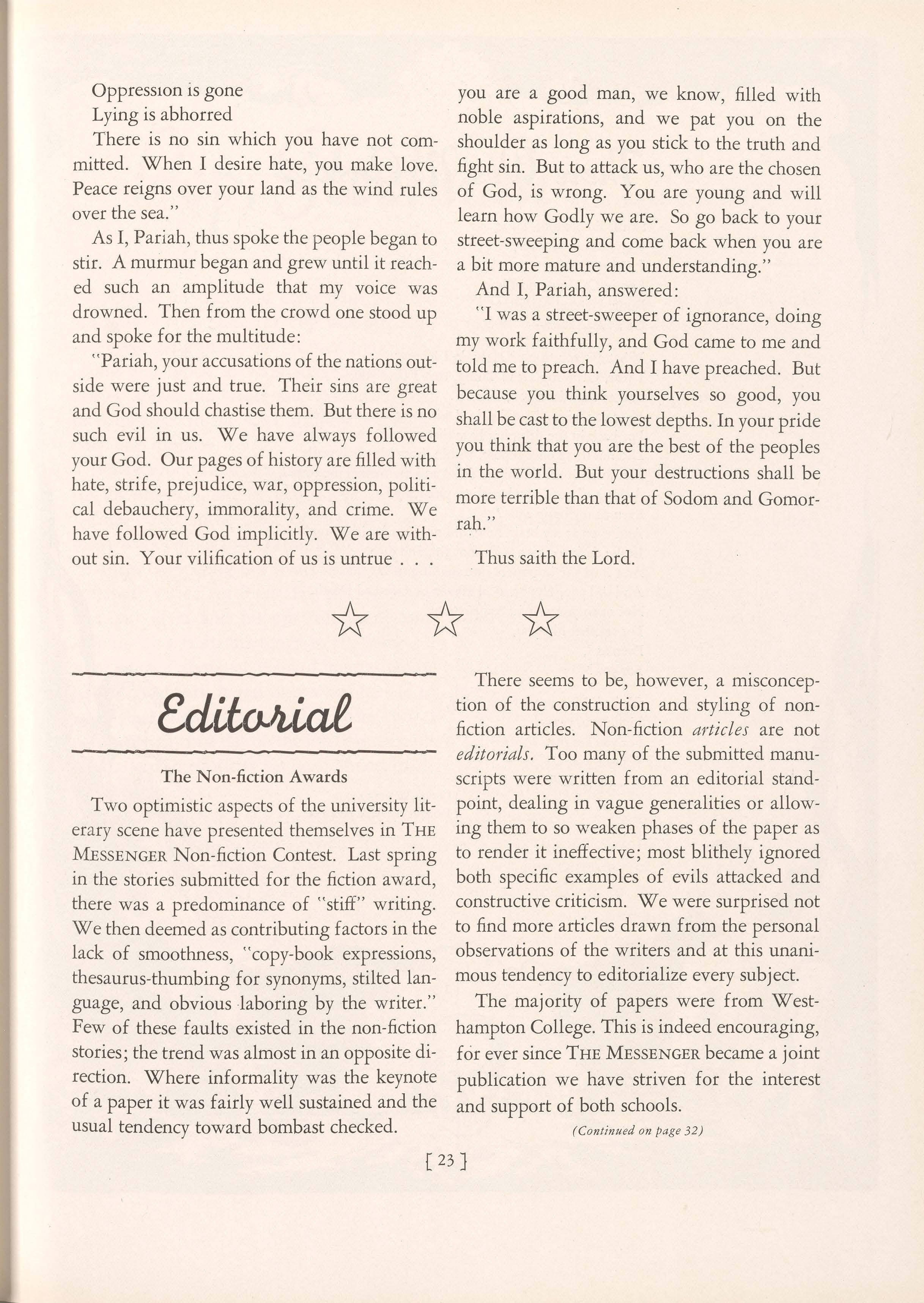 The deplorable feature of the contest was the paucity of manuscripts submitted. There should be no scarcity of literary talent on a campus as large and diversified as ours; yet contributors to the contest were almost too few to be representative. We can do but one thing: reiterate that THE MESSENGERis your literary publication, looking to you for support, giving every single manuscript full consideration with the hope that it might be presented to the university at large in our pages.