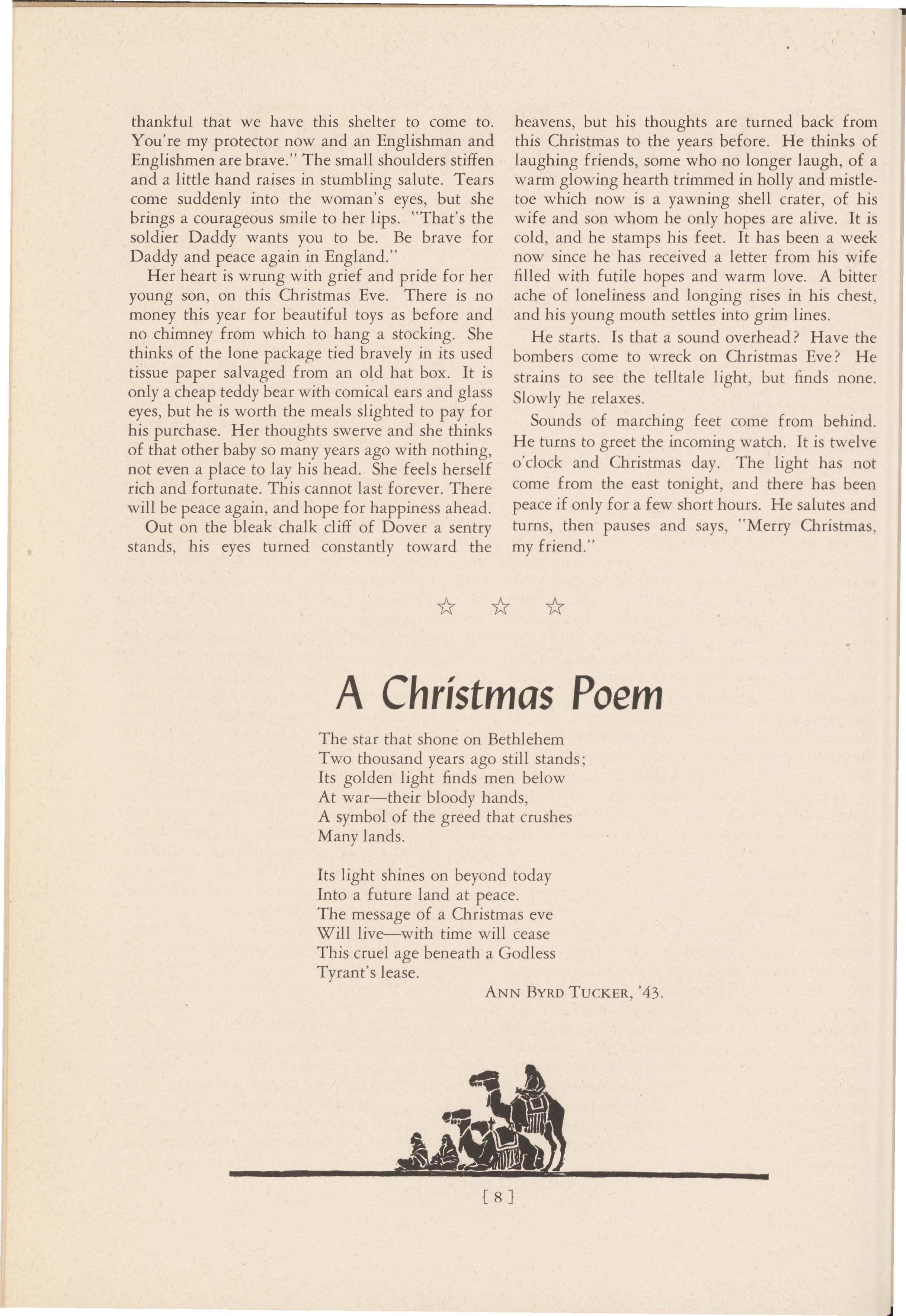 The real Christmas finds expression in the poem of Ann Byrd Tucker, no longer a newcomer to the magazine. . . . It is not difficult to see by Mark Willing's article that he spends much time in the air-usually before breakfast. Nanc y Master's poetry is a familiar asset to THE MESSENGER Lila Wicker campus representativ e to several nationally published magazines add s another manuscript to many already published in past years. The thought is timely and significant. ... Straughan Gettier's interest has not slackene d as his book review testifies. Once more Ben Rouzie' s humor comes to the rescue again in parody form. We must not forget the tru e Christmas message especially today. Billy Snow finds in it intrinsic worth for today.