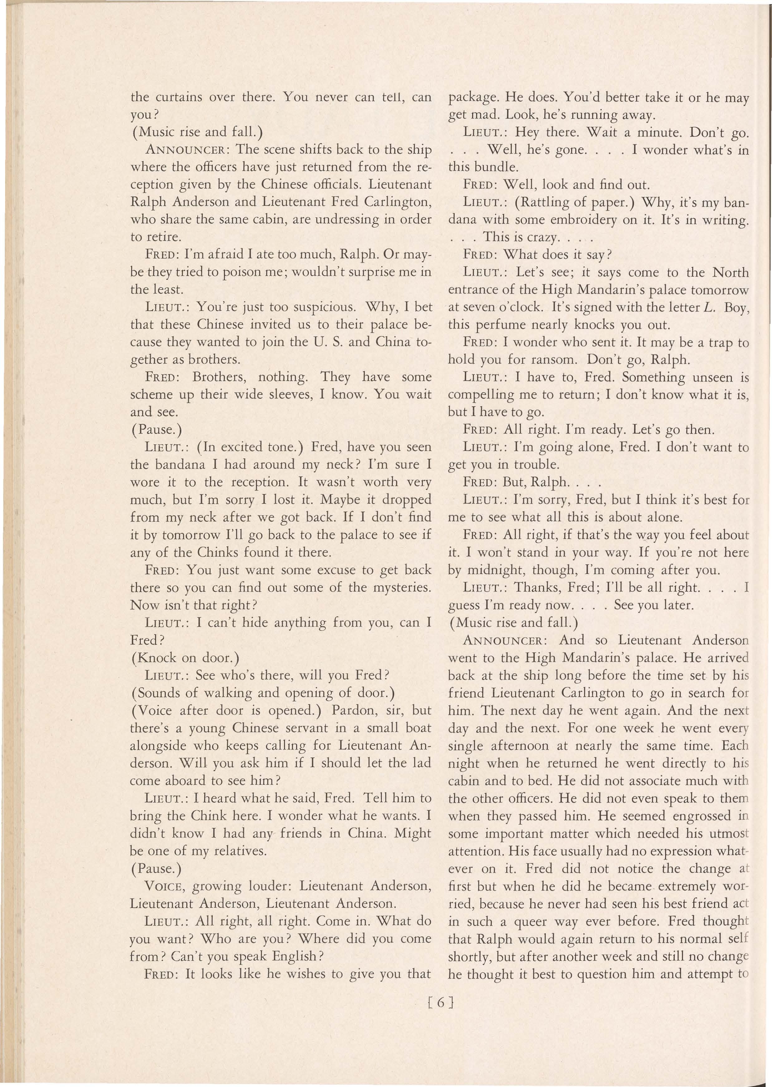 LIEUT.: Oh, there's nothing to be alarmed about. That noise we hear behind those curtains is probably coming from the Chinks' wives. Sounds as if they are trying to gaze upon us whitedevils without our seeing them. Can't you smell that perfume. Boy, if we got any closer the smell would more than likely knock us out or else make us dream we were in paradise. If only I could see one of the girls behind that silk.