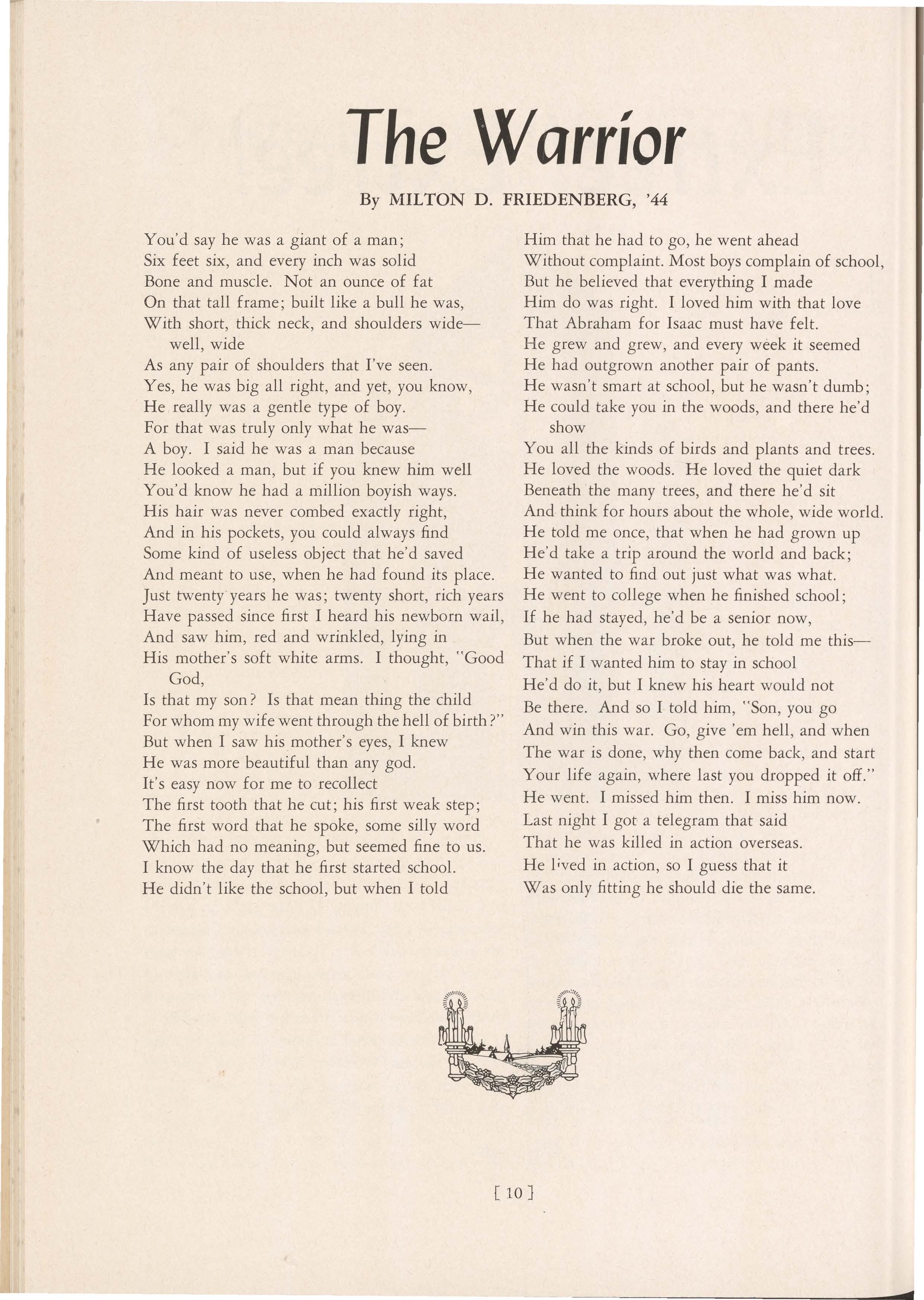 Friedenberg , a Junior , already known as a poet , writes again in his thought-provoking manner. Frances Kennard, a Junior with a poetic mind, thinks out loud about today. Ruth Smith, a Freshman and a newcomer, tells a timel y Christmas story . . . . Ben Rouzie , a Junior Journalist, characterizes again . . .. With much humor , Freshman Fishberg describes the typical colleg e girl's date Harold Brauer, radio announce r and playwright, presents a radio play in his distinctively dramatic style. . . . Jean Saperstine , Freshman, and new staff member , tells America t o wake up in a very unusual manner. Ernes t Mooney, Candidate for Uncle Sam ' s Army, contributes a Christmas story for his last issue. Betsy Rice, effectively describes Westhampton' s War drive in poetry and prose By his wellwritten review, Linwood Horne promises that ther e will be more from him in the future