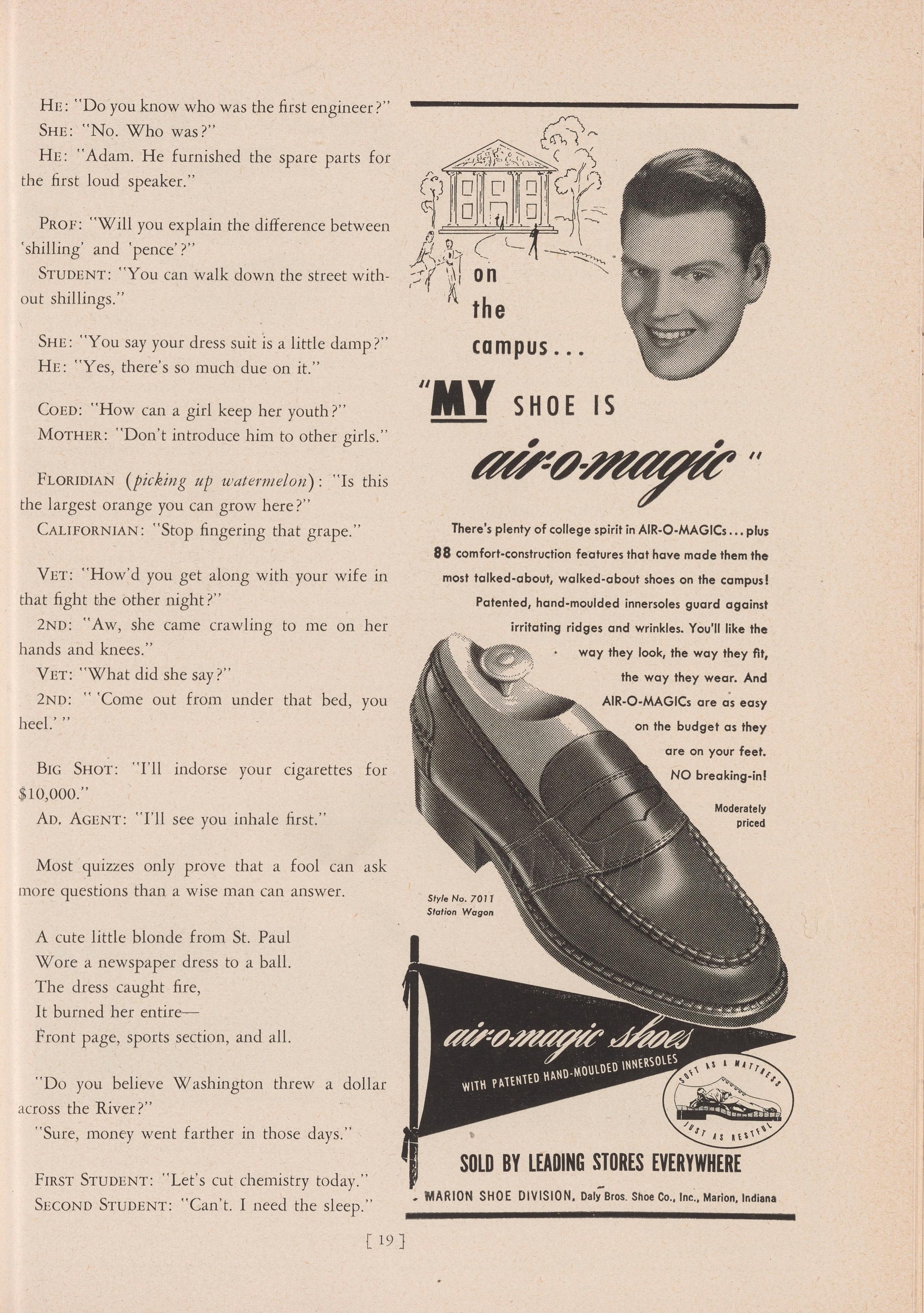 There's plenty of college spirit in AIR-0-MAGICs plus 88 comfort-construction features that have made them the most talked-about, walked-about shoes on the campus! Patented, hand-moulded innersoles guard against irritating ridges and wrinkles. You'll like the