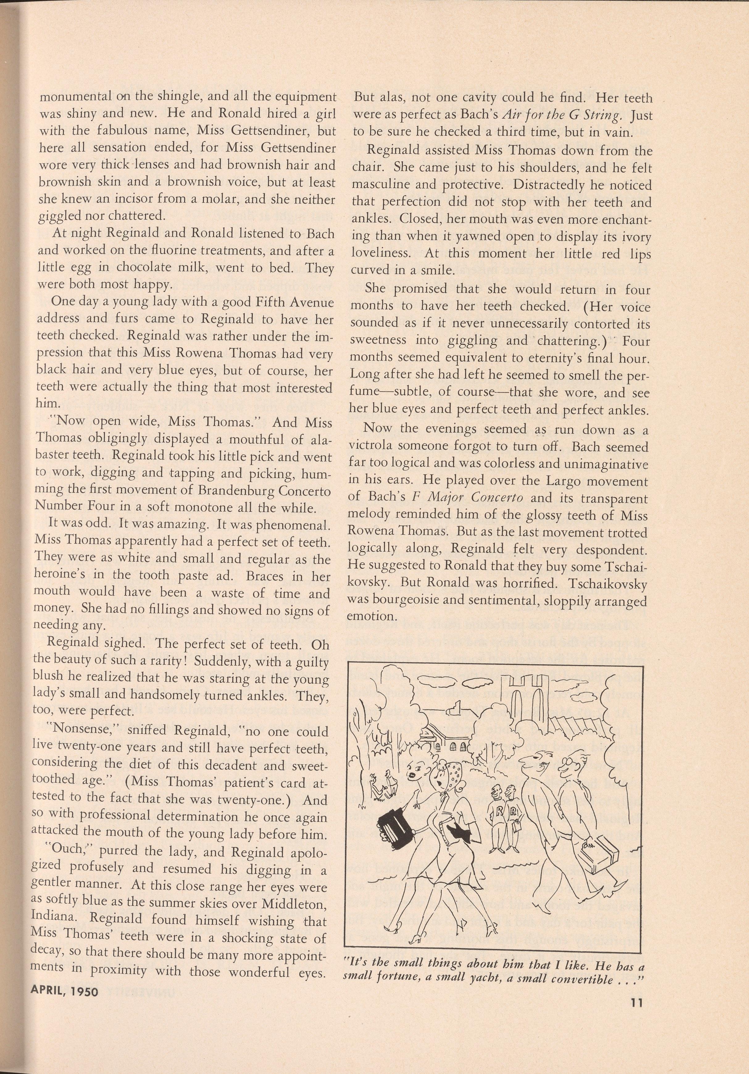 "Nonsense," sniffed Reginald, "no one could live twenty-one years and still have perfect teeth, considering the diet of this decadent and sweettoothed age." (Miss Thomas' patient's card attested to the fact that she was twenty-one.) And so with professional determination he once again attacked the mouth of the young lady before him.