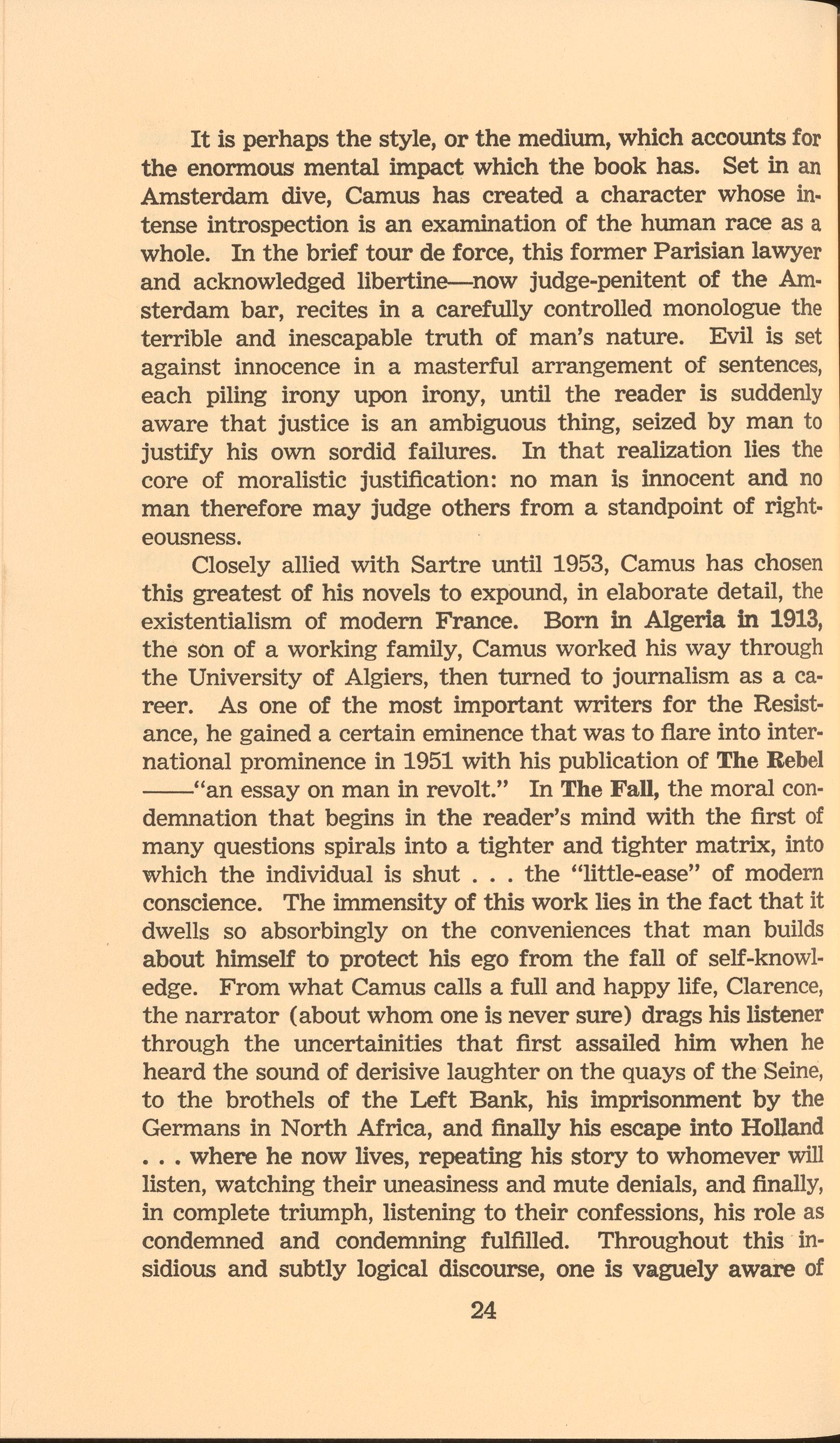 ing of a careless world. He is able to see far beyond the actual potents of a situation into the underlying psychological and spiritual abnormalities which force individuals into a mold of mass conformity. Rebellious to the point of eccentricity, the wreckage that he leaves behind points to a maturity of concept which few people achieve in a lifetime. His fiction involves a far deeper thought process than the world can absorb without completely unbalancing the multiplicity of its own confused complexes. Such a phenomena is evident in the suicide of Mr. Savage (Brave New World), whose internal combat is inexpertly meted against the overwhelming odds of a universe completely dominated by the sensuous expecta. tions of controlled existence.