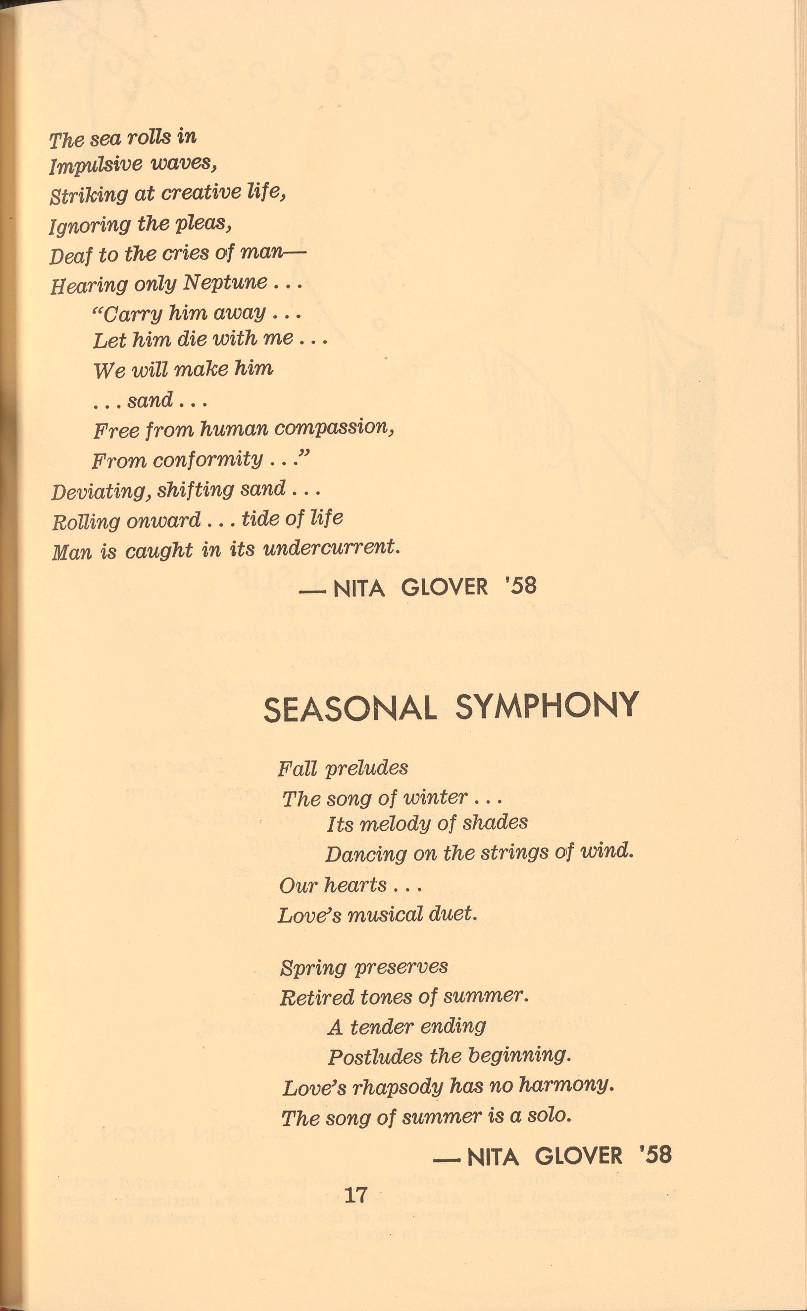 As the author of two poems appearing in the Folio section, Nita Glover makes her publication debut. A junior English major at West- hampton, Nita has worked this year on the magazine's critical staff.