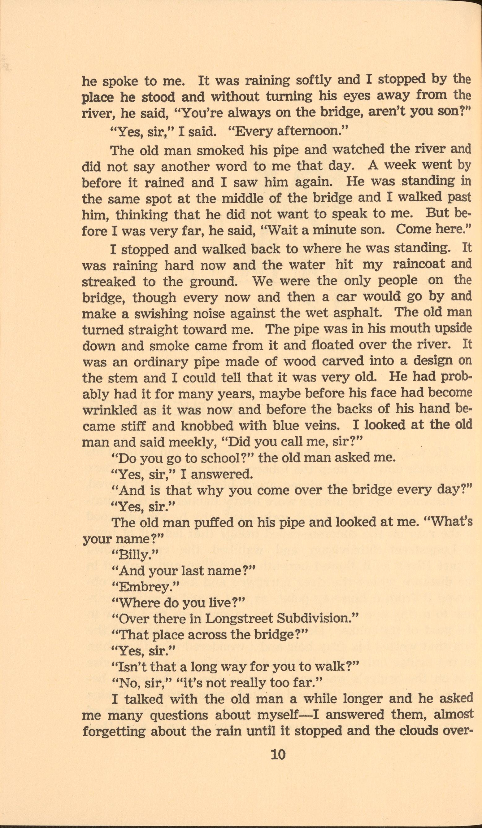 I stopped and walked back to where he was standing. It was raining hard now and the water hit my raincoat and streaked to the ground. We were the only people on the bridge, though every now and then a car would go by and make a swishing noise against the wet asphalt. The old man turned straight toward me. The pipe was in his mouth upside down and smoke came from it and floated over the river. It was an ordinary pipe made of wood carved into a design on the stem and I could tell that it was very old. He had probably had it for many years, maybe before his face had become wrinkled as it was now and before the backs of his hand became stiff and knobbed with blue veins. I looked at the old man and said meekly, "Did you call me, sir?"