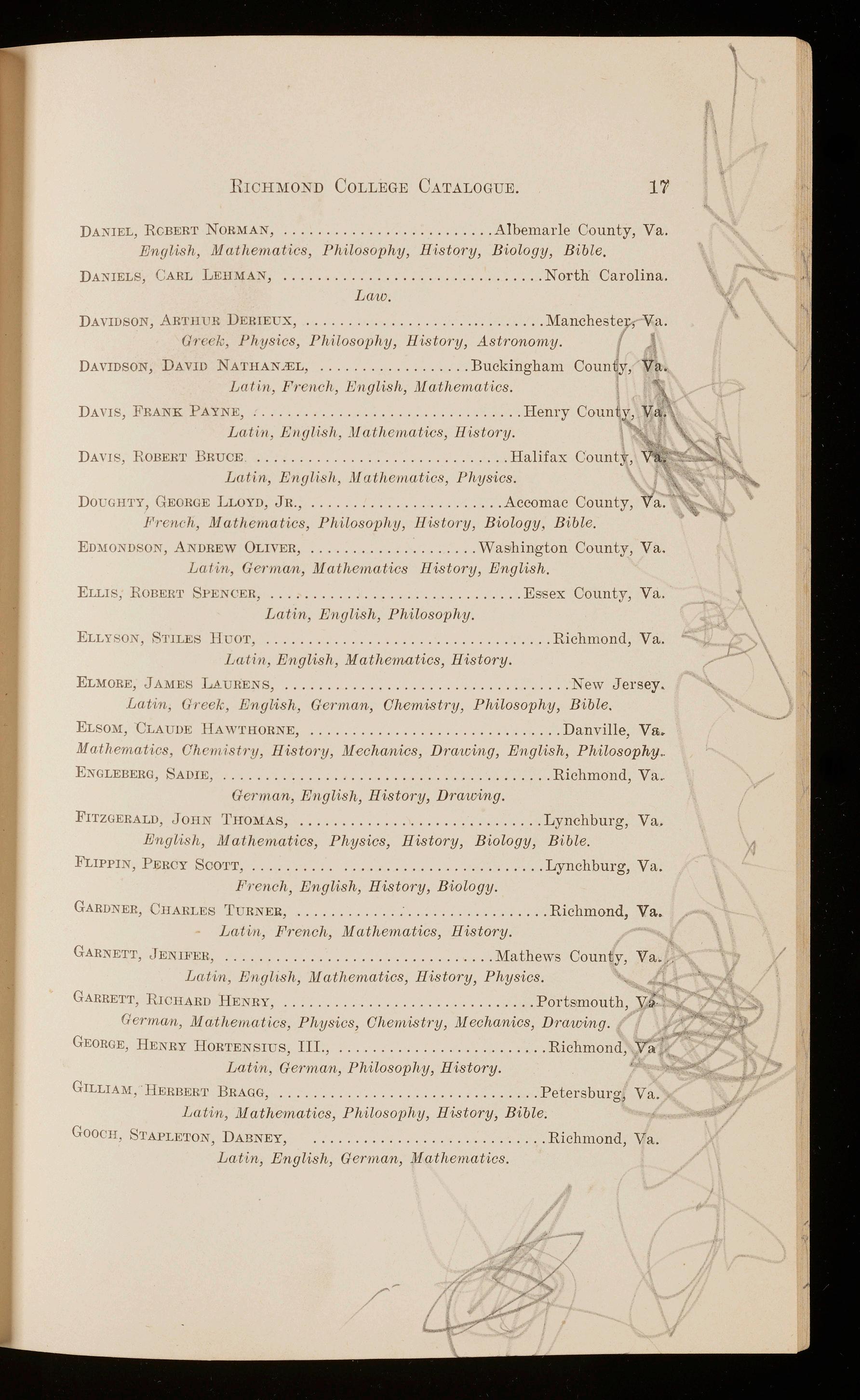 A B. Hampden-Sidney College, 1854; l\1. A. Uni ve rsity of Virginia, 1857; LL. D. H am pd en - Sidney, 1883; Aisistant Pr ofe s so r, Hamµd en -Si d ney, 1854- 1 55 ; Prof esso r Tran ~yivania U niversity , 1857-'5 8 j Pre s ident Richmo, d Female Inst itute , 1859 - '73 ; Professor of Phy sics s ince 1873