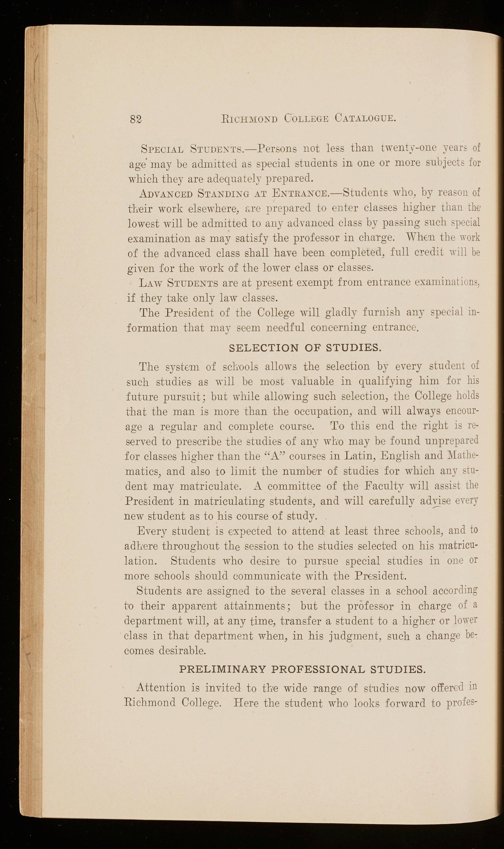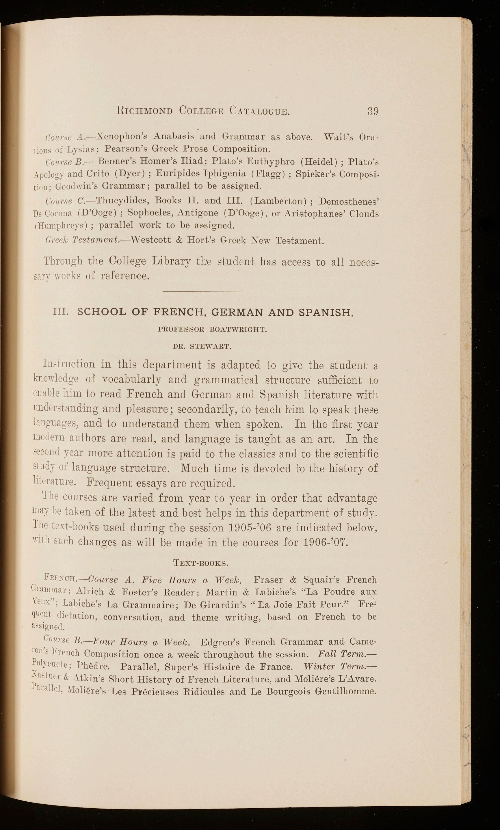 The conrse of study in the Academy begins with simple lessons in Eng li sh suited for boys ten to twelve year& of age and ends w i t h studies in La t in, Greek, English, Mathematics, History, French, German and Science t h at fit boys to enter the classes of Richmond College or other institutions of li ke grade. The fees a r e very moderate.