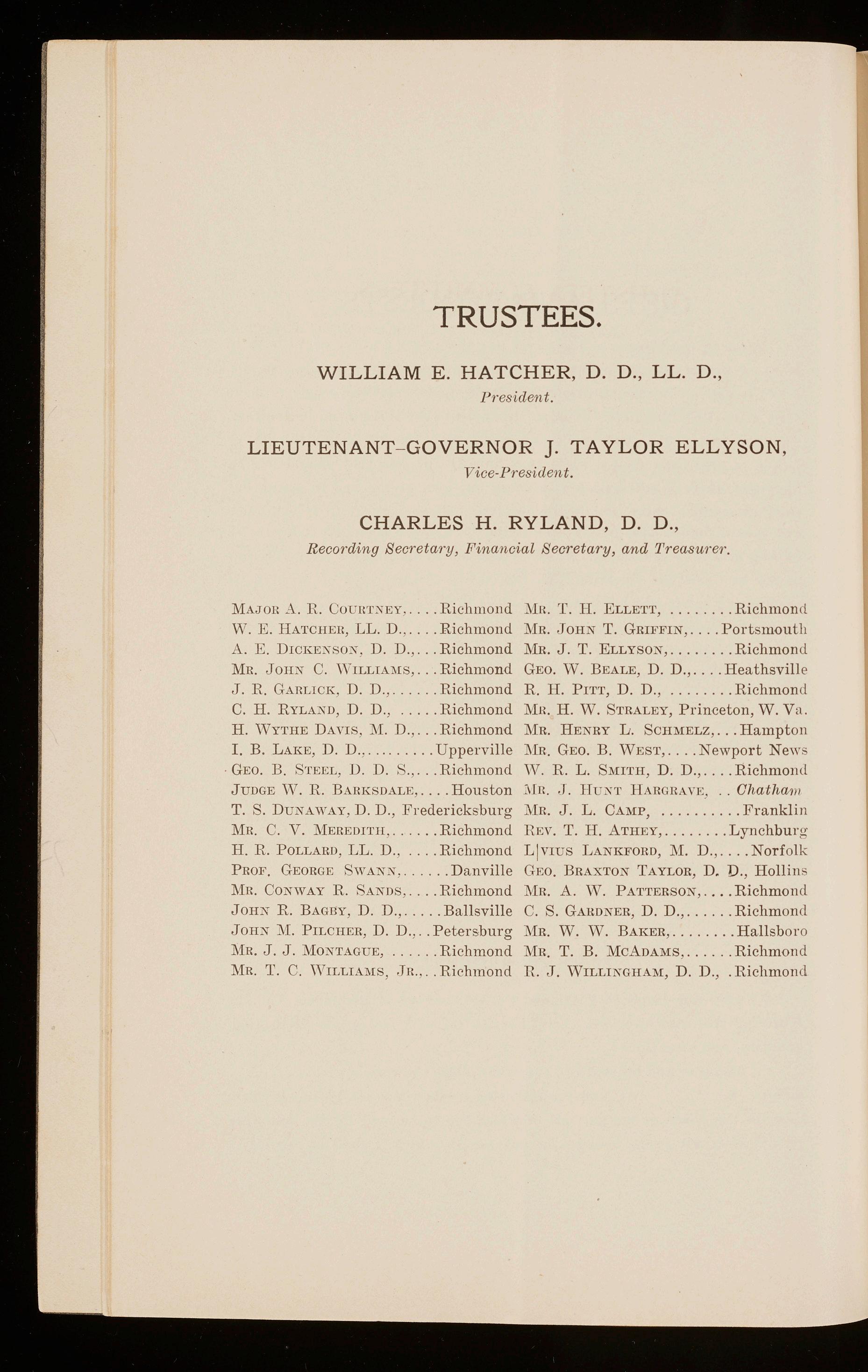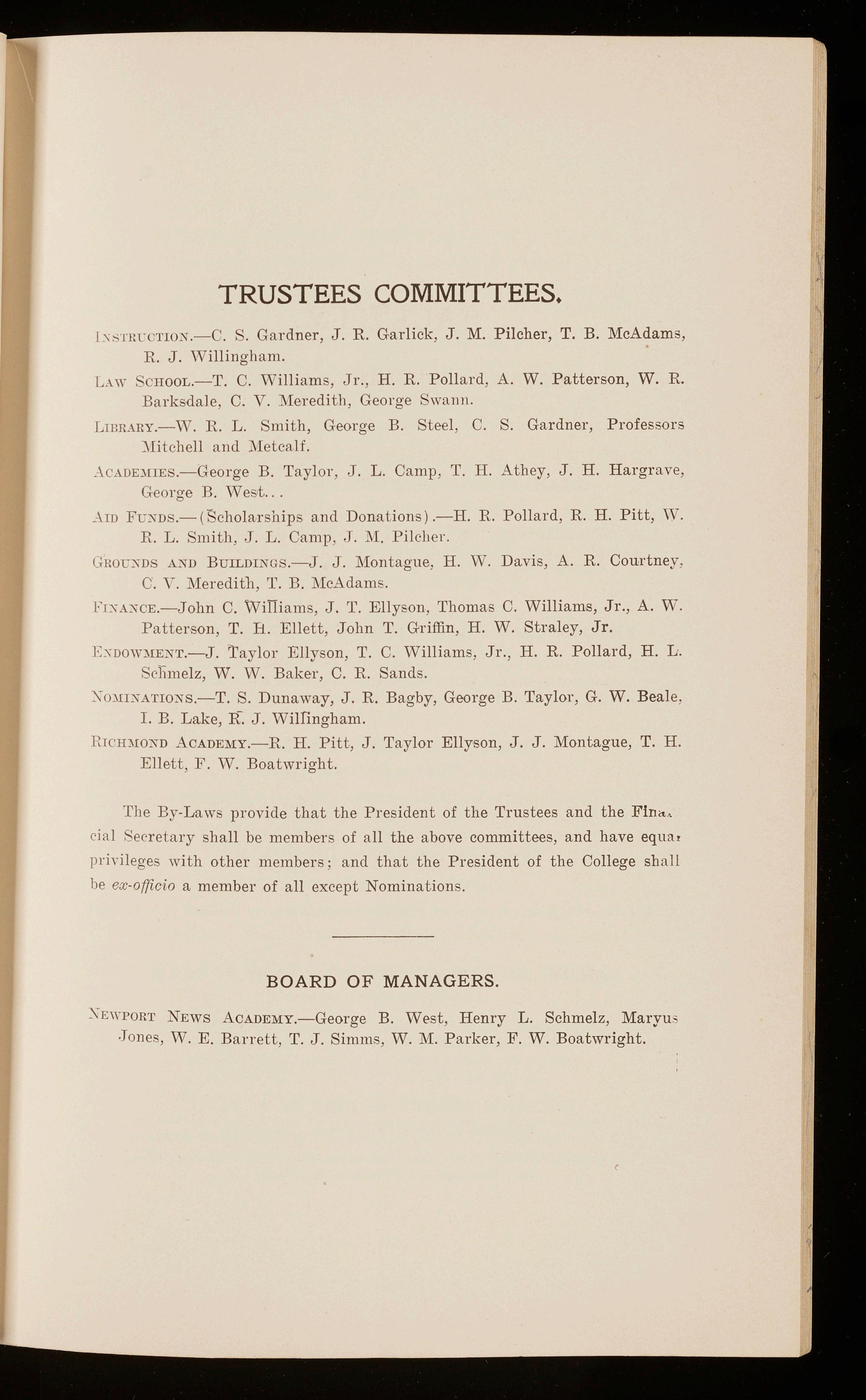 F1'\.\XCE.-Jo hn C. WiITiam s, J T. Elly so n, Thomas C. Williams, Jr. , A. W. Patle r so n , T. Ii. Ellett, John T. Griffin, H. W. Straley, Jr. 1•:'\oo,nrnx T.-J. Taylor Ellyson, T. C. Williams, Jr. , H. R. Pollard, H. L Srlime lz , W. W. Baker, C. R. Sands. Xo.,nXATIOc\'S.- T. S. Dunaway, J . R. Bagby, George B. Taylor, G. W. Beal e. I. B. Lake, If. J. Wilfingham. l:rcmwx o ACADEMY.-R. H. Pitt, J. Taylor Ellyson, J. J. Montague, T. H. Ellett, F. W. Boatwright.