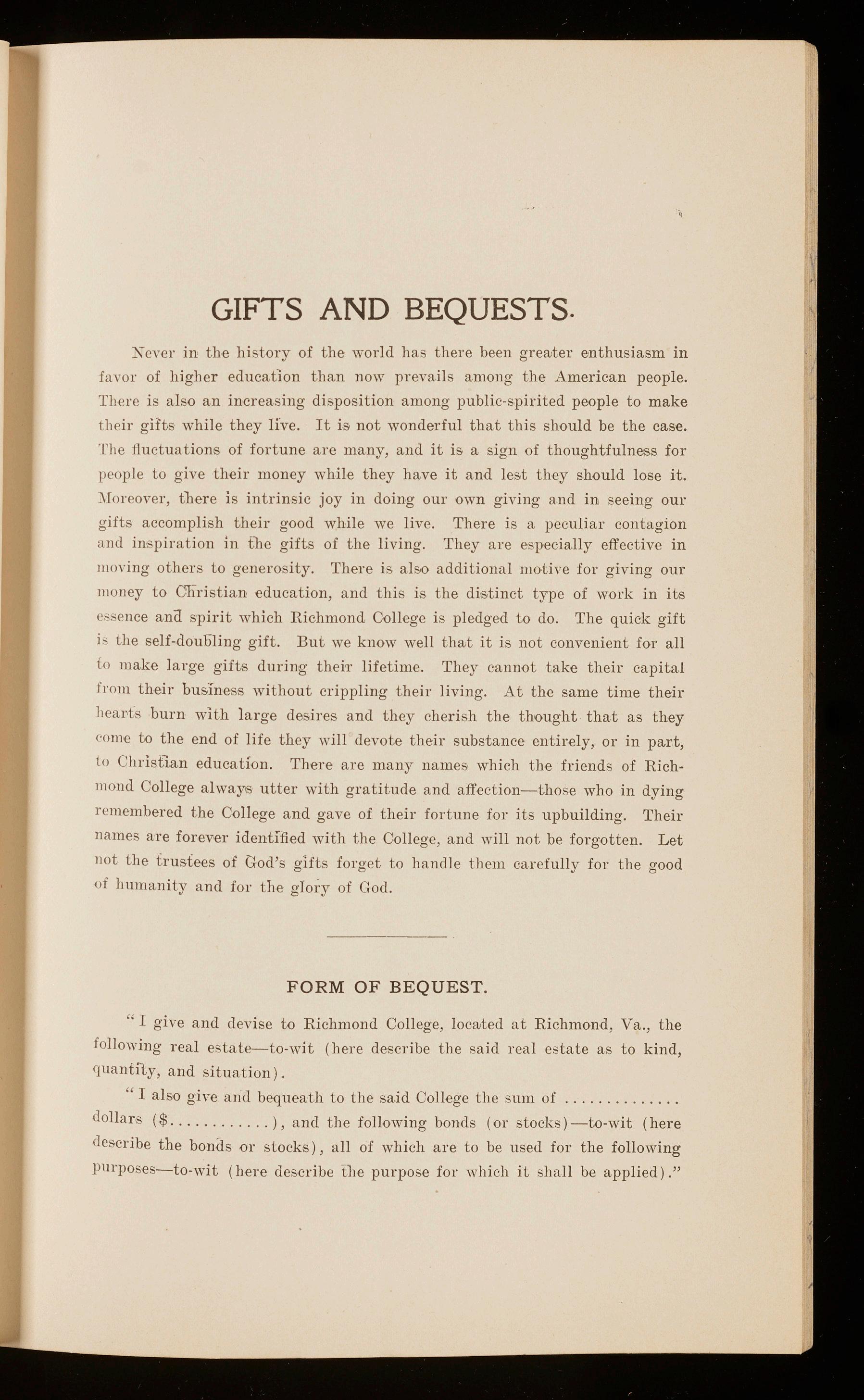 XeYer in the history of the ,Yorld has there been grea,ter enthusiasm in farnr of higher education than now preYails among the American people There is also an increa siJ1g disposition among public-spirited people to make their giits while they live. It is, not wonderful that this should be the case. The fluctuations of fortune are many, and it is, a sign of thoughtfulness for people to give their money while they have it and lest they should lose it. J[orcover, t11ere is intrinsic joy in doing our own giving a nd in seeing our gifts accomplish their good while we live. There is a peculiar contagion and in sp iration in t1ie gifts of the living. They are especially effective in n101ing ot her s to generosity. There i s aloo additional motirn for giving our money to CTiristian education, and this is the distinct type of work in its b,e nce ana spirit which Richmond College i s pledged to do. The quick gift i, the self-douoling gift. But we know well that it is not convenient for all (o make large gifts during their lifetime. They cannot take their capital from their bus,"iness without crippling their living. At the same time their hearts burn with large desires and they cherish the thought that as they c·omc to the end of li fe they will devote their s,ubstance entirely, or in part, lo Chdst1an education. There are many name s which the friends of Rich111onclCollege alwa3,s utter with gratitude and affection-those who in dying remembered the College and gave of their fortune for its upbuilding. Their names are forever identHied with the College, and will not be forgotten. Let not the £rusfees of God's gifts forget to handle them carefu ll y for the good of humanity and for the glory of God.
