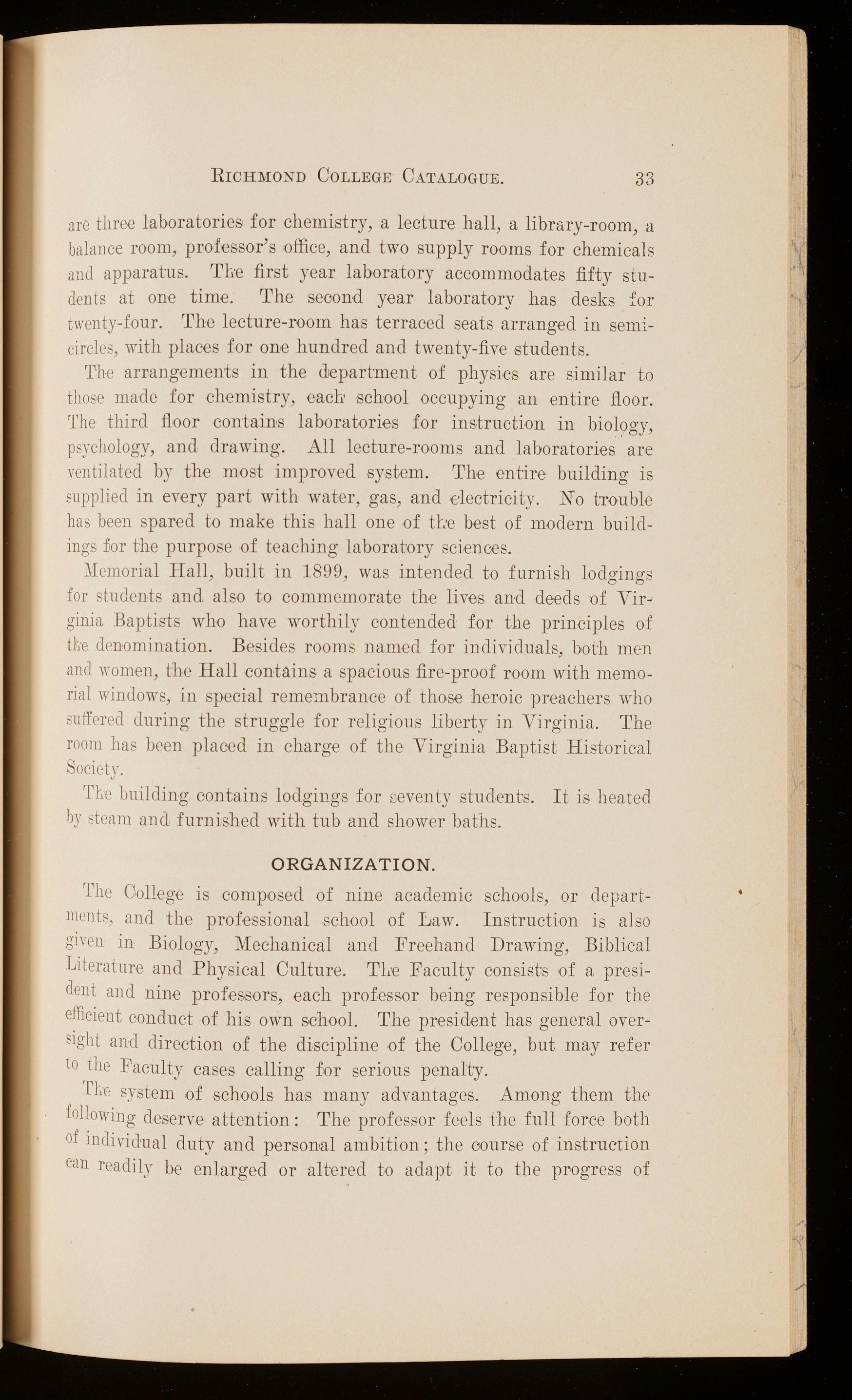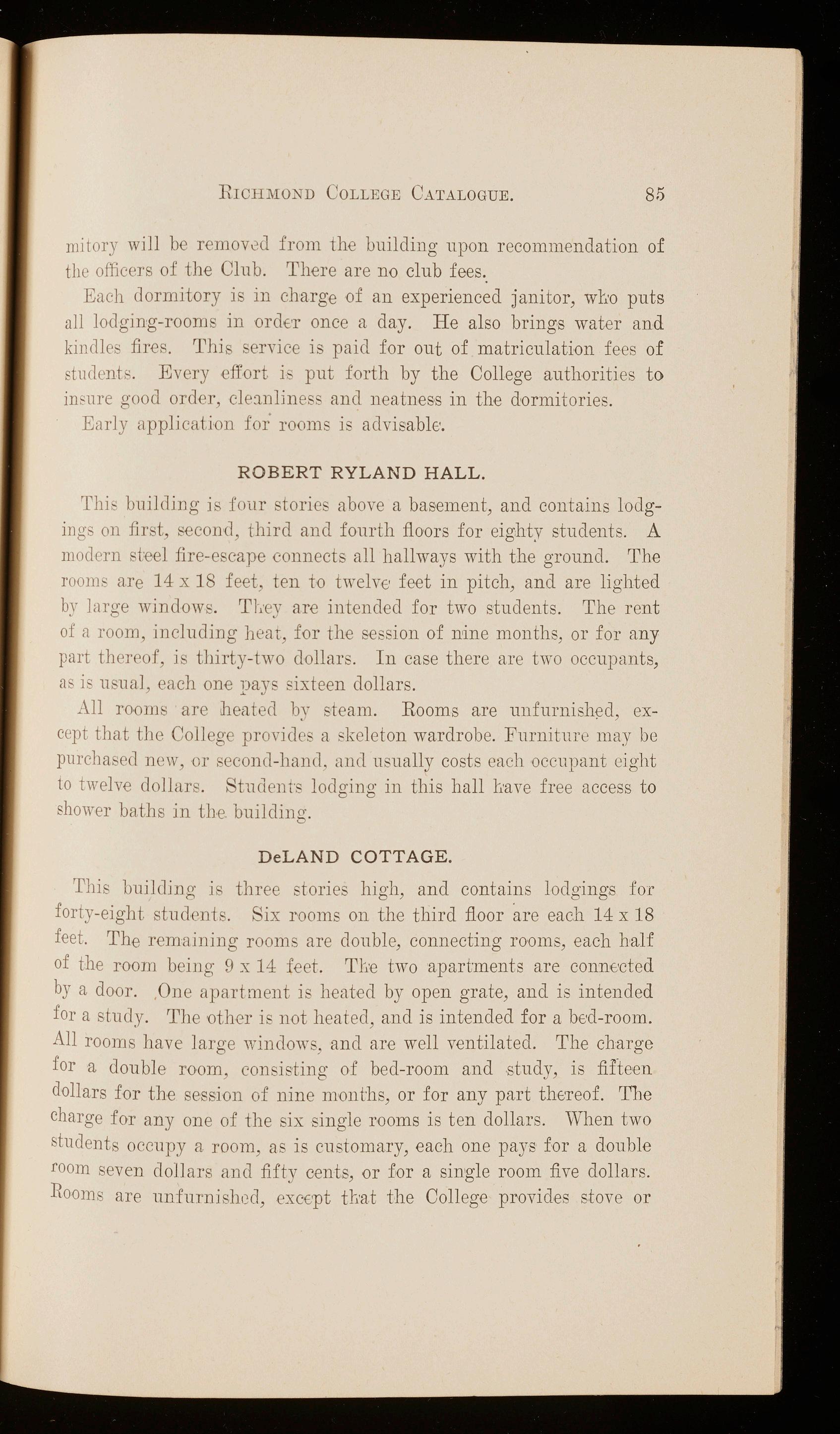 In September, 1902, the Trustees of Richmond College established RICHMONDACADEMY,a secondary schoo l for boys. The two bui l dings - one containing a large study hall anu four class-Tooms, and the ot h er a gymnasiumare located two squares south of the College on Lombardy Street and Pa r k Avenue. The buiiaings are new, fitted up with single desks a n d modern equipmen t. In 1905-'06 the enrollment was 76. The Academy can accommodate !JOboys.
