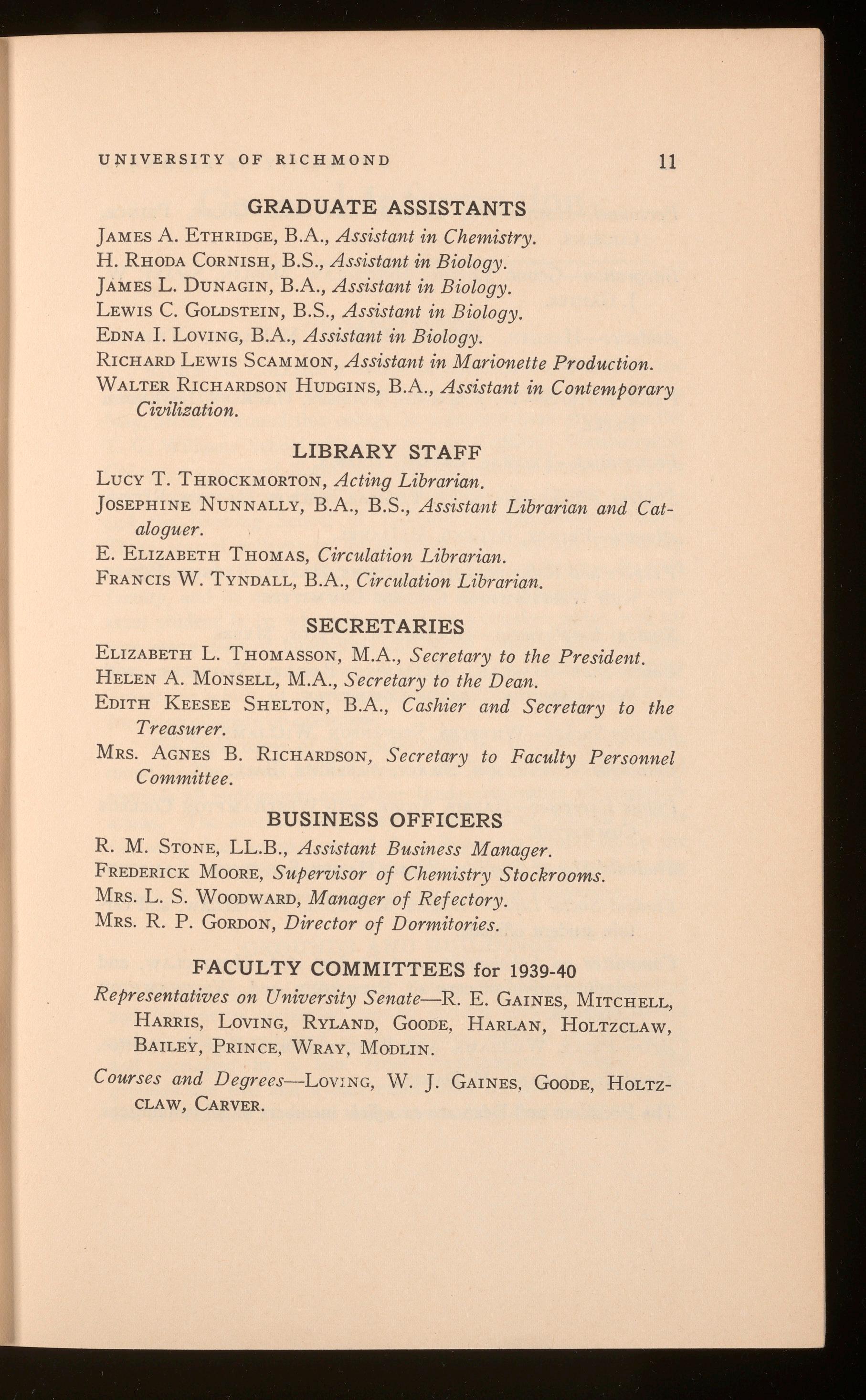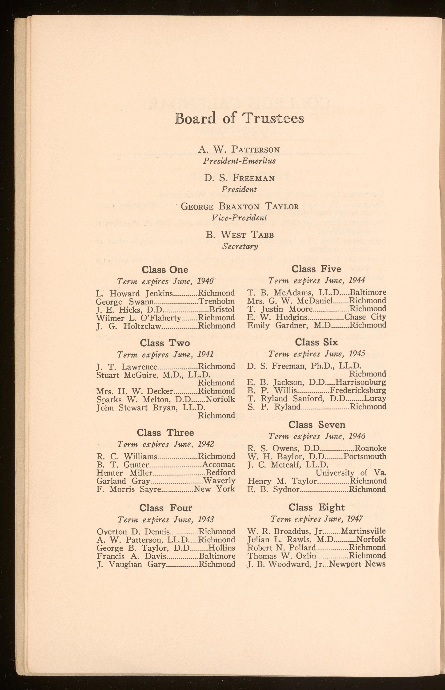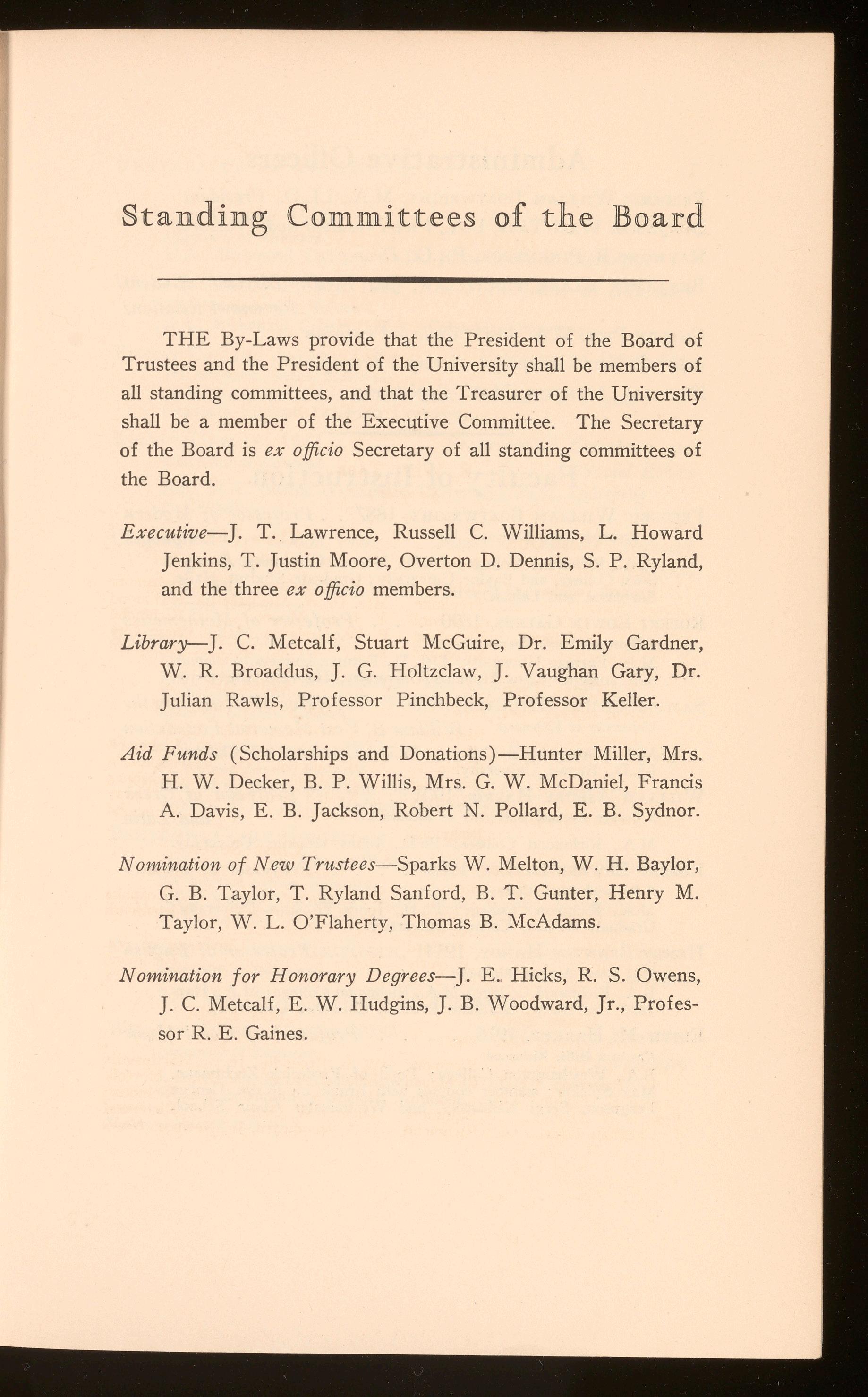Aid Funds (Scholarships and Donations)-Hunter Miller, Mrs. H. W. Decker, B. P. Willis, Mrs. G. W. McDaniel, Francis A. Davis, E. B. Jackson , Robert N. Pollard, E. B . Sydnor.