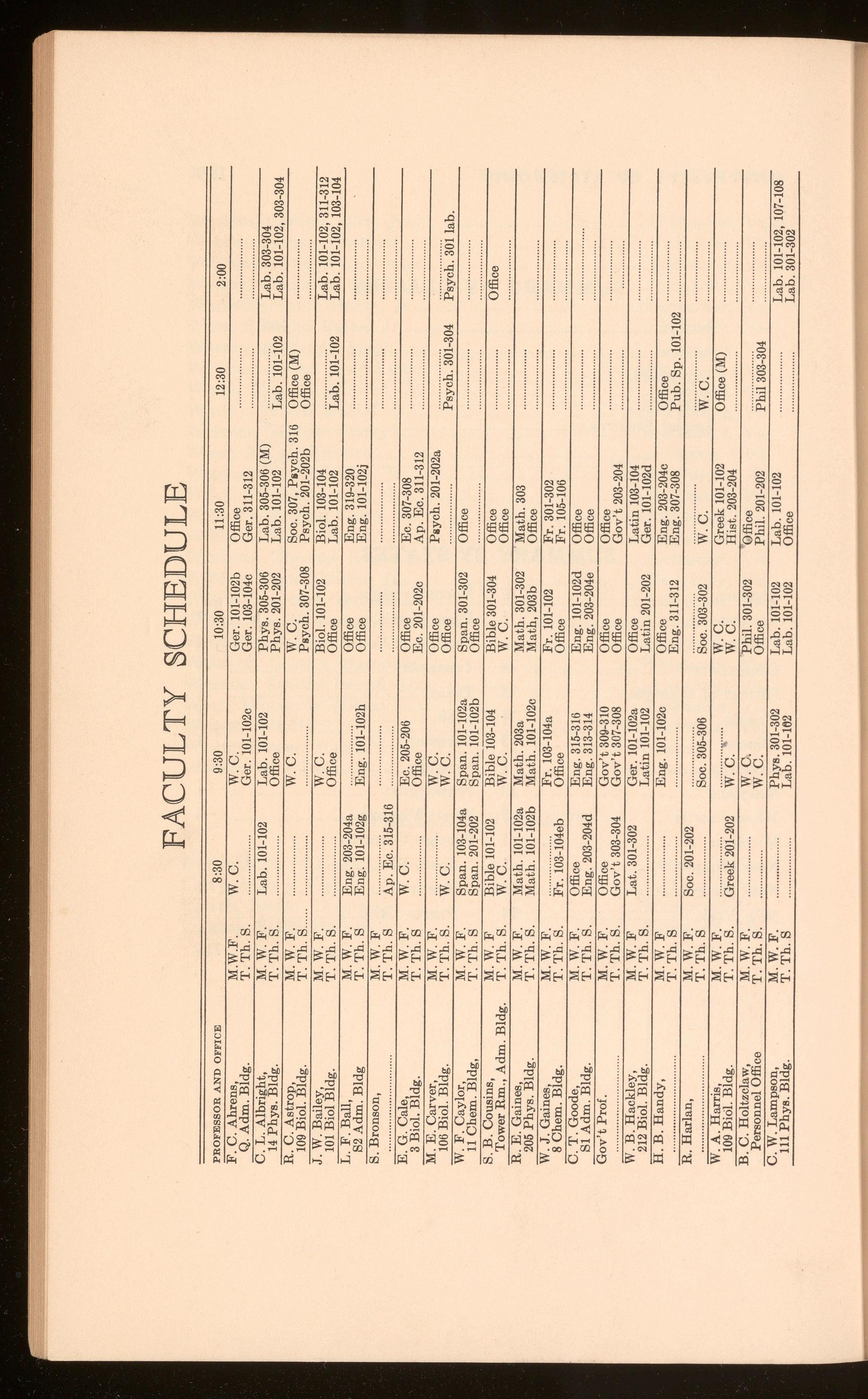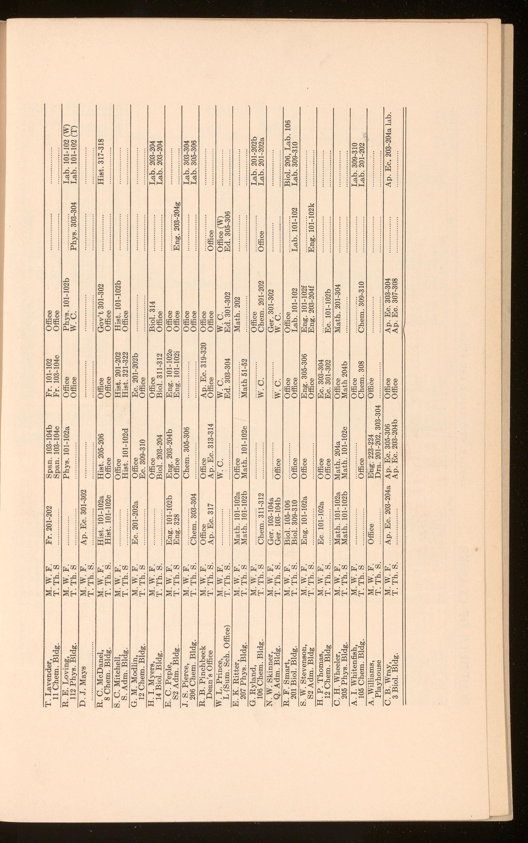 106 Biol. Bldg. T.Th.S. w.c. Office W. F. Caylor, M.W.F. Span. 103-104a Span. 101-102a Span. 301-302 11 Chem. Bldg, T. Th. S Span. 201-202 Span. 101-102b