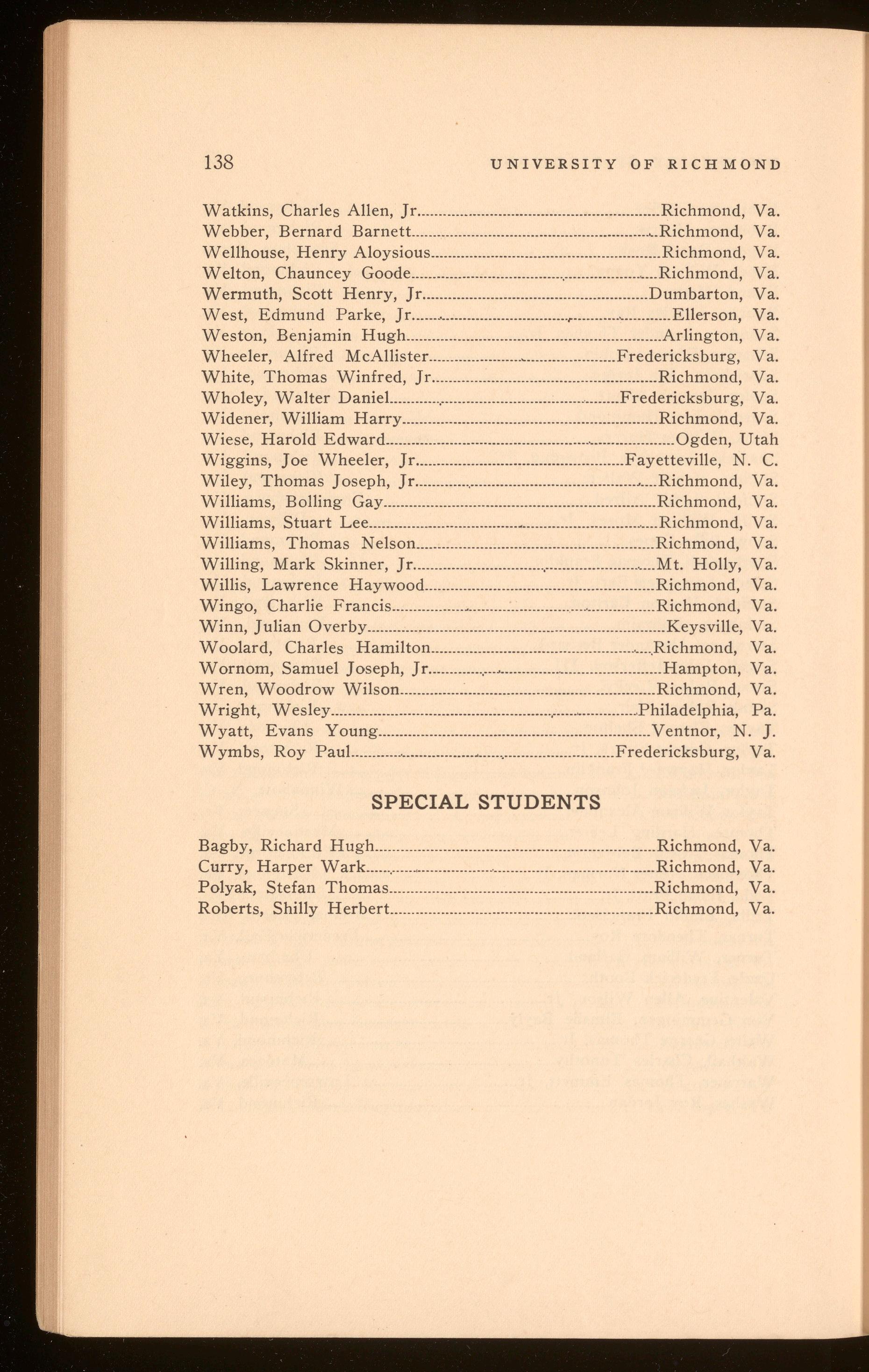 Wholey, Walter Daniel... ........ Fredericksburg, Va. Widener, William Harry ............................................................ Richmond, Va. Wiese, Harold Edward ................................................, ................... Ogden, Utah Wiggins, Joe Wheeler, Jr ................................................. Fayetteville, N. C. Wiley, Thomas Joseph, Jr .....................................................,.... Richmond, Va. Williams, Bolling Gay ................................................................ Richmond, Va. Williams, Stuart Lee .............·-·
