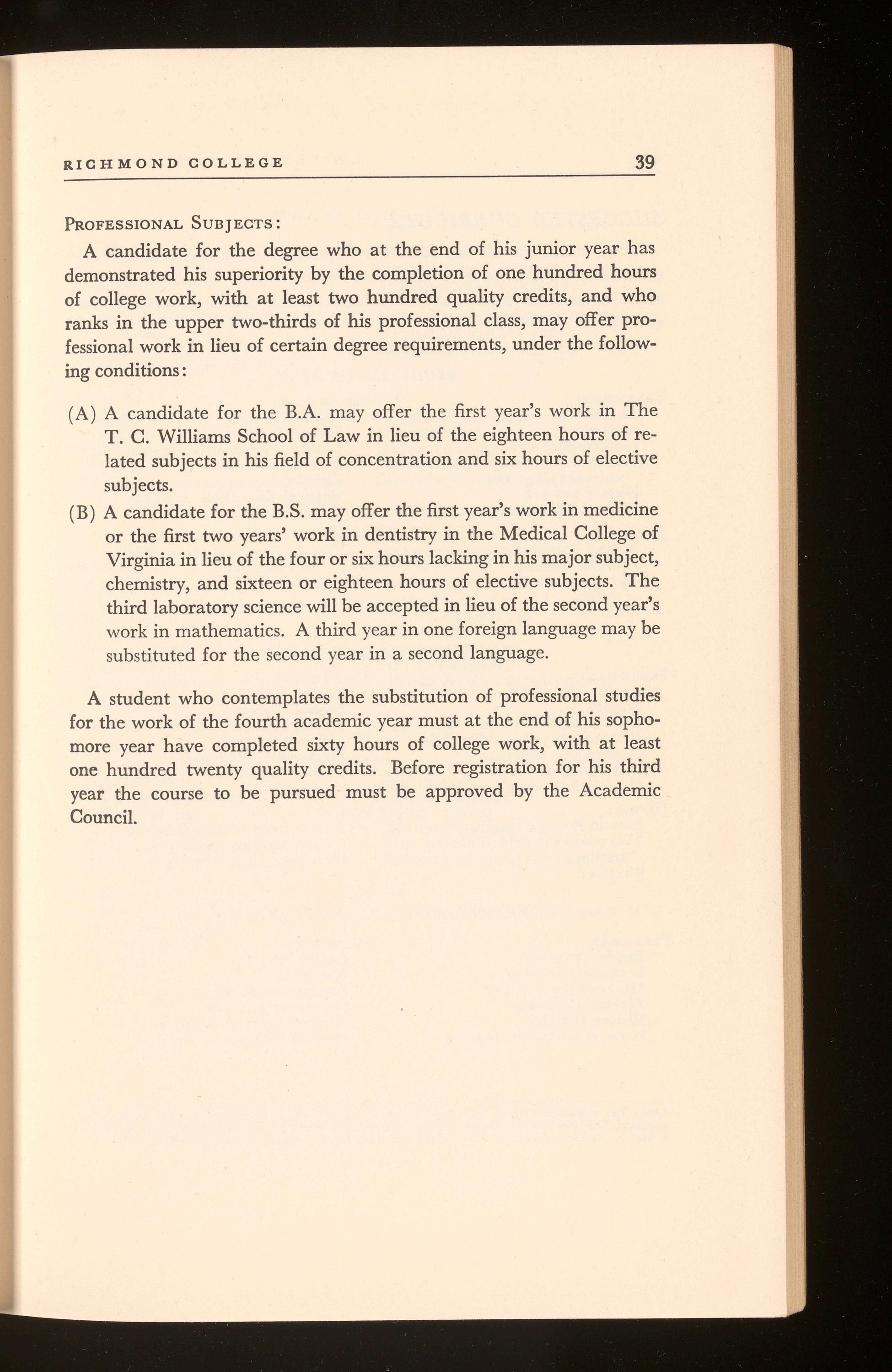 Th e School of Business Administration is designed to serve both full-time and part-time students. Full-time students who desire to work for the degree Bachelor of Science in Business Administration are eligible to enter the Business School upon the completion of sixty hour s of work (including six in principles of economics or its equivalent) with sixty quality credits. This preliminary work in liberal arts courses can be taken at Richmond College or any other accredited school.