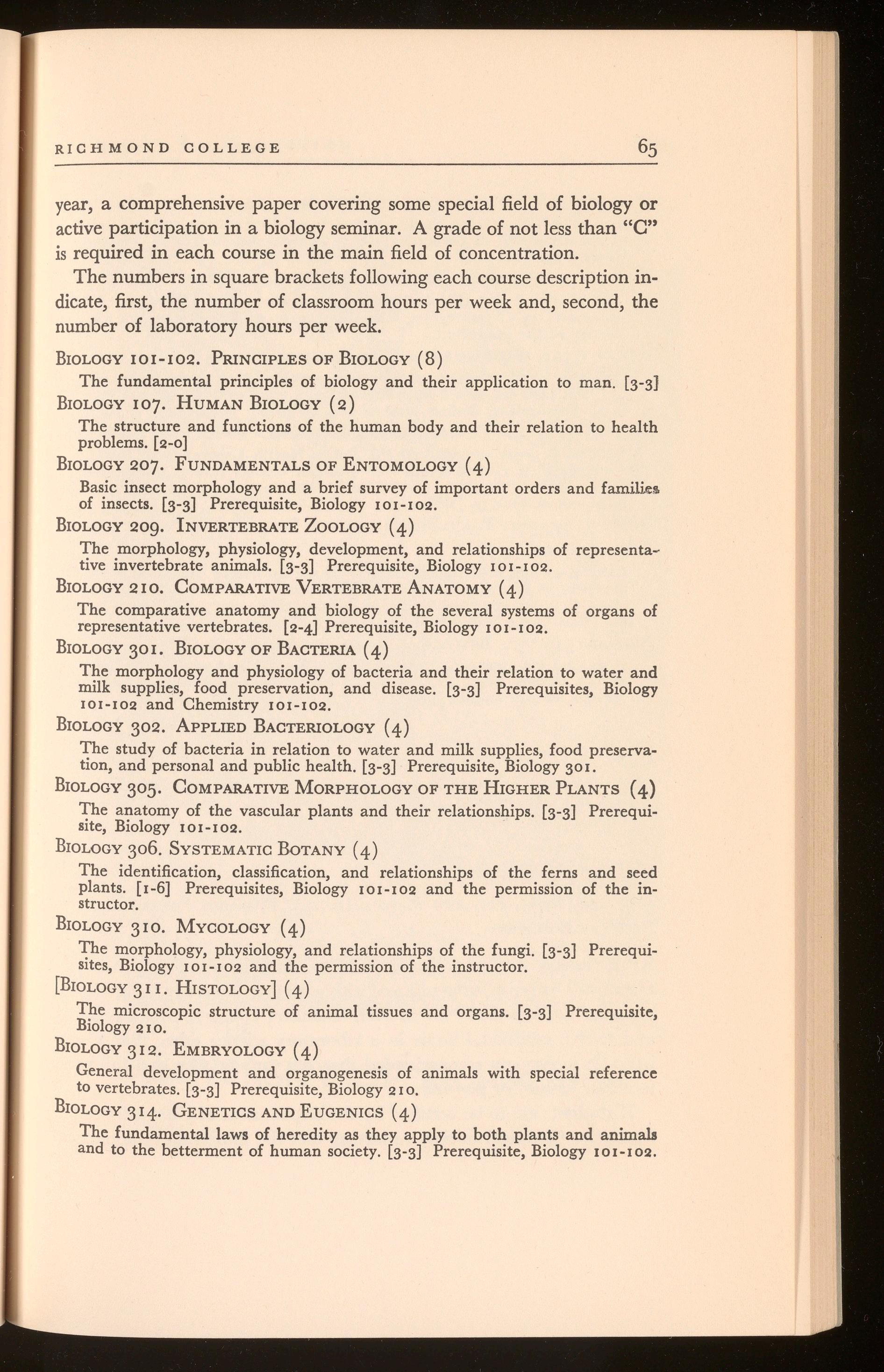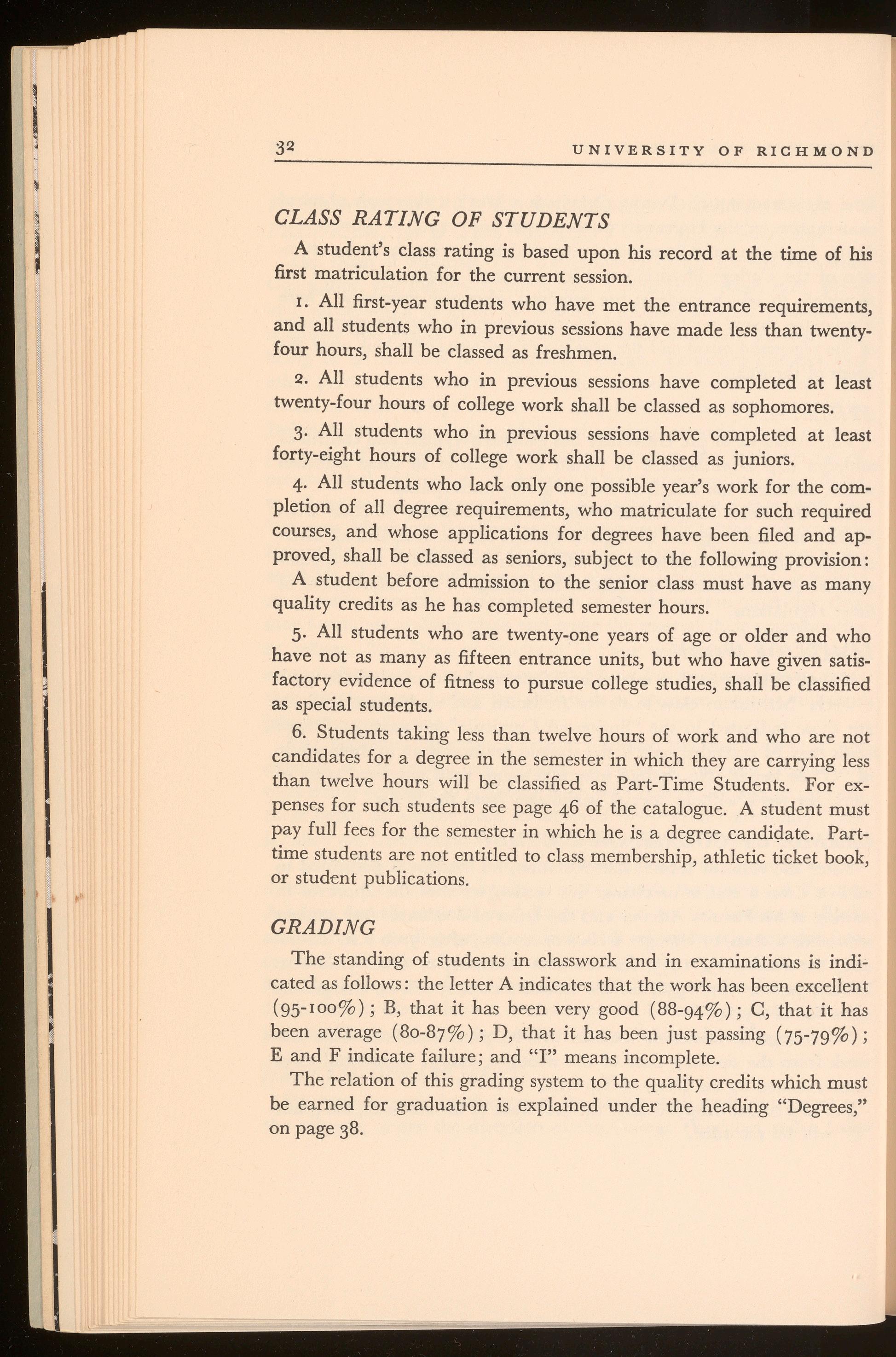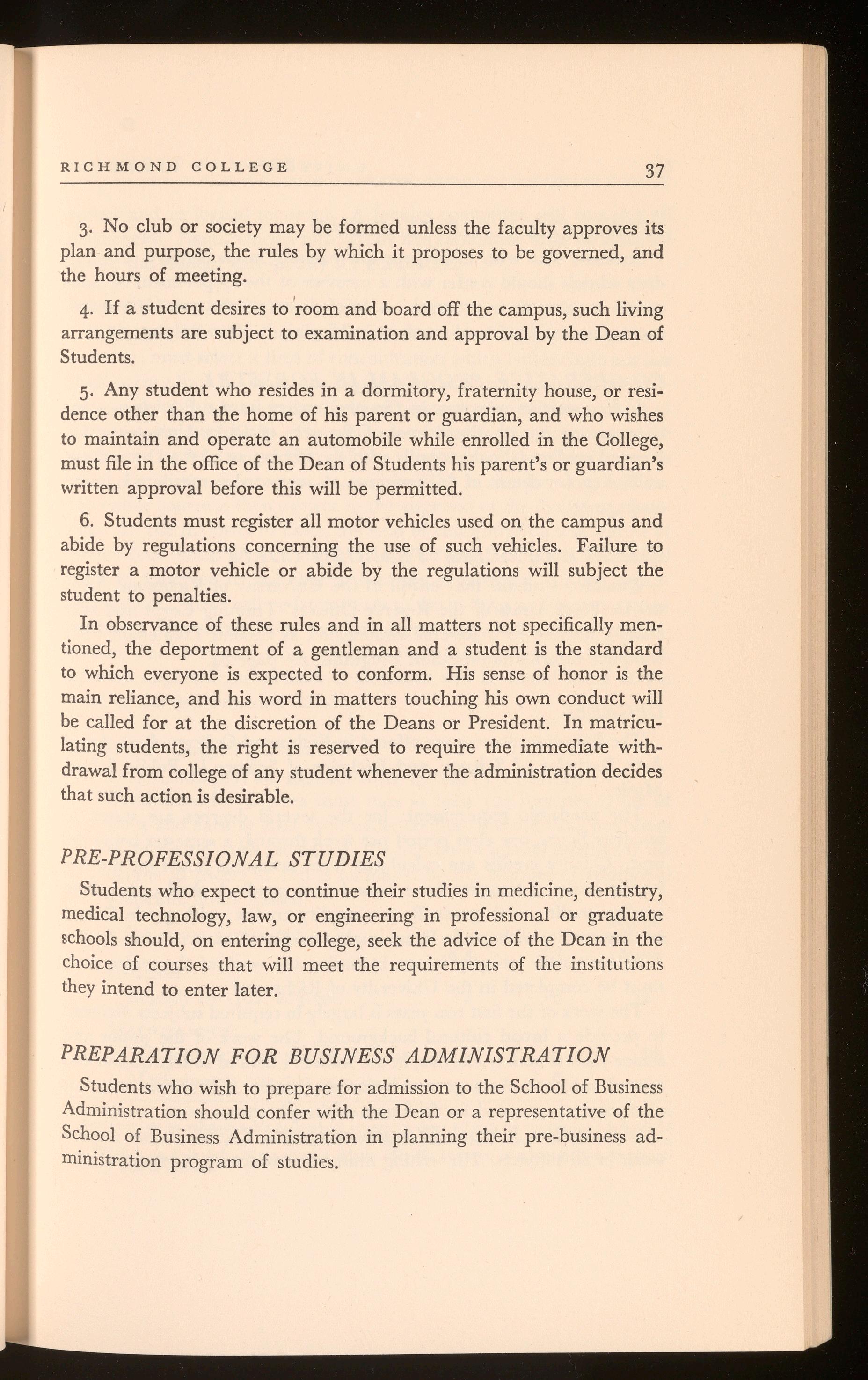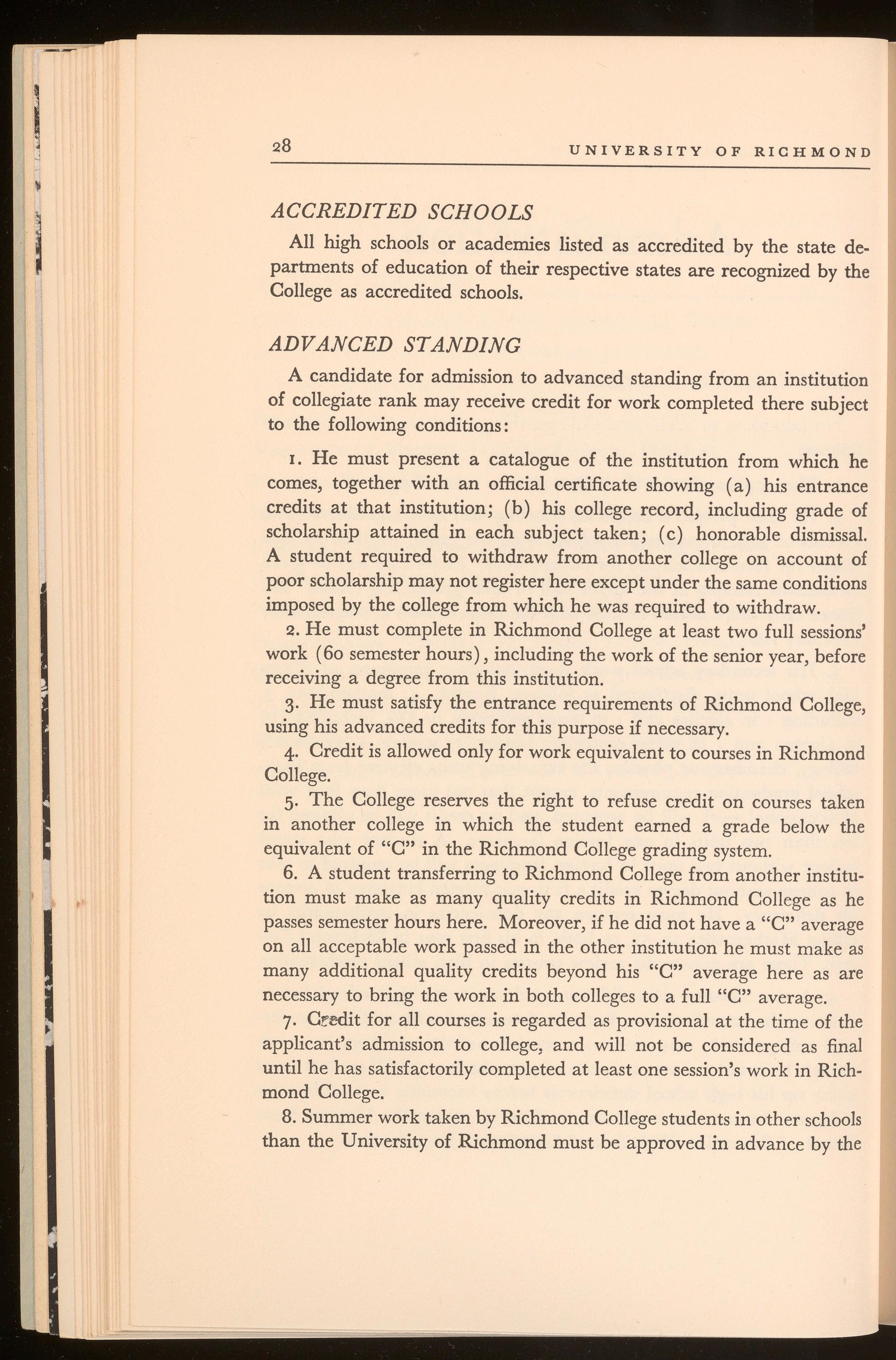 The School of Business Administration is designed to serve both full-time and part-time students. Full-time students who desire to work for the degree of Bachelor of Science in Business Administration are eligible to enter the Business School upon the completion of sixty hours of work (including six in principles of economics or its equivalent) with sixty quality credits. This preliminary work in liberal arts courses can be taken at Richmond College or any other accredited school.