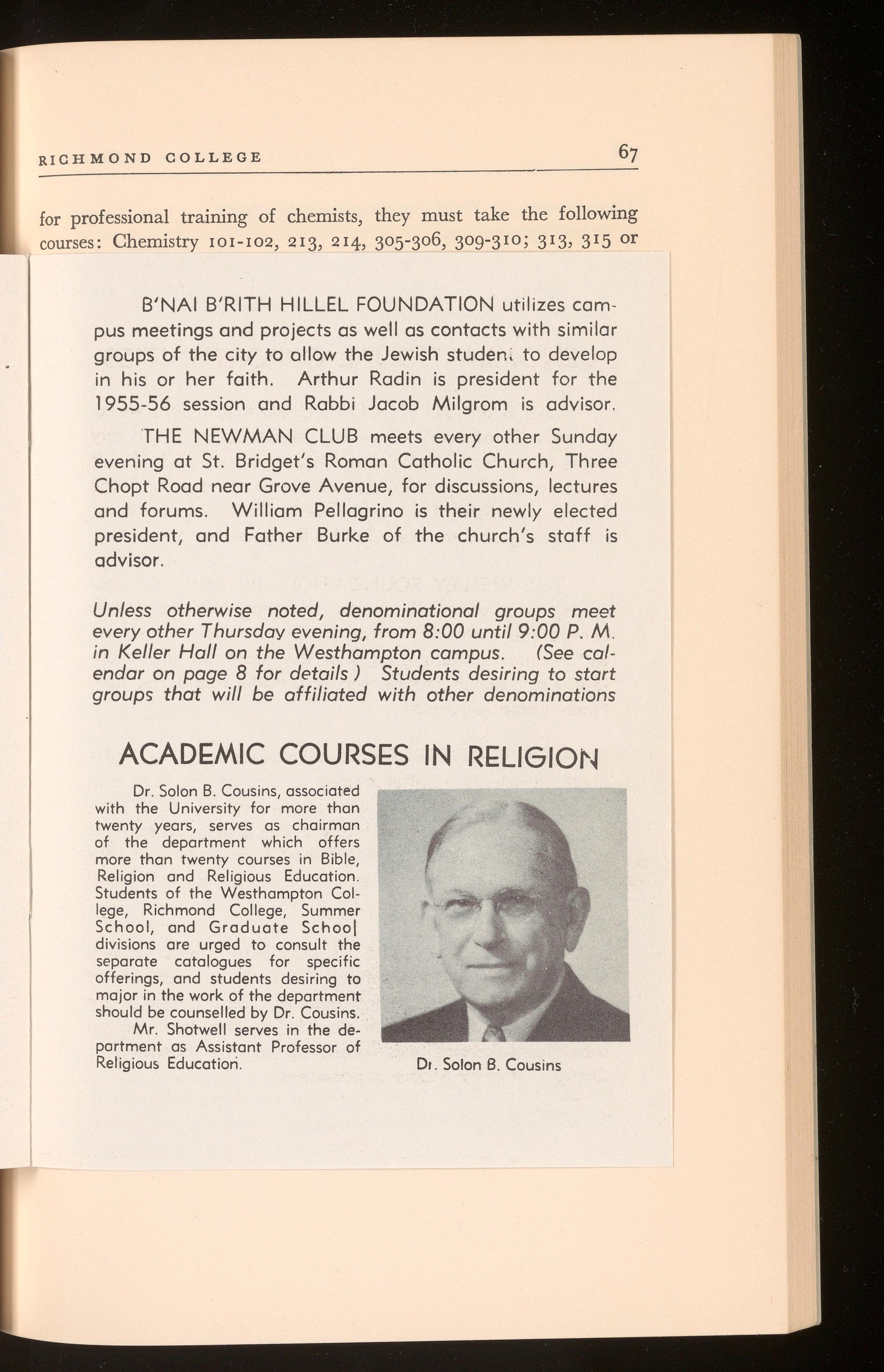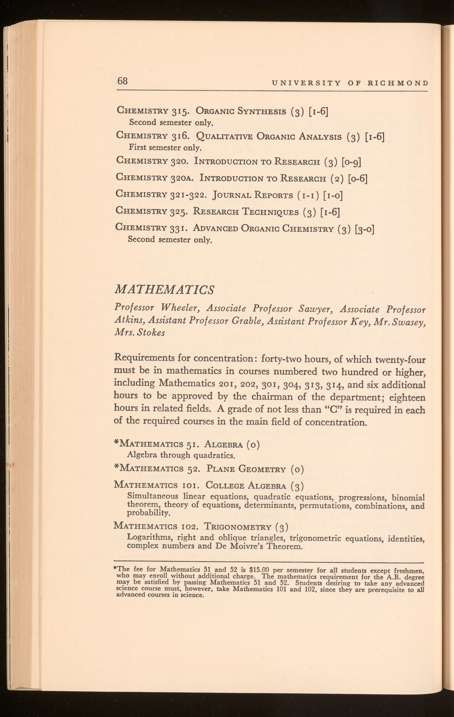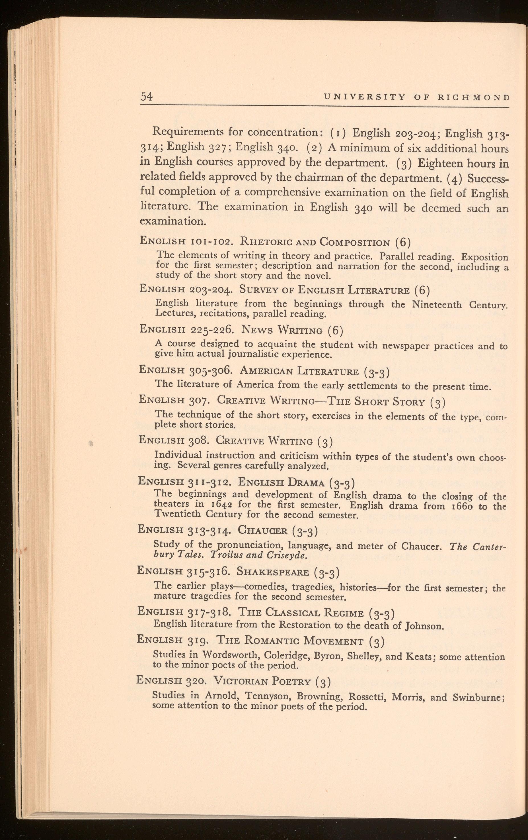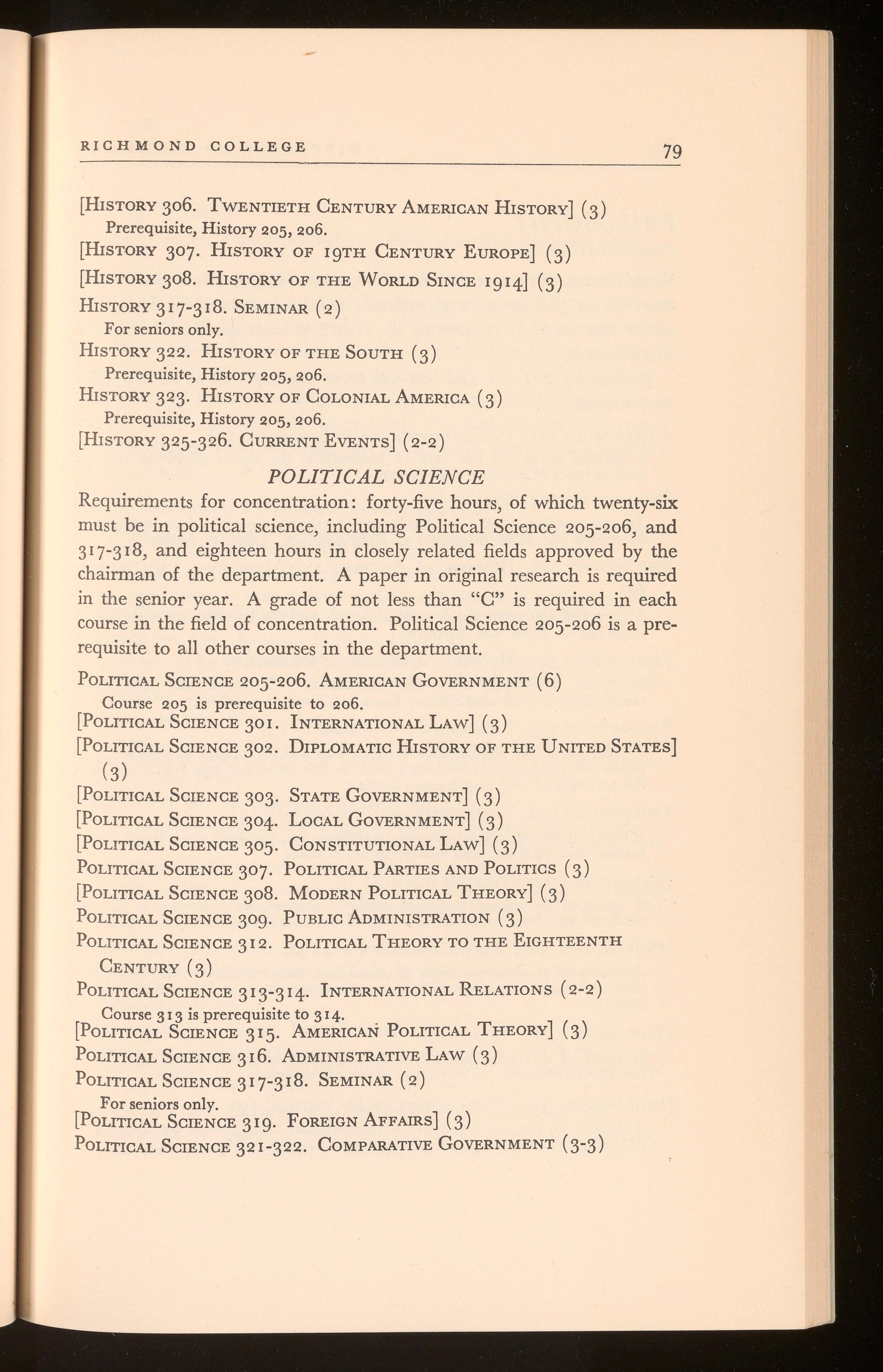 The School of Business Administration is designed to serve both full-time and part-time students. Full-time students who desire to work for the degree of Bachelor of Science in Business Administration are eligible to enter the Business School upon the completion of sixty hours of work (including six in principles of economics or its equivalent) with sixty quality credits. This preliminary work in liberal arts courses can be taken at Richmond College or any other accredited school.