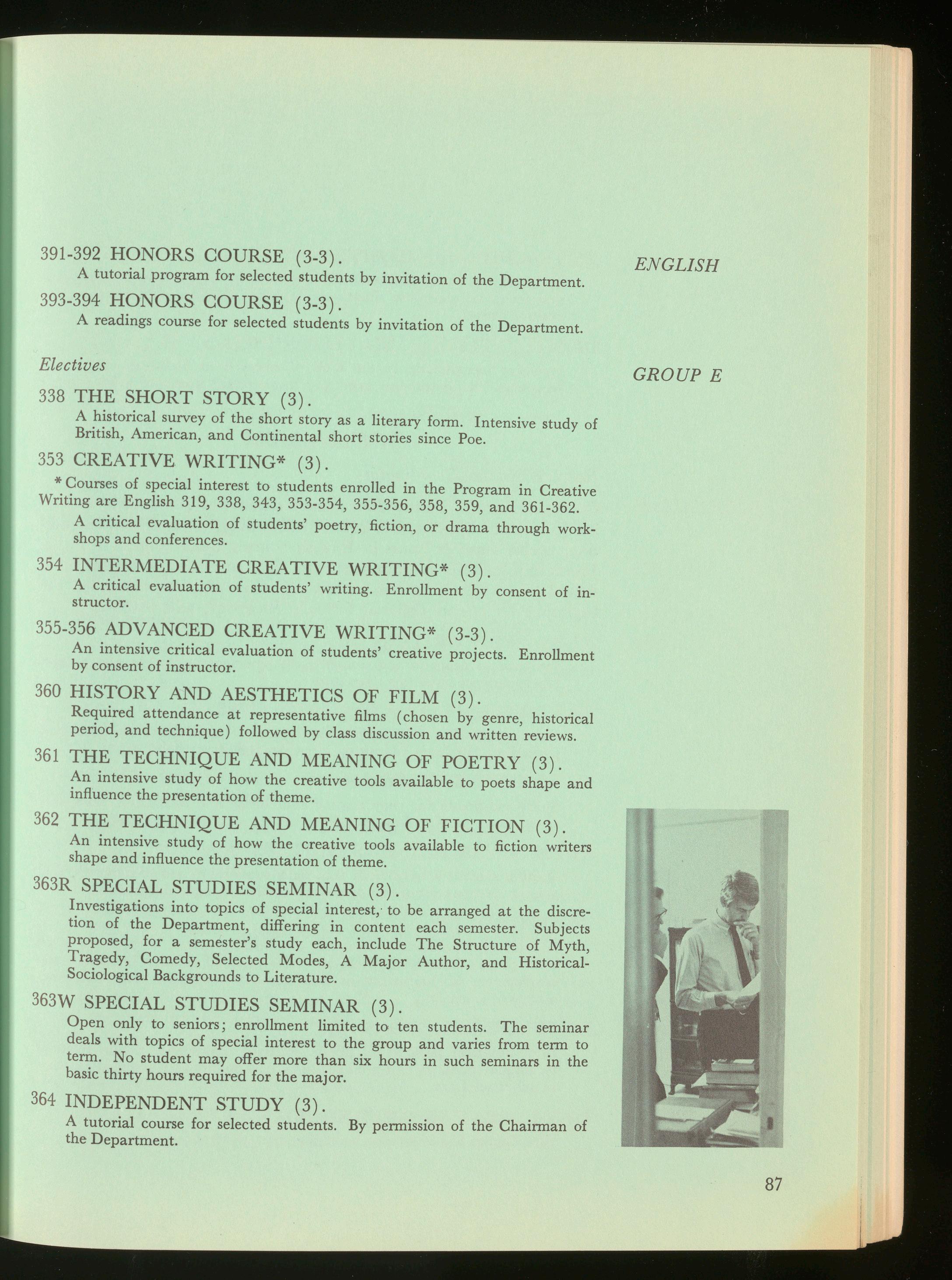 Distinctive programs include interdisciplinary studies, the Honors Program, and Colloquia for Freshmen. A new area curriculum enables the student to select courses from a wide variety of offerings .