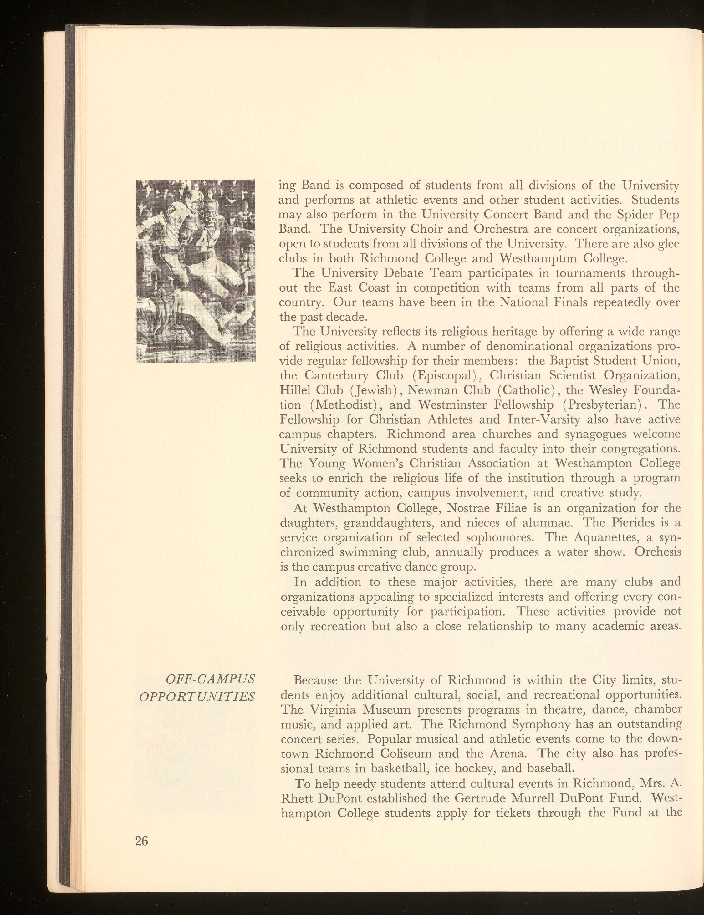University of Richmond students join in numerous extracurricular activities: student government, publications, radio station, dramatic productions, choir, glee club, band and orchestra, debate, campus forums, dances, fraternities, intramural and intercollegiate sports, and denominational religious groups.