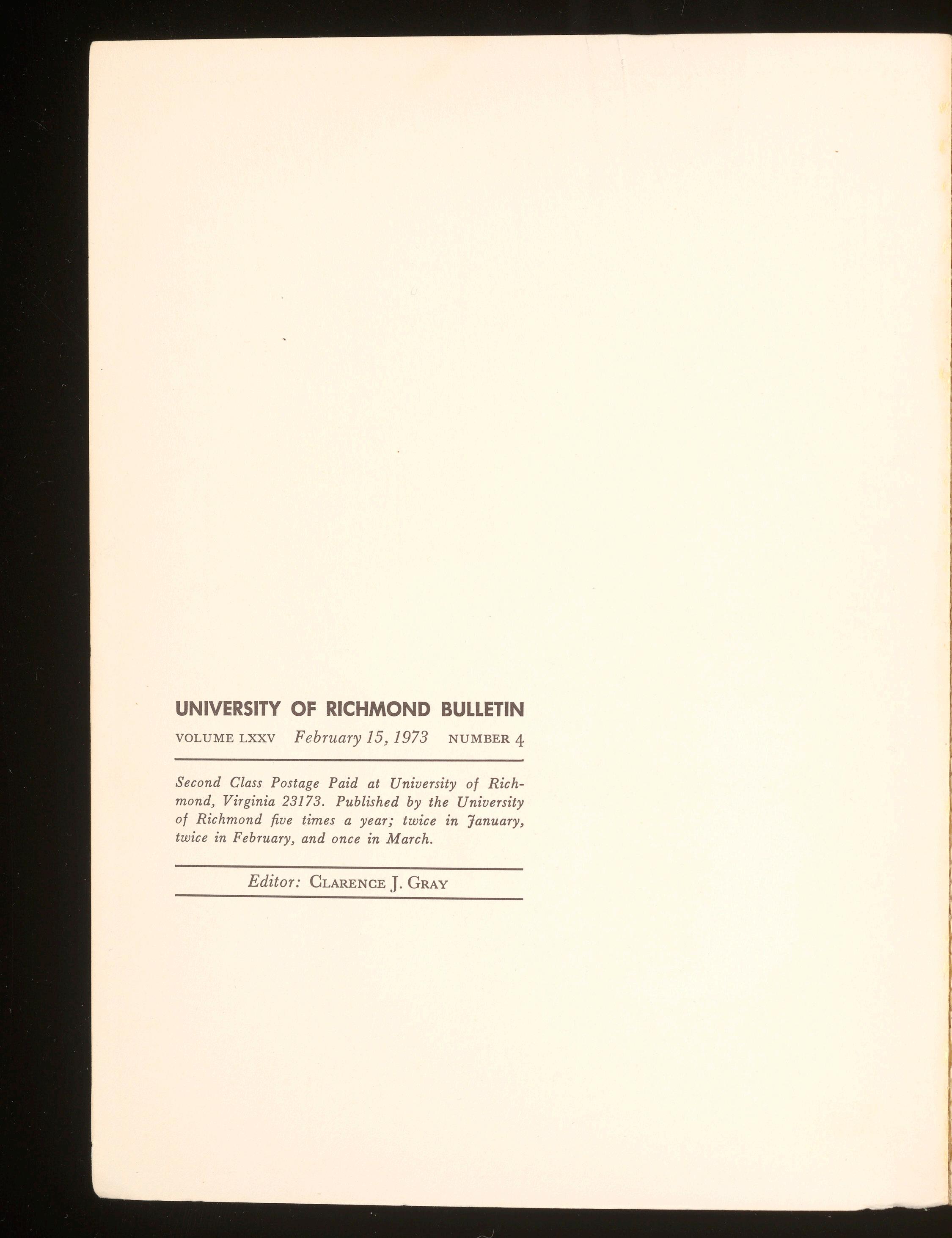 Second Class Postage Paid at University of Richmond, Virginia 23173. Published by the University of Richmond five times a year; twice in 'January, twice in February, and once in March.