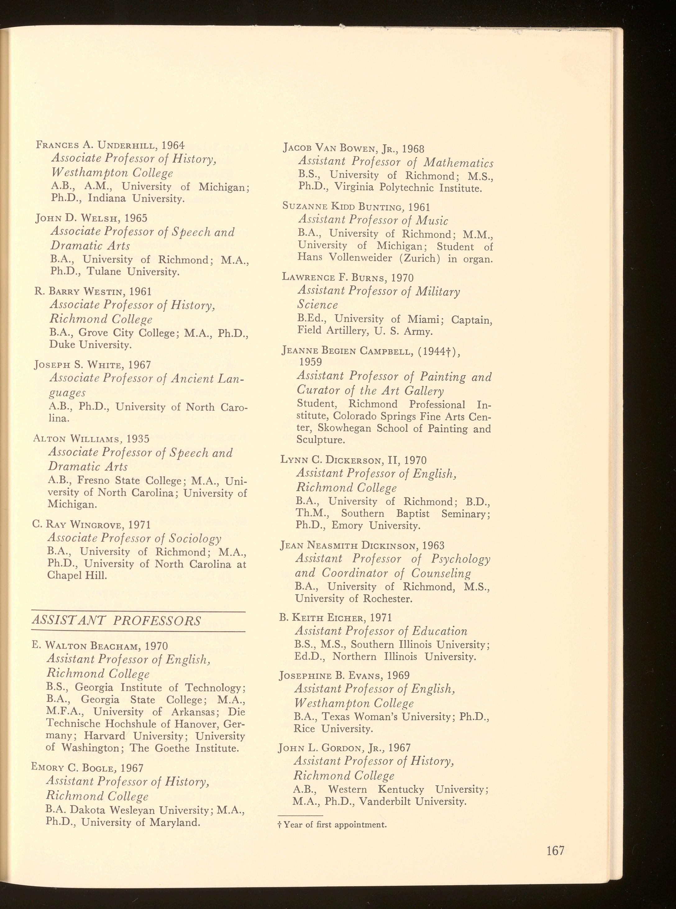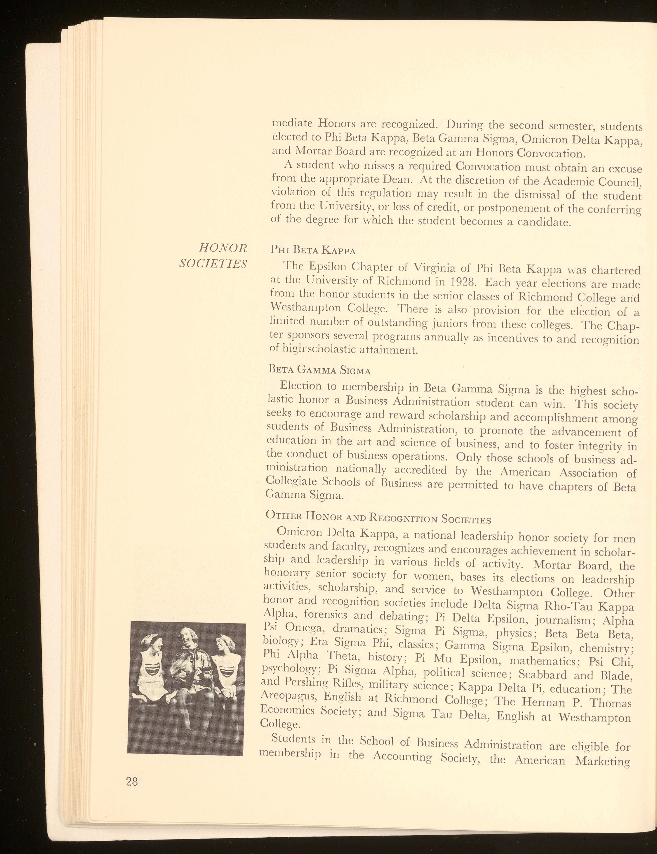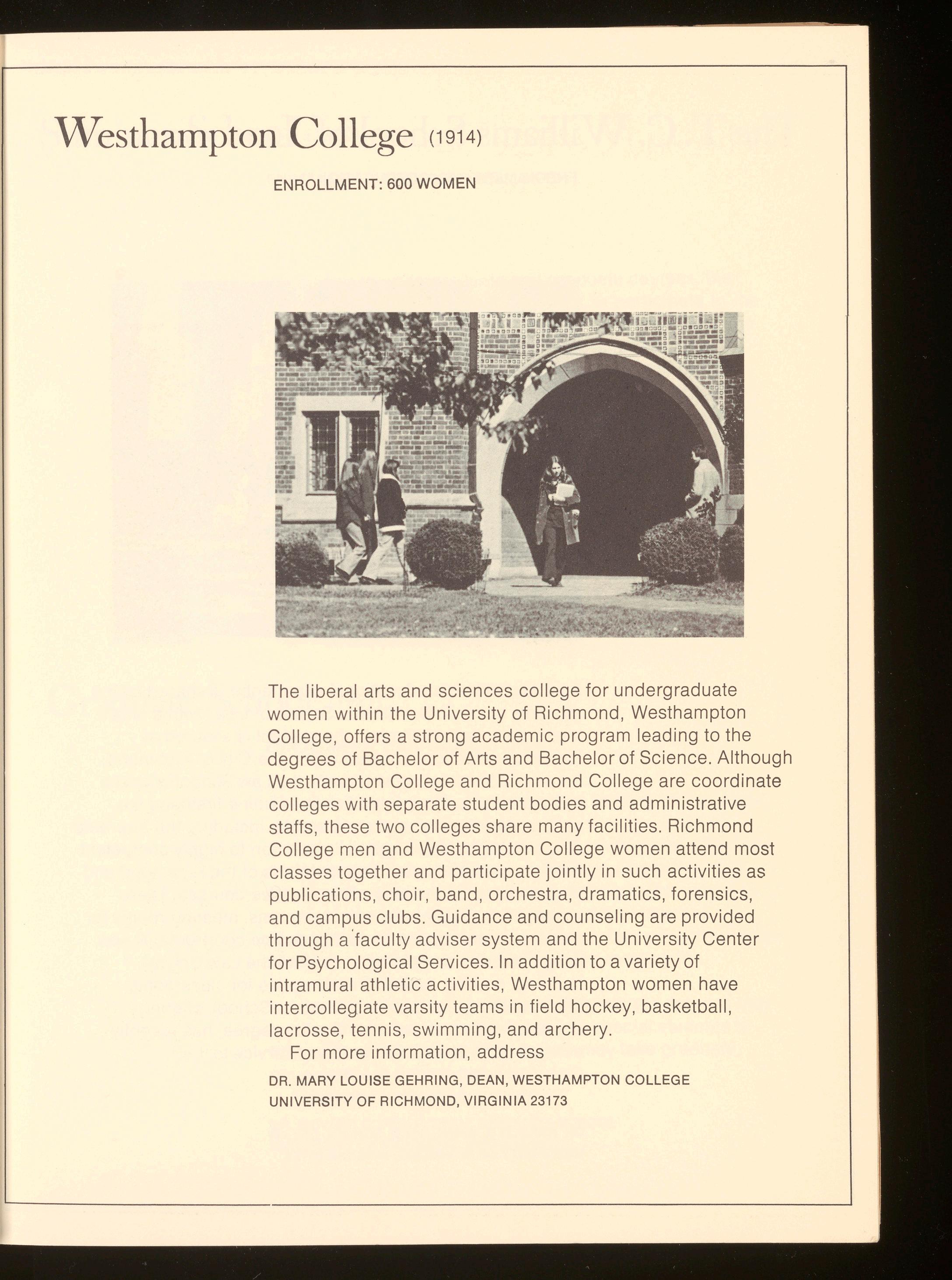 The liberal arts and sciences college for undergraduate women within the University of Richmond, Westhampton College, offers a strong academic program leading to the degrees of Bachelor of Arts and Bachelor of Science Although Westhampton College and Richmond College are coordinate colleges with separate student bodies and administrative staffs , these two colleges share many facilities. Richmond College men and Westhampton College women attend most classes together and participate jointly in such activities as publications, choir , band, orchestra, dramatics, forensics, and campus clubs Guidance and counseling are provided through a ·faculty adviser system and the University Center for Psychological Services In addition to a variety of intramural athletic activities , Westhampton women have intercollegiate varsity teams in field hockey, basketball, lacrosse , tennis , swimming, and archery.