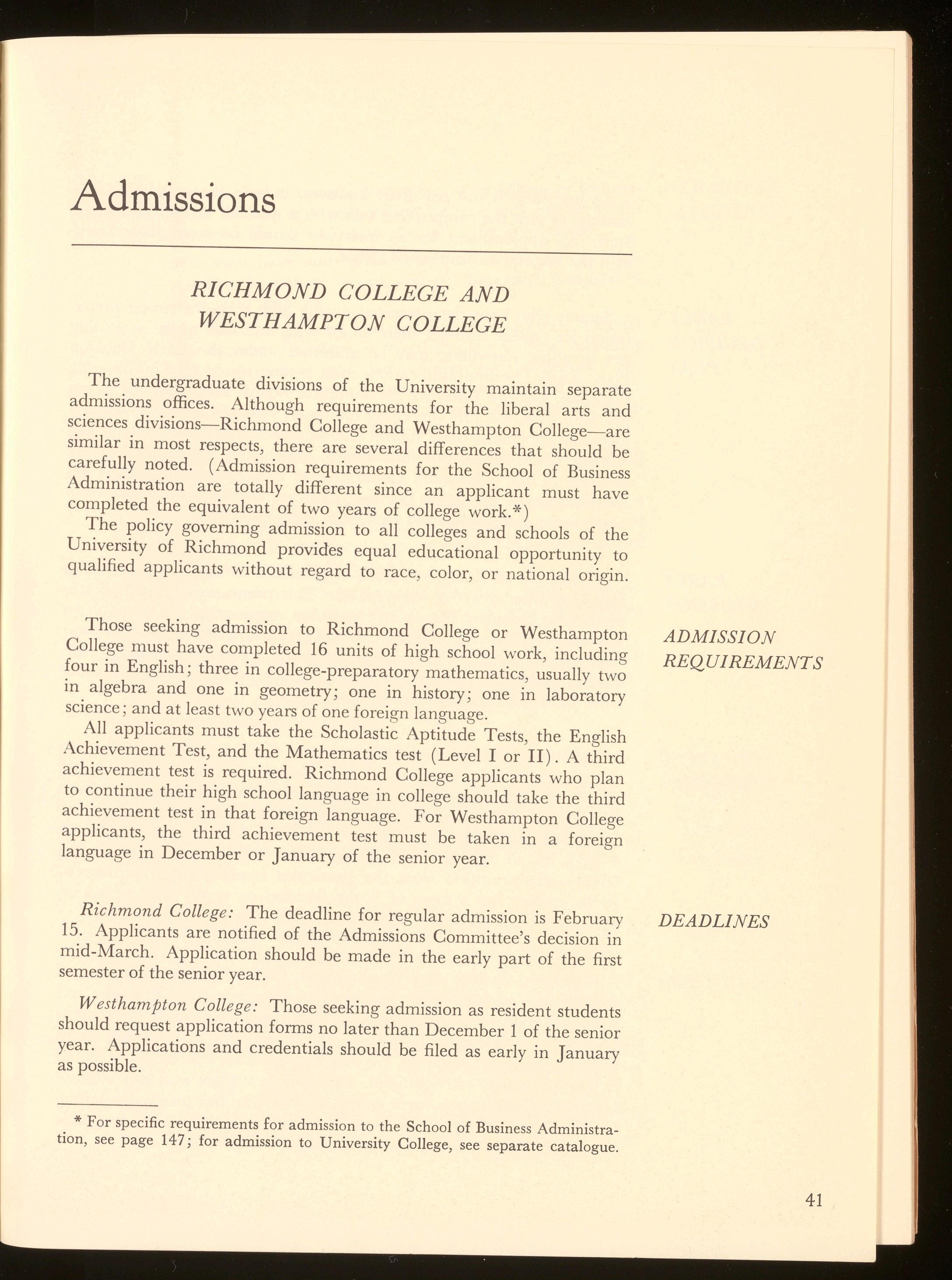 The coordinate structure of the University's seven colleges and schools offers the advantages of a coeducational campus along with the benefits of small, separately administered colleges. Six of the seven coordinate divisions are located on the main campus: Richmond College, for undergraduate men; Westhampton College, for undergraduate women; the School of Business Administration; the Graduate School; the T. C. Williams School of Law; and the Summer School. University College, offering both day and evening classes, is located in the heart of downtown Richmond. Each college has its own dean, faculty and students, but contributes to the entire University