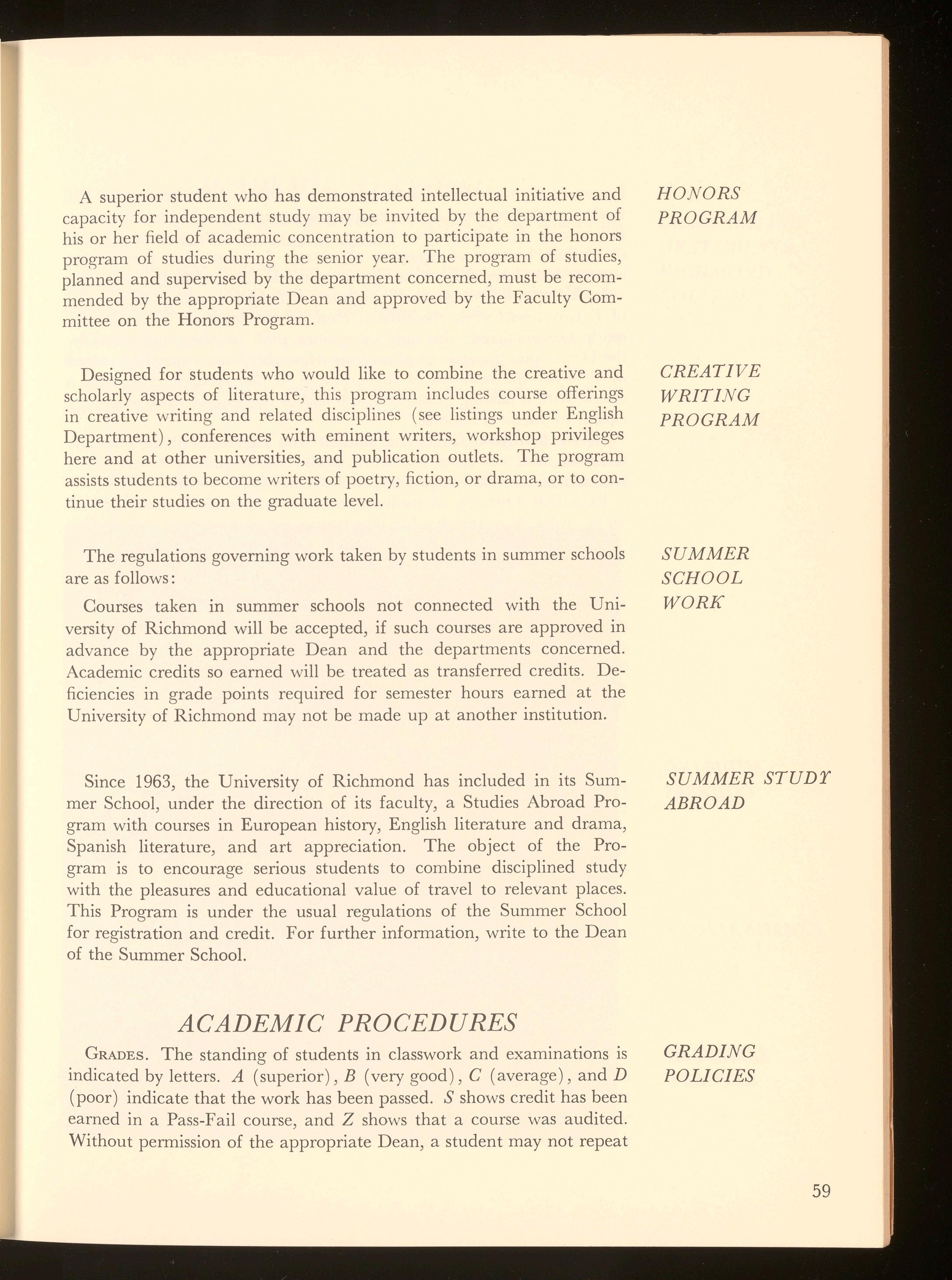In addition to undergraduate and graduate courses, the Summer School affords opportunities to participate in the Study Abroad Program, pre-professional courses, law, the high school junior program, and courses for teaching certificate renewal. Also there are various workshops and institutes. Day classes are held on the main campus of the University of Richmond; evening classes meet at University College in downtown Richmond. The faculty of the Summer School is drawn from the other six divisions of the University as well as from other institutions.