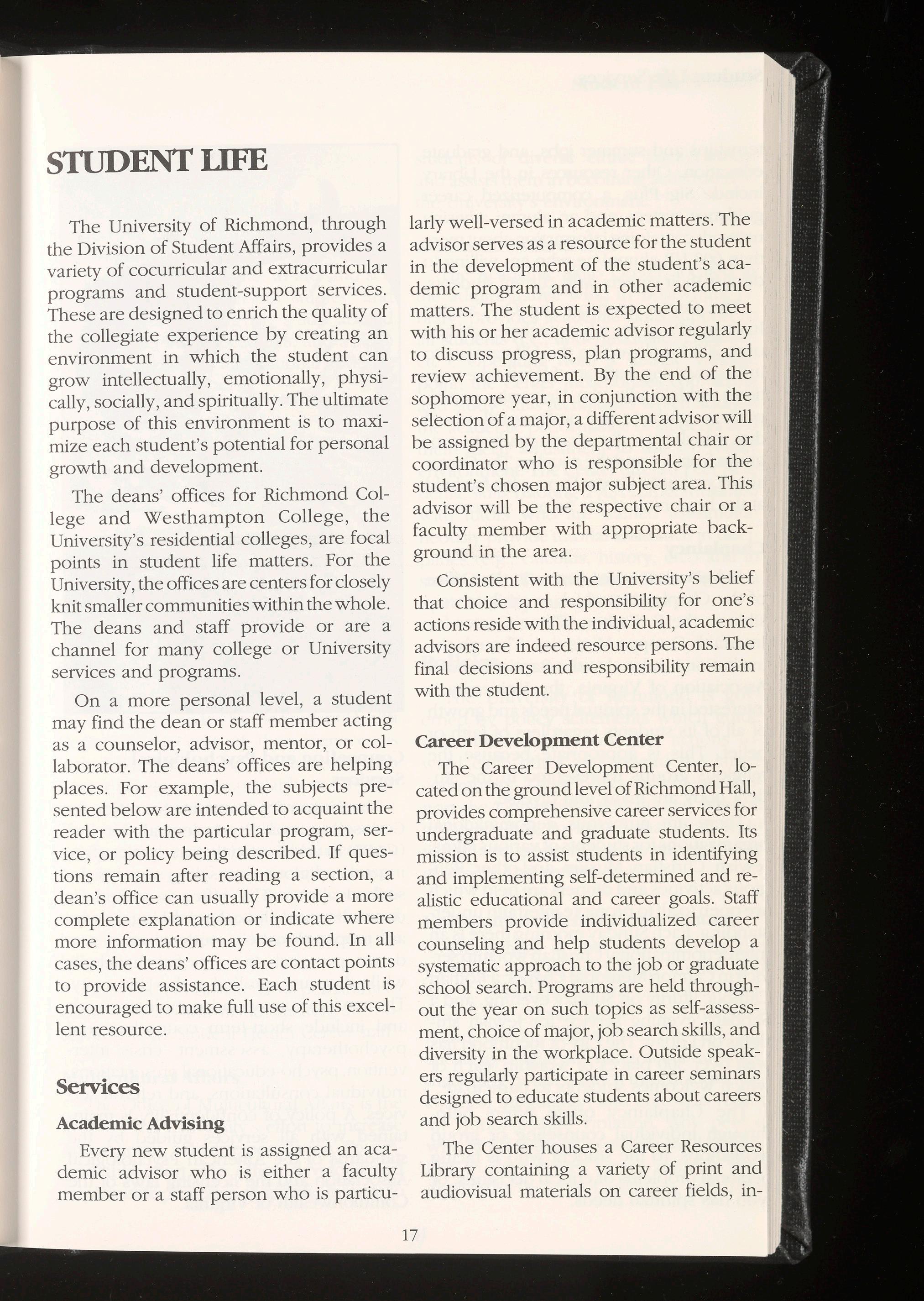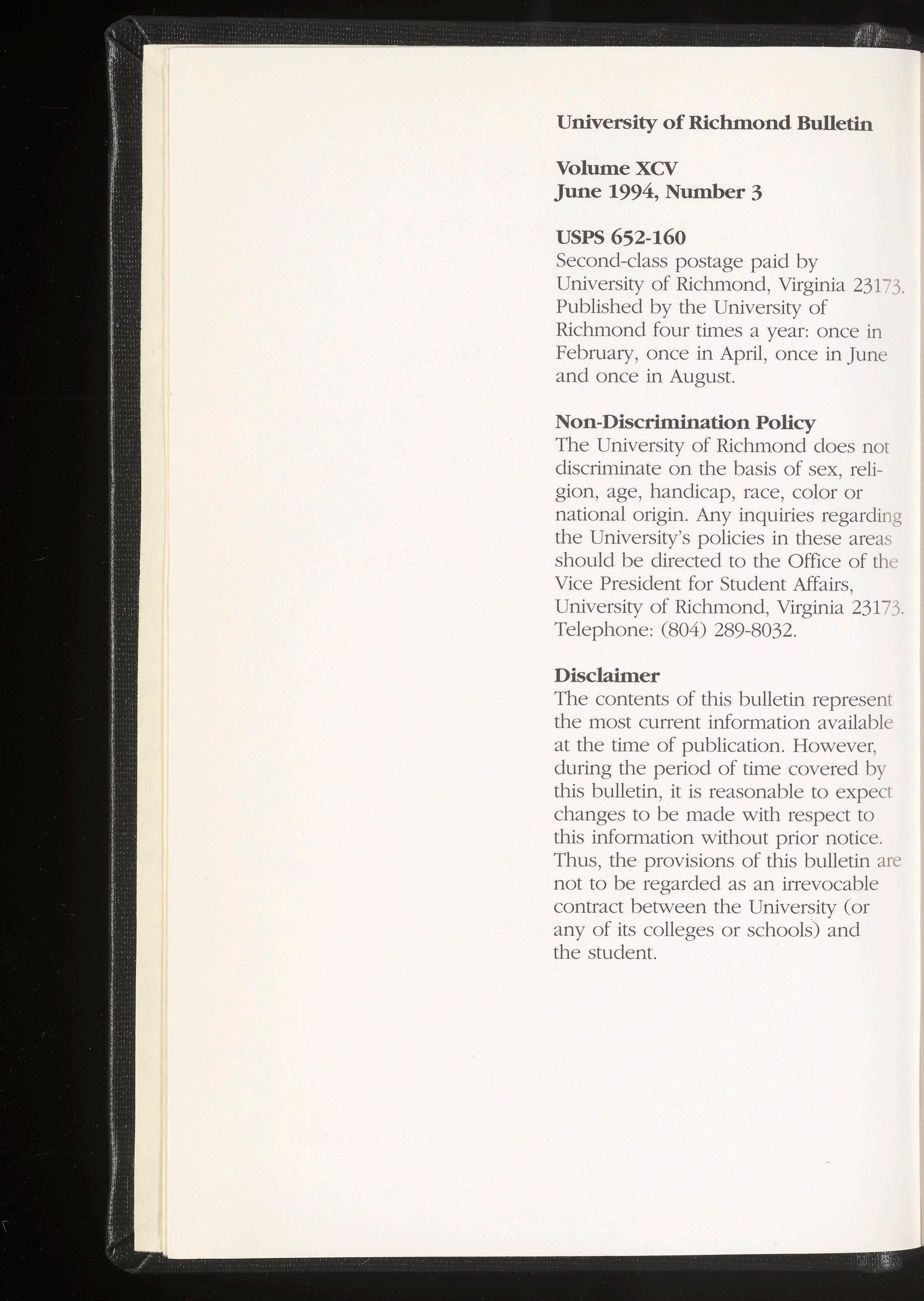 The University of Richmond does n ot discriminate on the basis of sex, religion , age , handicap , race , color or national origin. Any inquiries regard ing the University 's policies in these are as should be directed to the Office of th e Vice President for Student Affairs, University of Richmond , Virginia 23173. Telephone: (804) 289-8032.