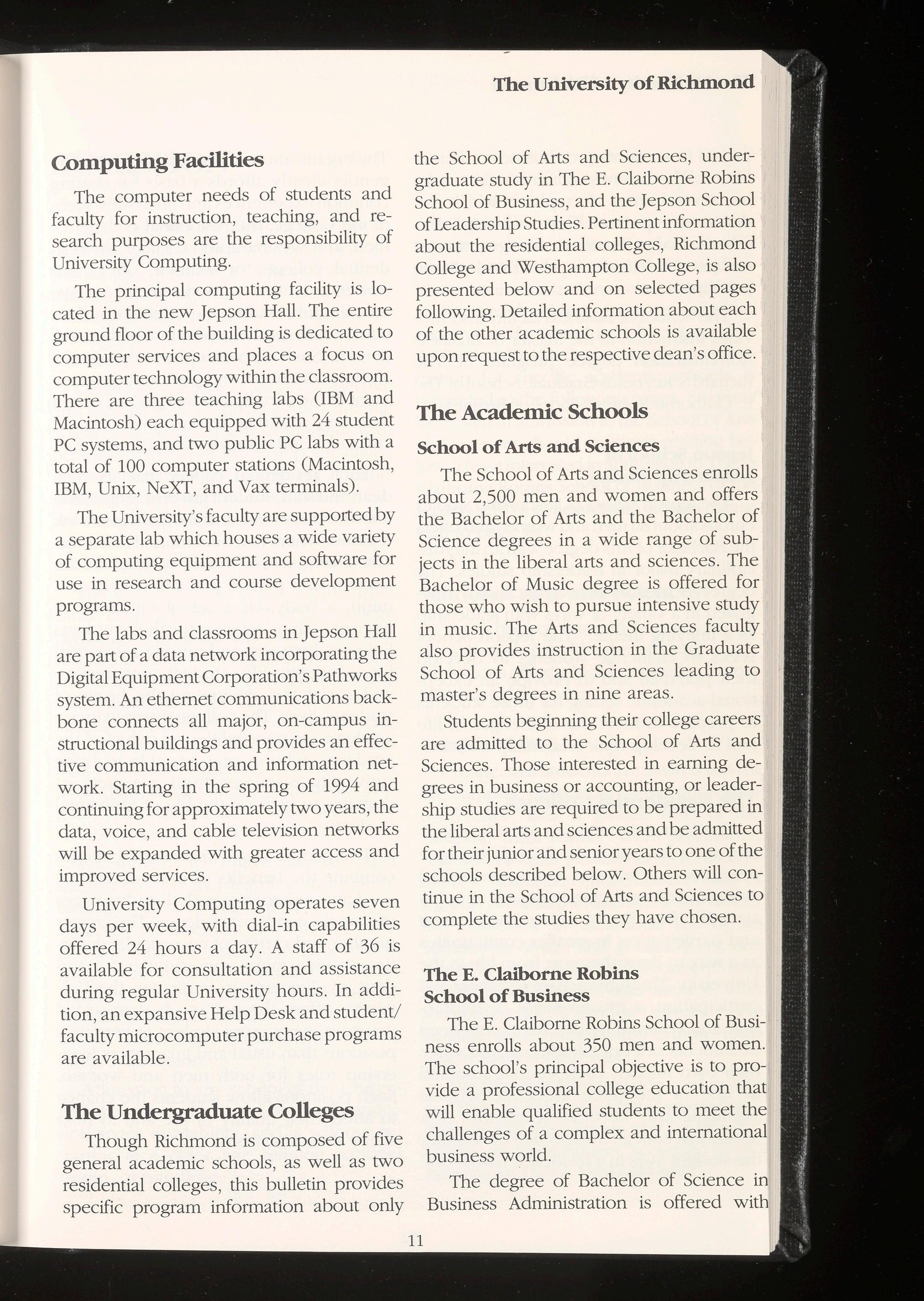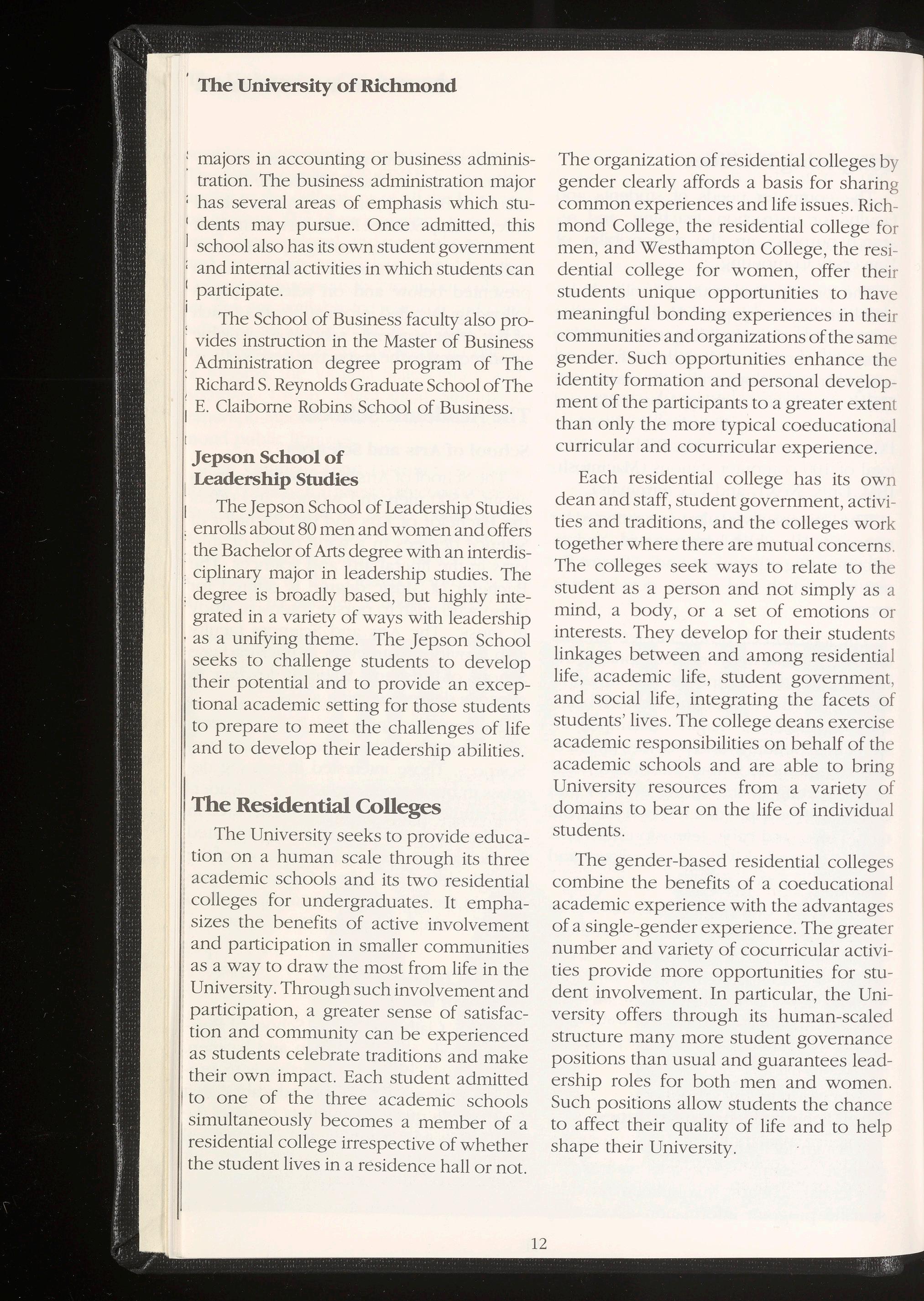 \ graduate university with a law school and several master's degree programs. As one of the 50 or so most selective colleges in the country, we offer comprehensive academic programs for men and women in the areas of liberal arts and sciences, business, leadership studies, and law. The University combines the structure of a university with the intimacy of a college, offering students the best of many worlds. Related to the Baptist General Association of Virginia and dedicated to the development of the whole person, Richmond is committed to serve individuals of all faiths and persuasions, without regard to race, sex, age, physical handicap, or national origin.